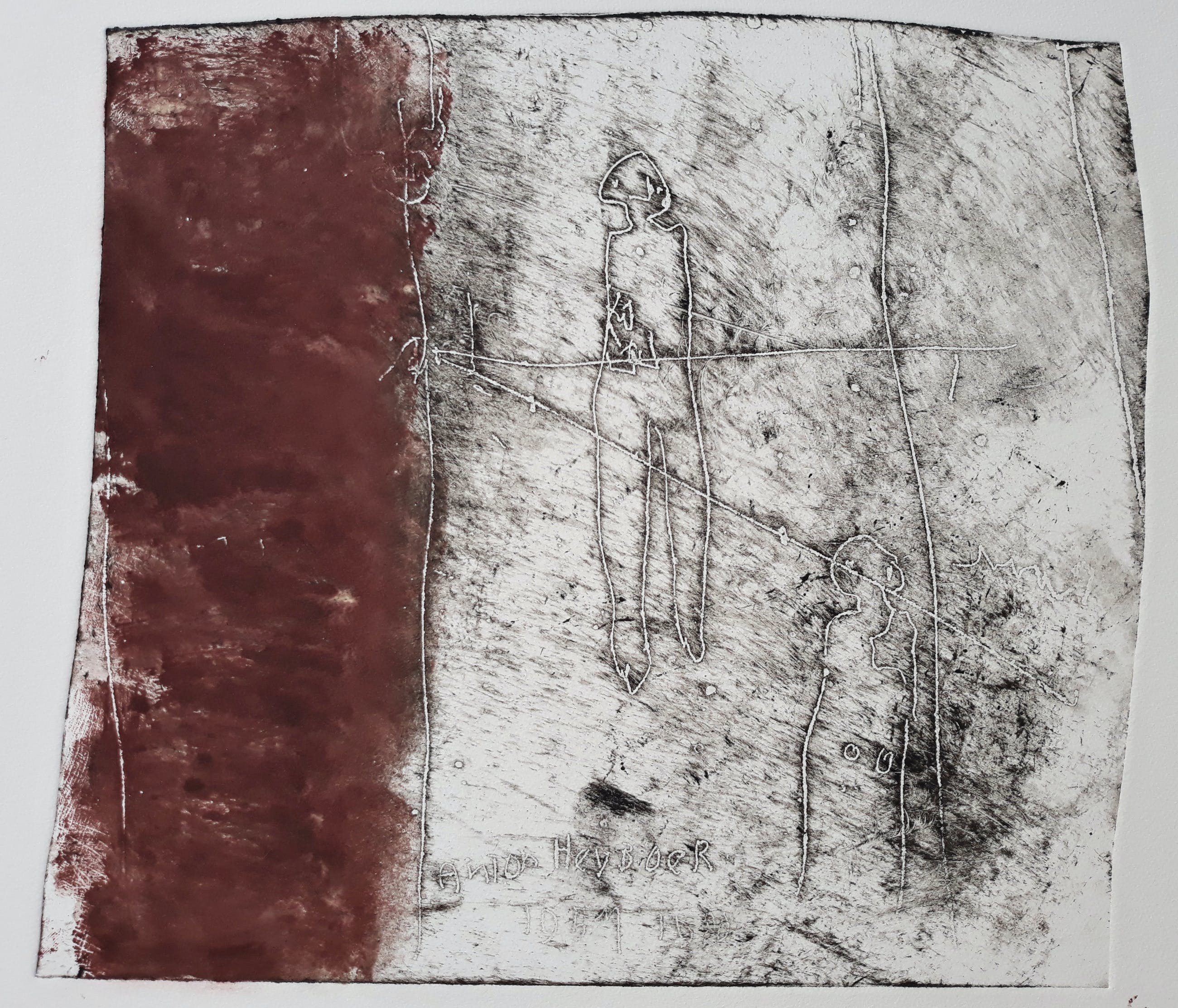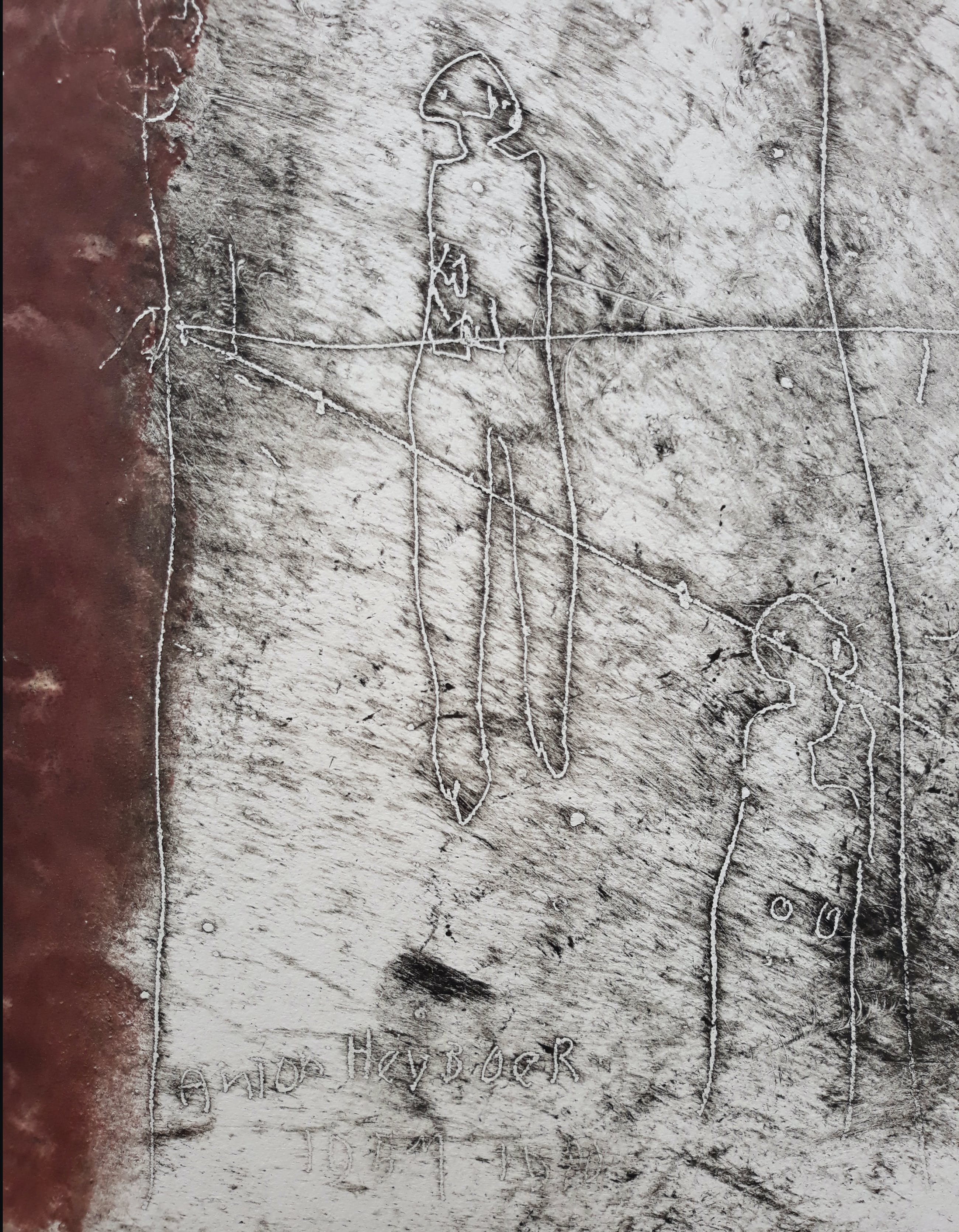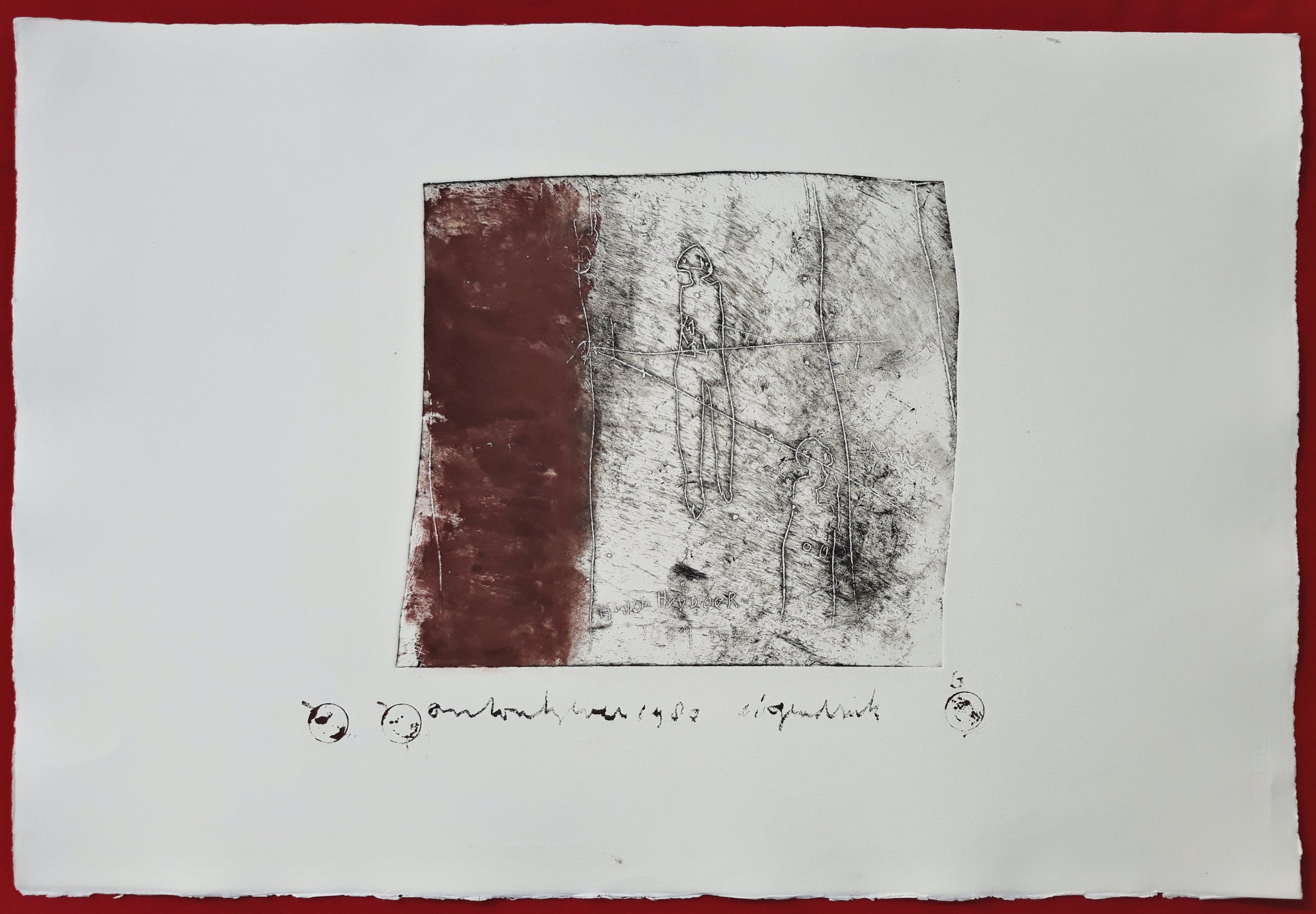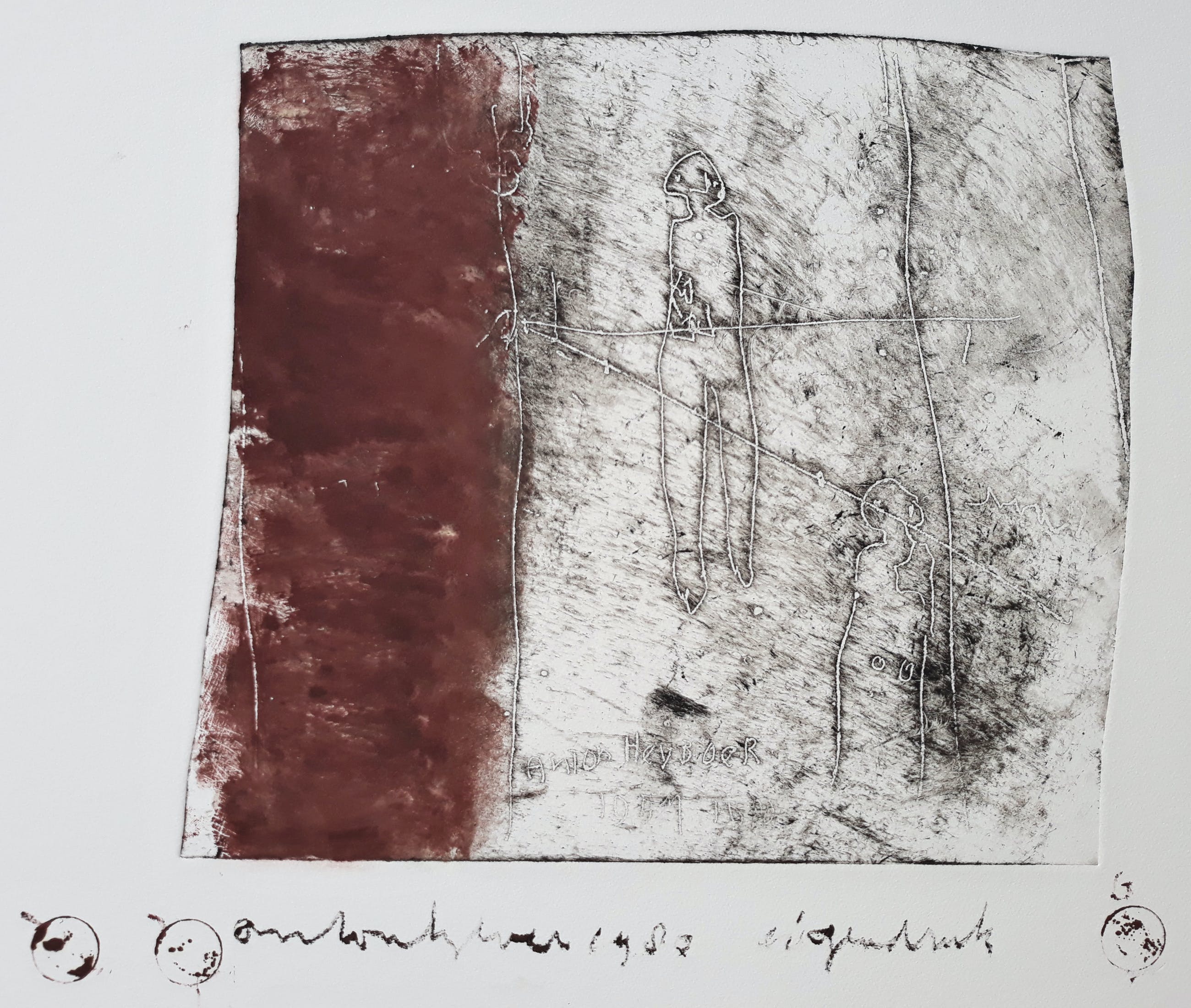 Karakteristiek werk van Anton Heyboer. Ets gedrukt met inkt en rode menie op Hahnemühle papier, handgesigneerd en gedateerd (1980) en met guldenstempels, in de plaat onduidelijk gedateerd (waarschijnlijk “1957-1980”) en nogmaals gesigneerd. In uitstekende conditie. Herkomst: de nalatenschap van Jaap Buitenhuis, één van de beste vrienden van Anton Heyboer.