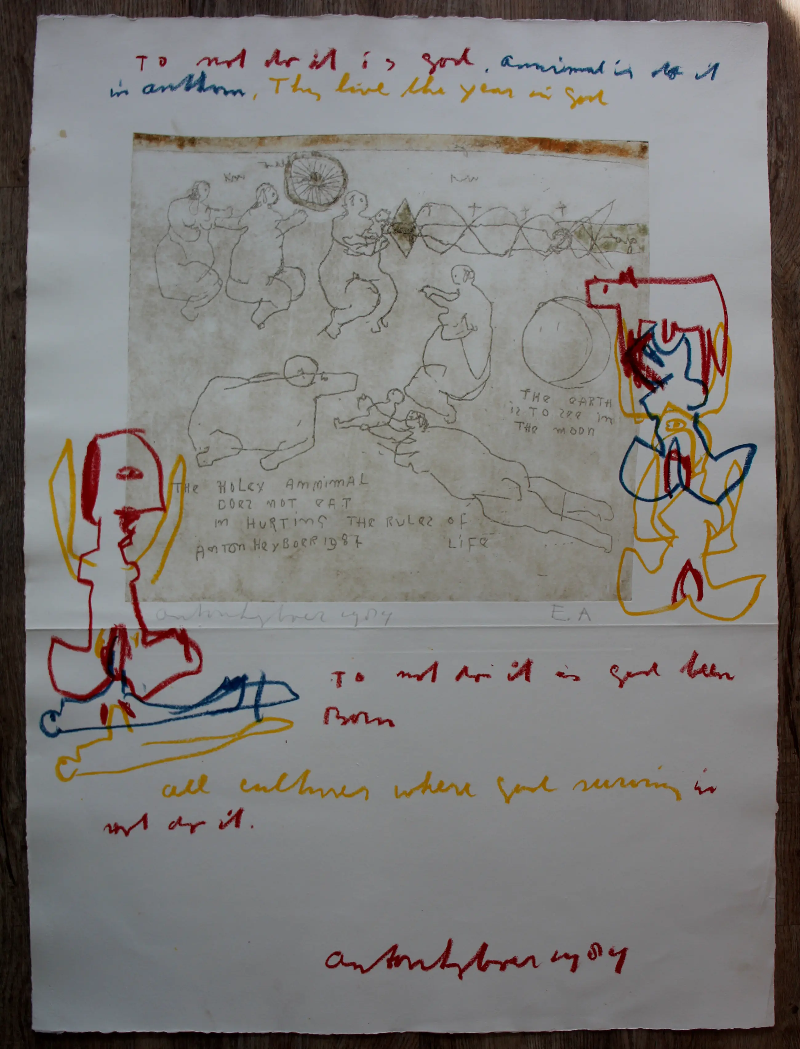 Gemengde techniek(vetkrijt en potloodtekening met ets) van Anton Heijboer. Oplage: E.A. Jaar: 1984. Afmetingen blad: H107 x b78cm. Afmetingen voorstelling: H49 x b52cm. Het werk is links onderaan, met potlood, gesigneerd "Anton Heyboer" in potlood. De authenticiteit van het aangeboden werk wordt volledig gegarandeerd. Een certificaat van echtheid kan, op aanvraag, worden gemaild.
