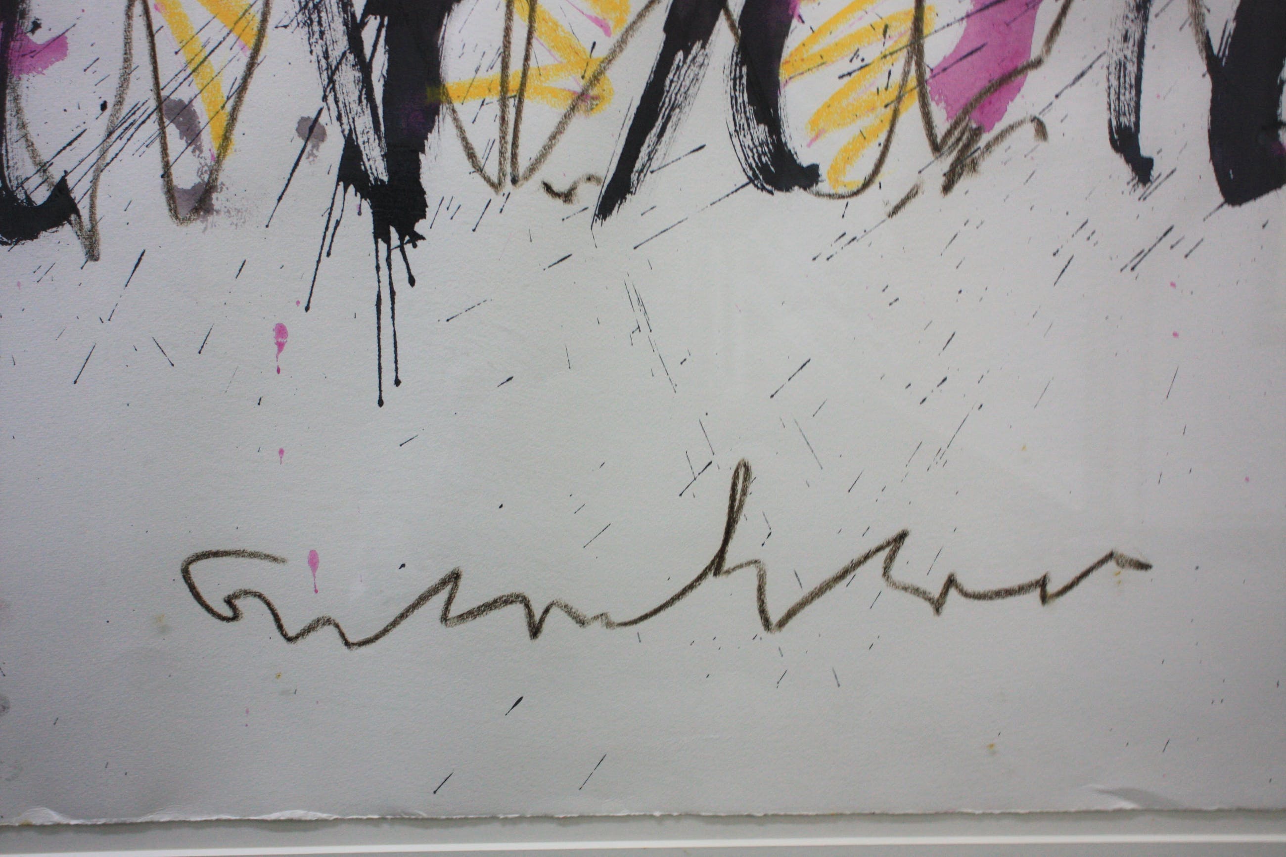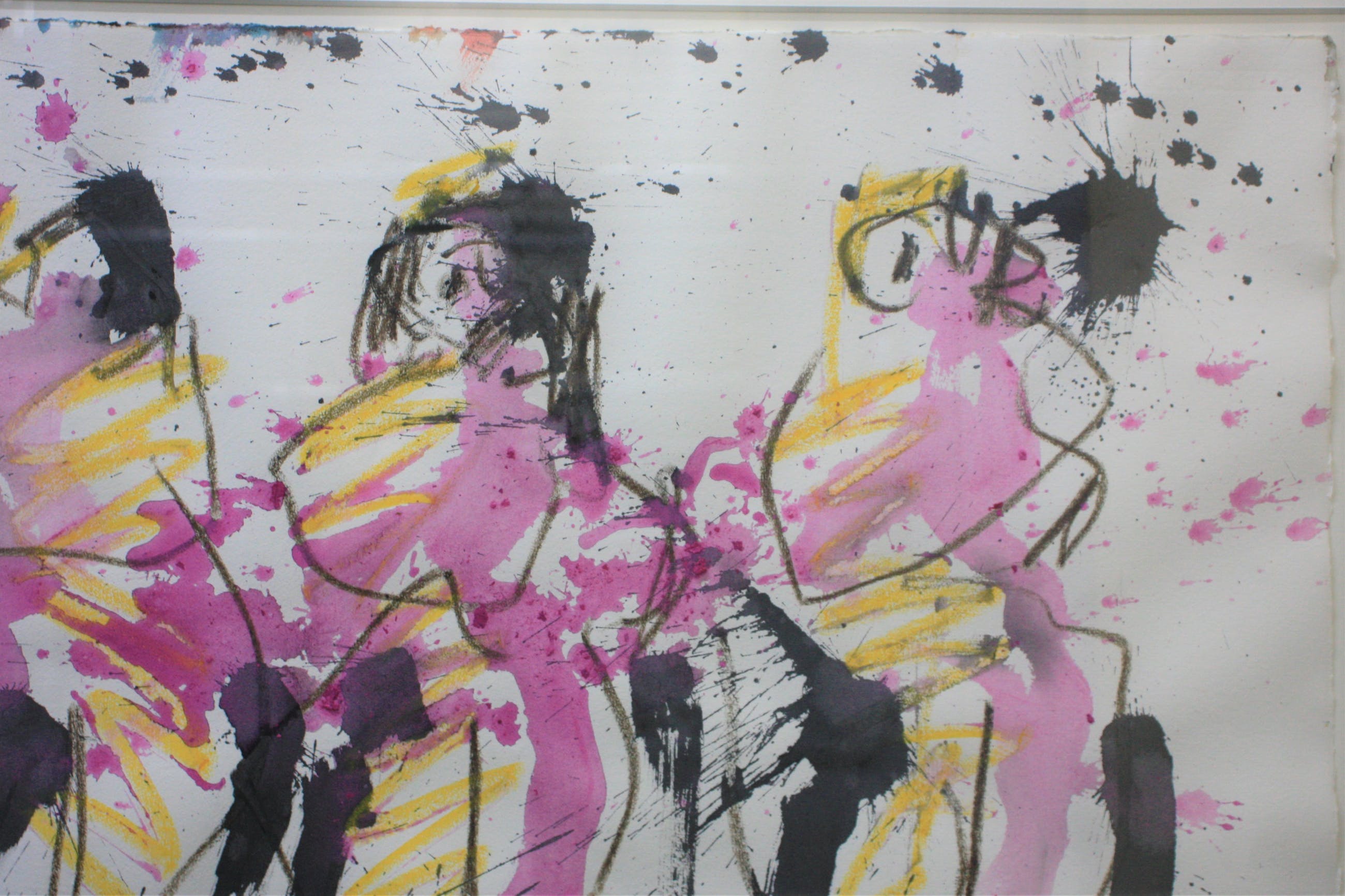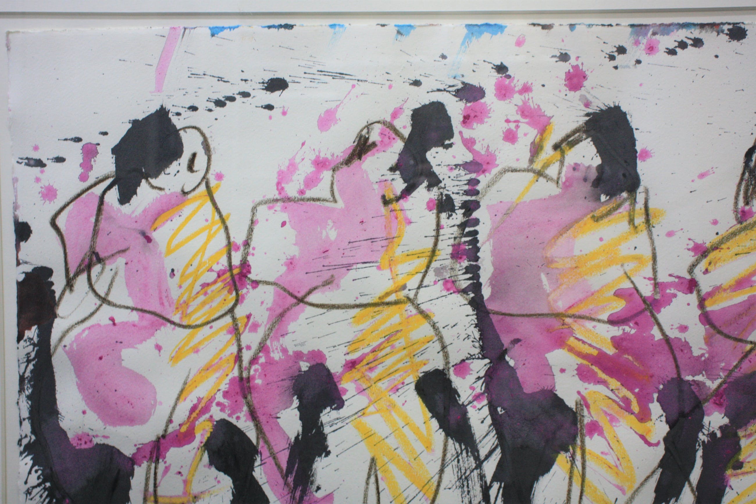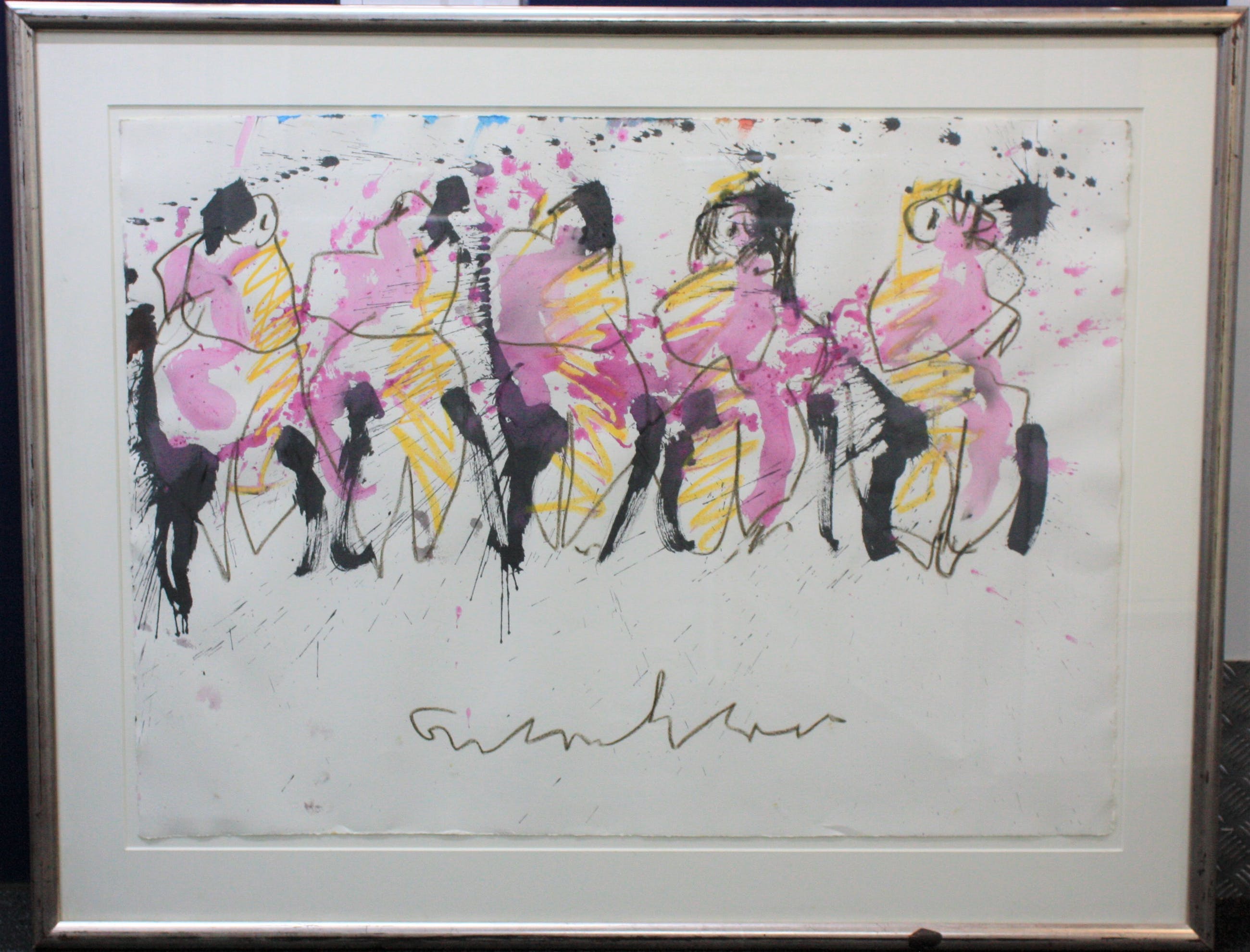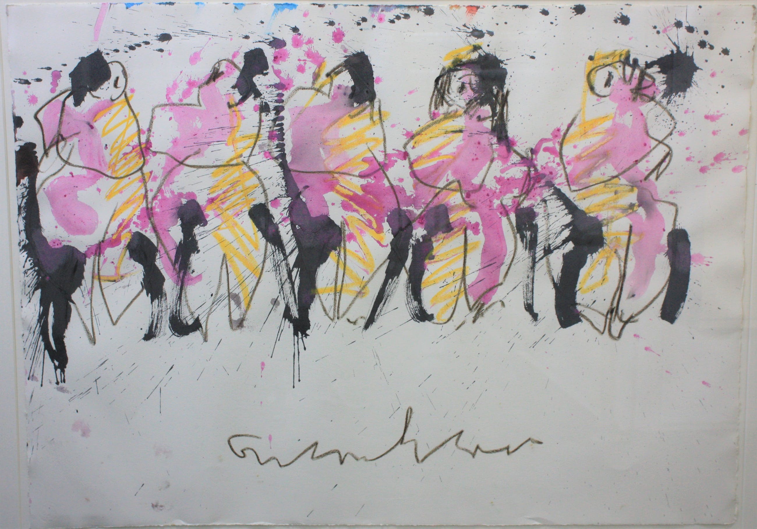 Dit werk is van de Nederlandse kunstenaar Anton Heyboer (1924-2005). Op het papier zijn met gemengde technieken vijf figuren afgebeeld. Het werk is 78,5 x 107,5 (103 x 131 cm inclusief lijst) en onderaan gesigneerd. Het werk is in goede staat en net ingelijst achter plexiglas.