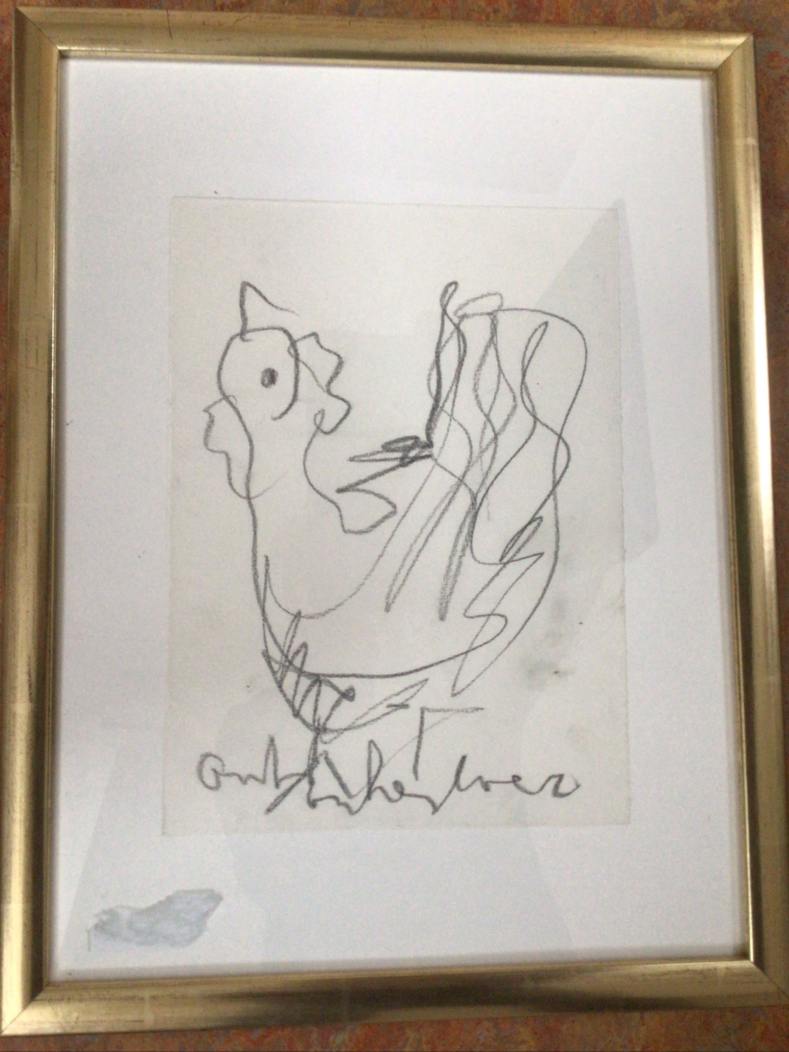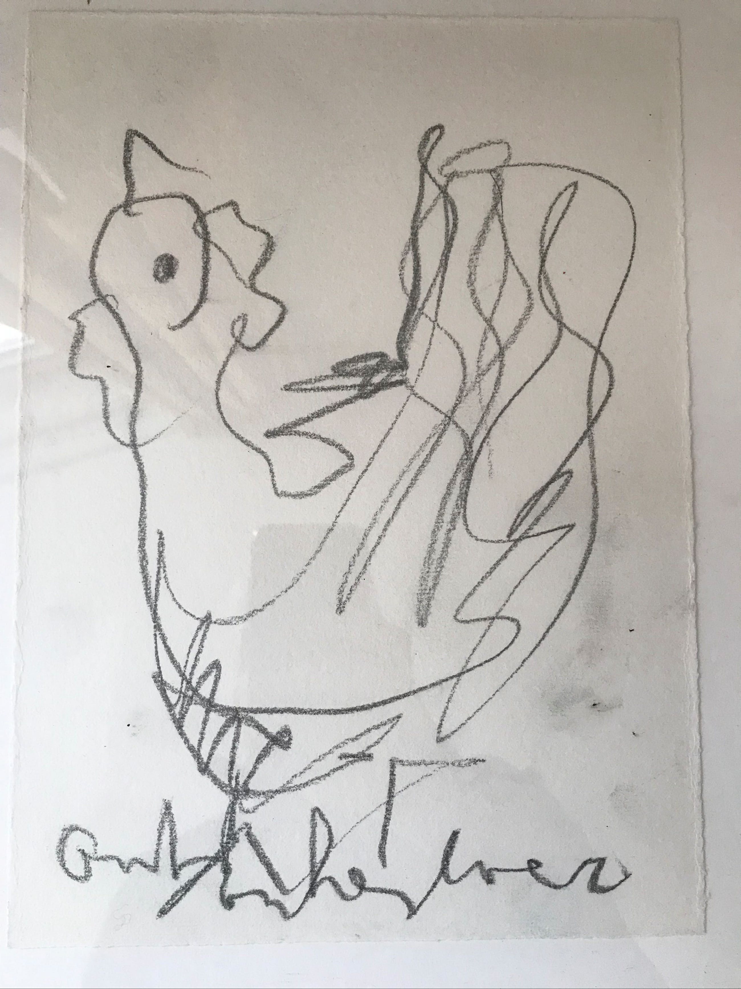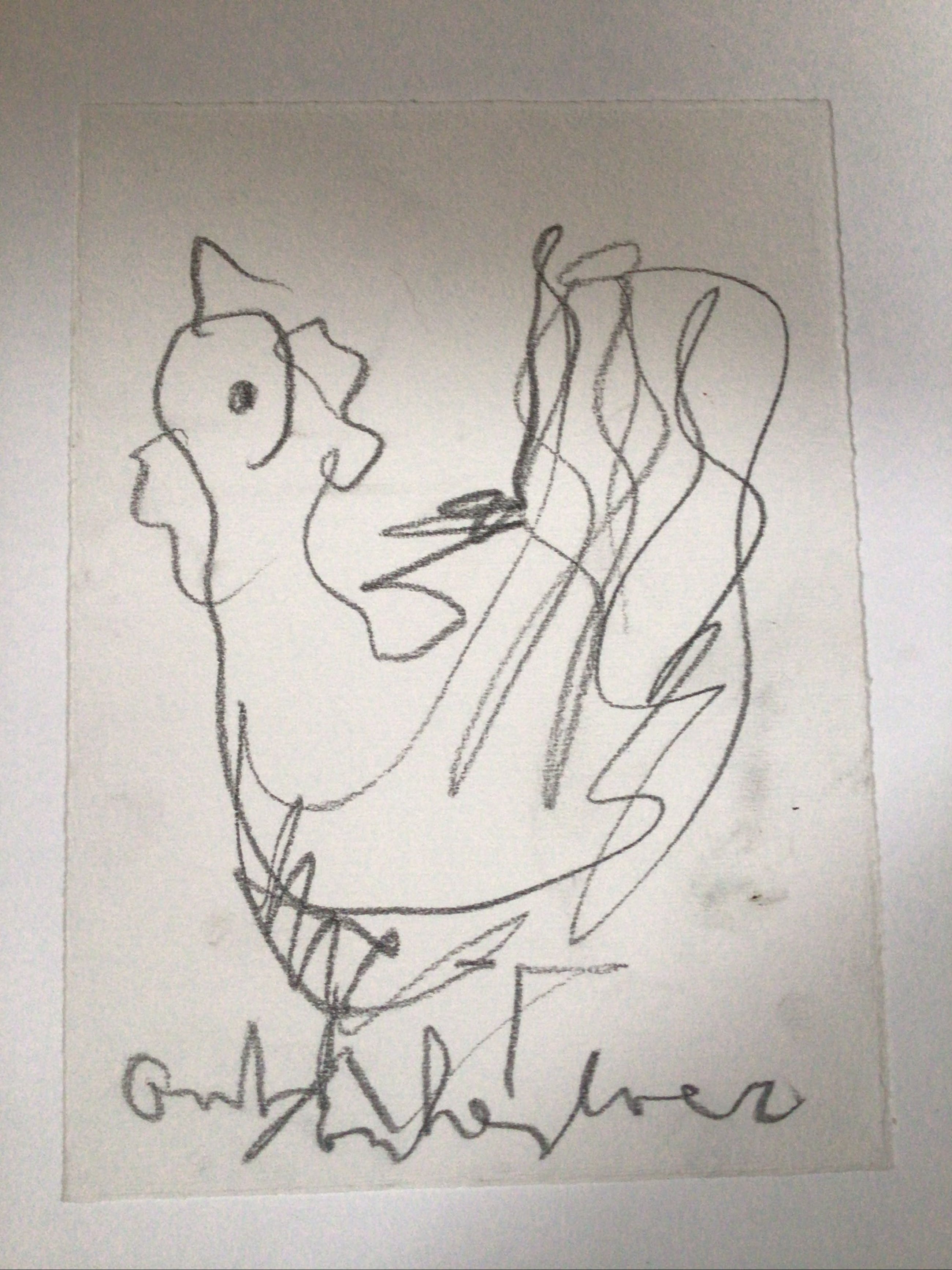 Haantje getekend met houtskool op papier. Ziet er nog mooi uit.