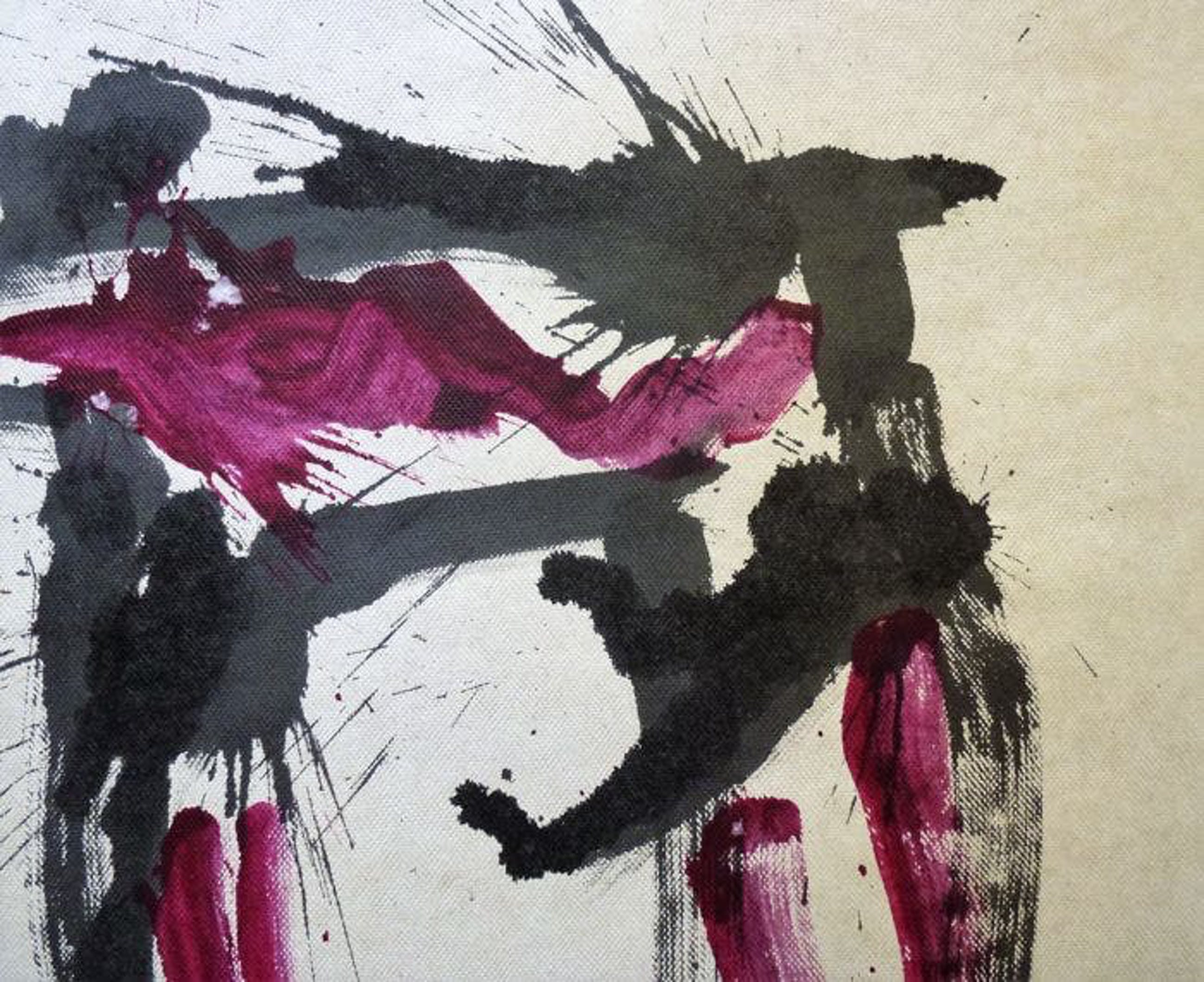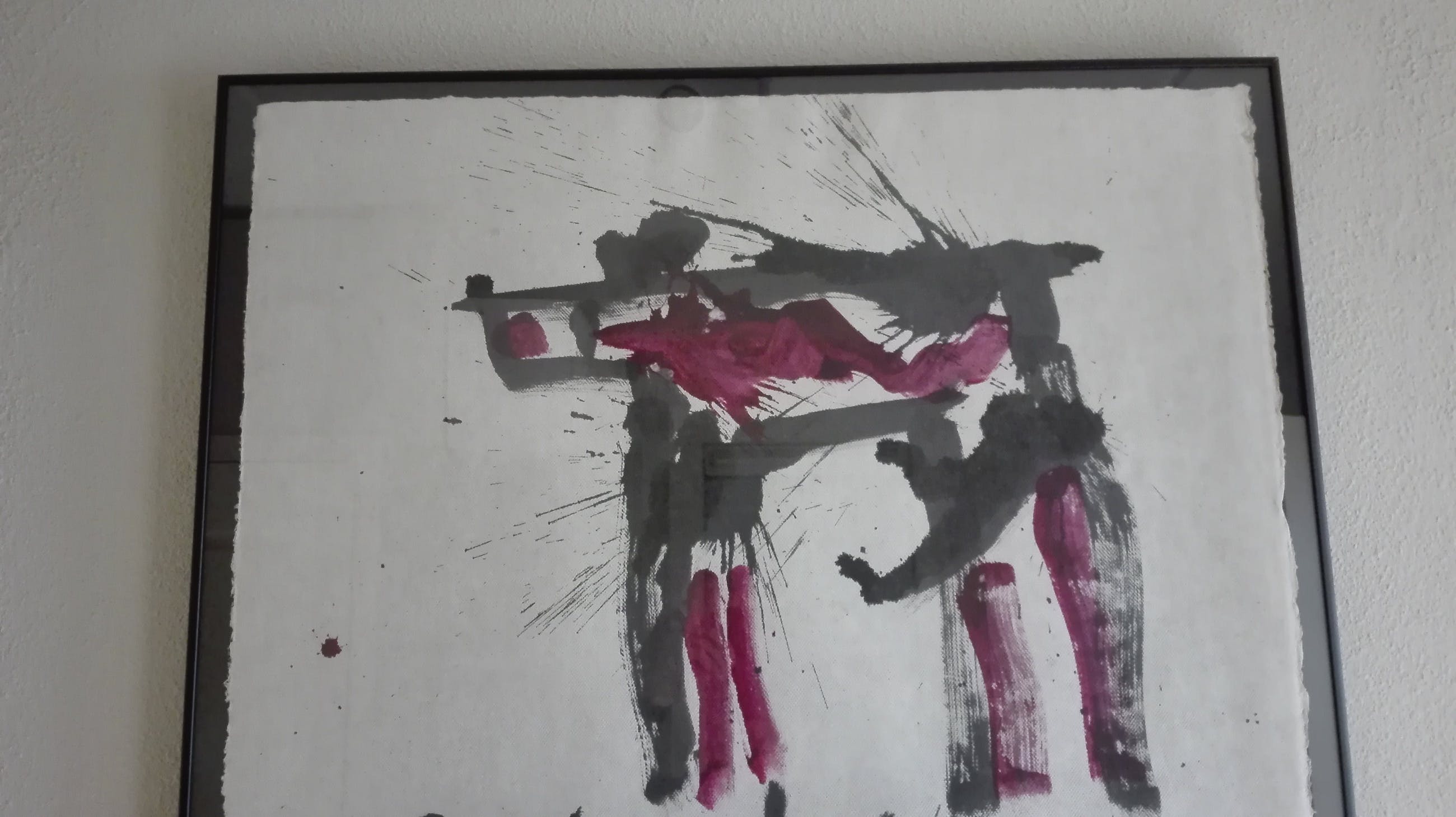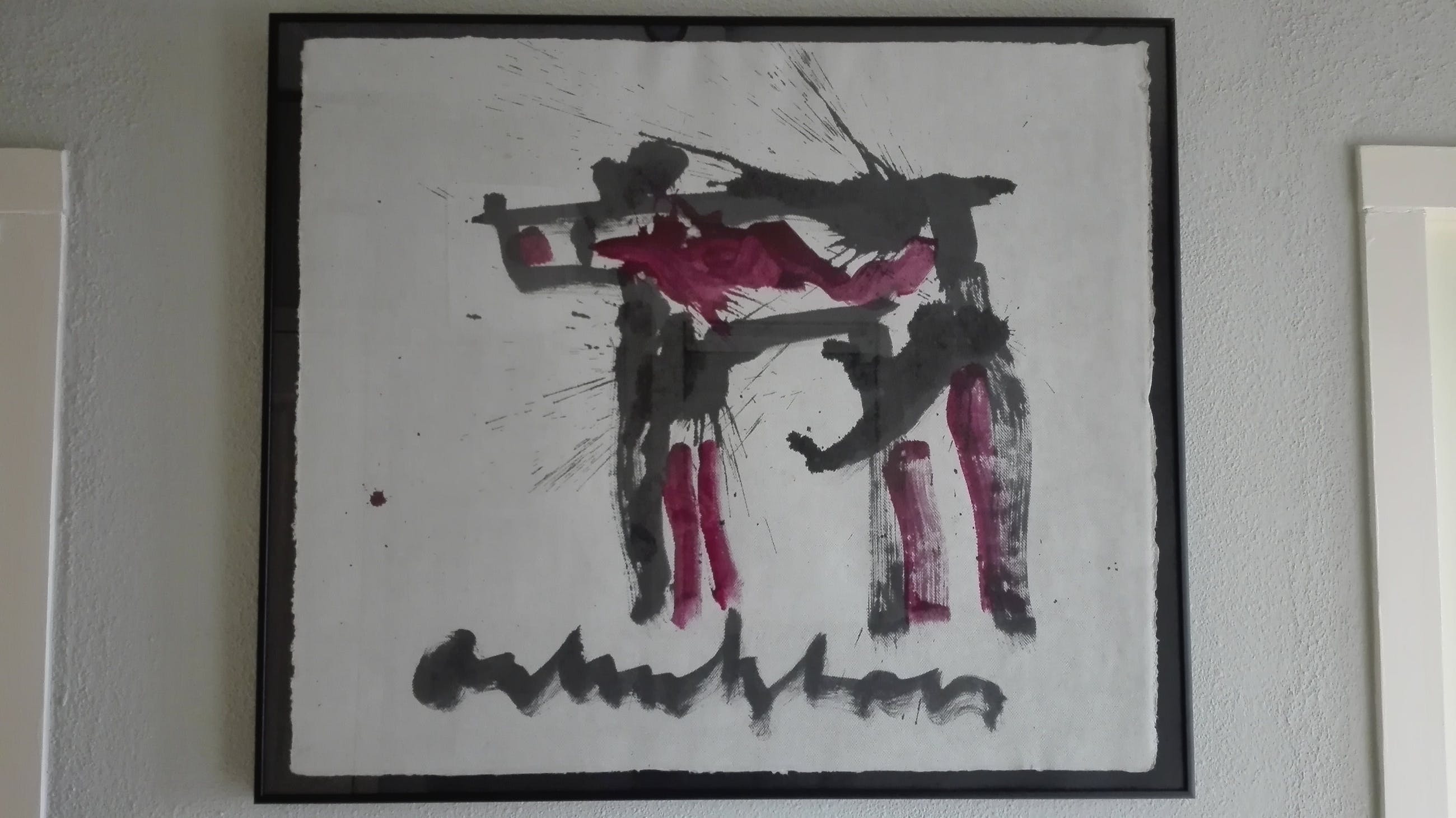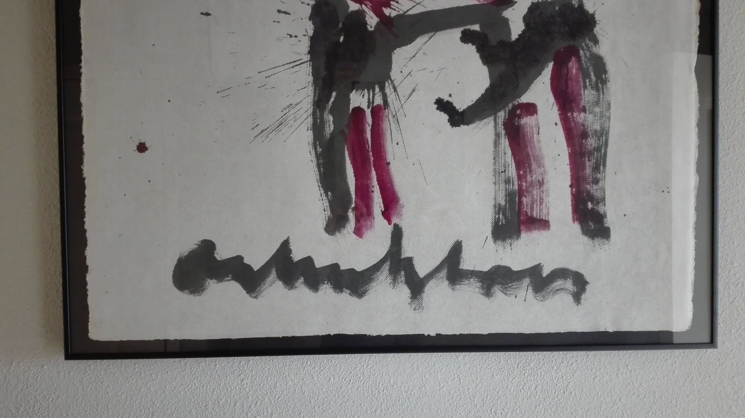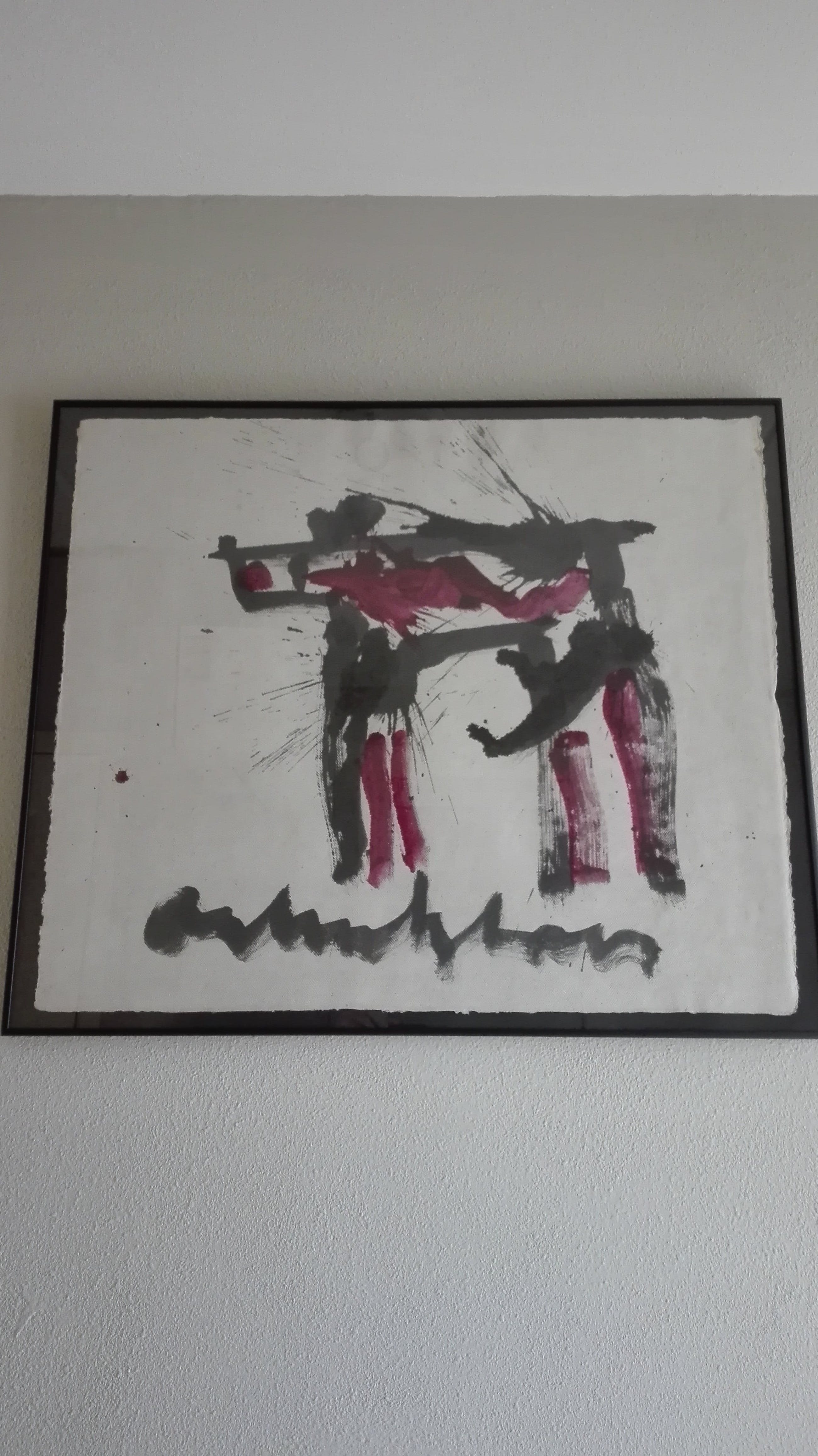 Origineel schilderij uit 1988, acrylverf en Oostindische inkt op Schoolmeester uit Westzaan papier. Netjes ingelijst in zwarte lijst met glas.