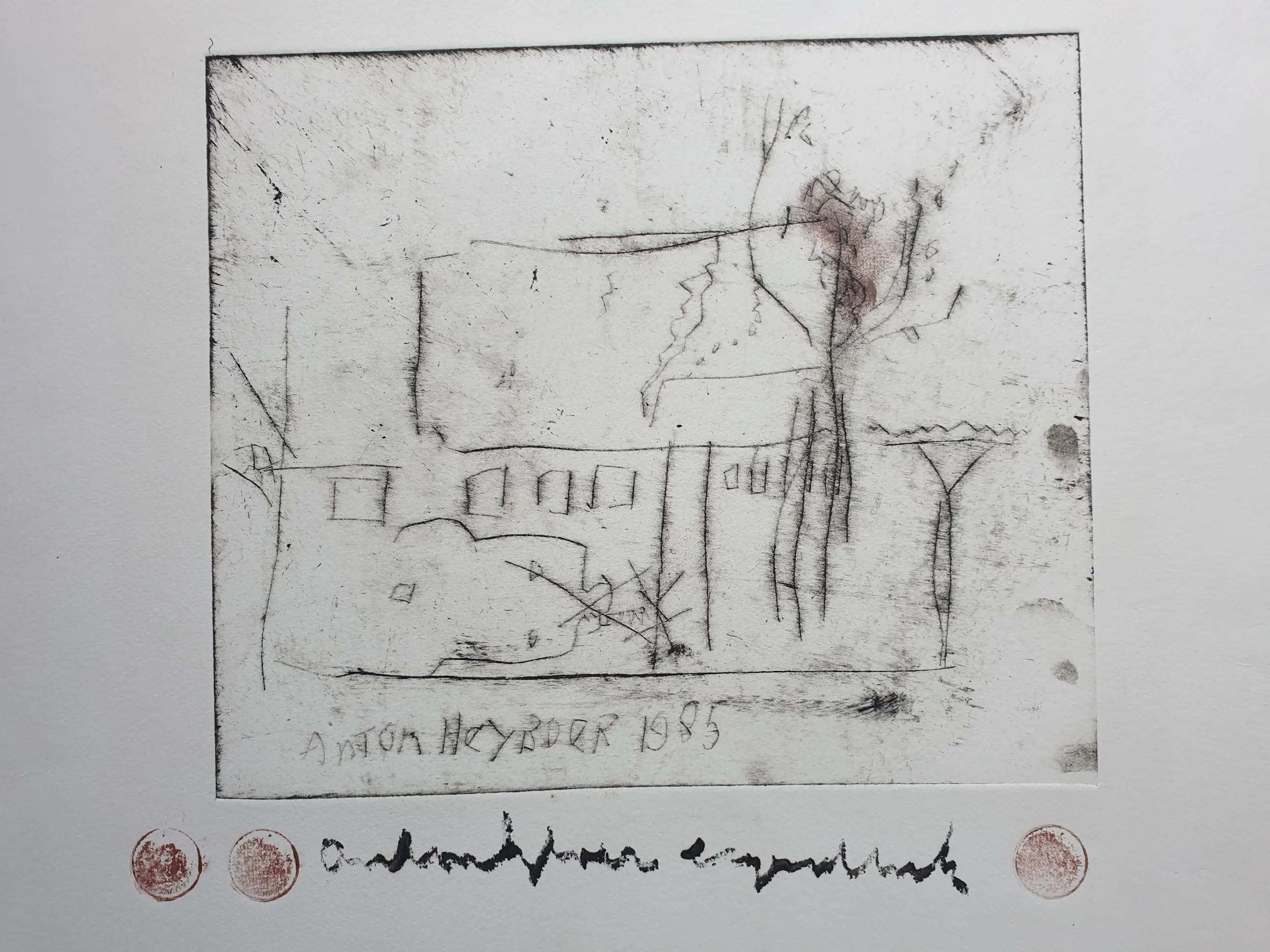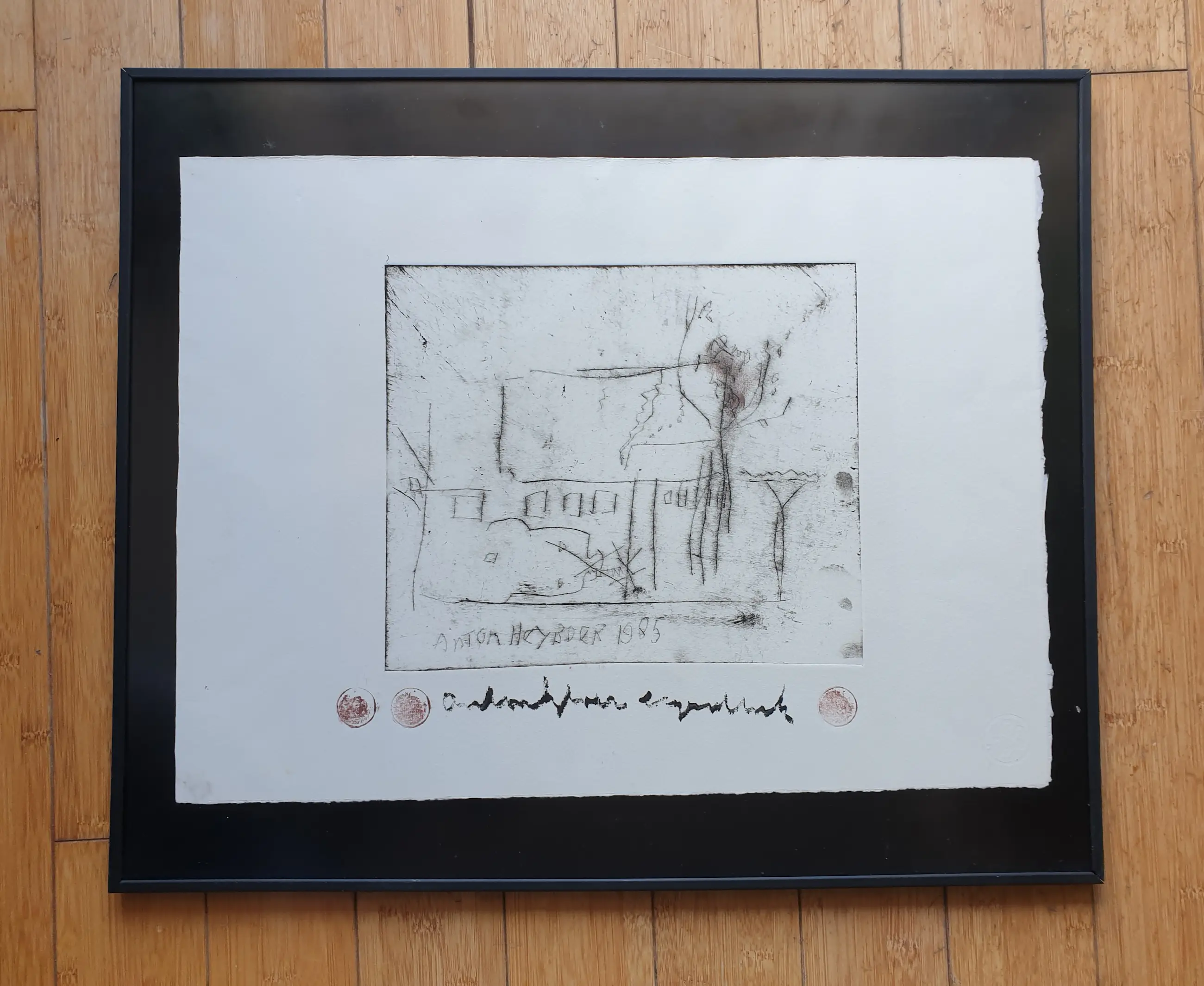 Ets uit 1985 van Anton Heyboer (1924 - 2015). Afgebeeld is het "Paradijsje", het huis van Godfried Bomans dat gelegen was aan de Witte Herenstraat te Haarlem. Heyboer mocht daar verblijven voor wat diensten bij de Sociëteit Teisterband. Het huis bestaat niet meer. De droge naald ets is zeer scherp afgedrukt op Hahnemühle papier van 39 x 53 cm. Gesigneerd en gedateerd met etsinkt met een stokje. Tevens voorzien van afdrukken van guldens met rode verf of menie. Wordt aangetekend verstuurd zonder lijst in een koker. Wilt u de eenvoudige (verkleurde) lijst met ontspiegeld glas, dan moet u het ophalen in Gouda.