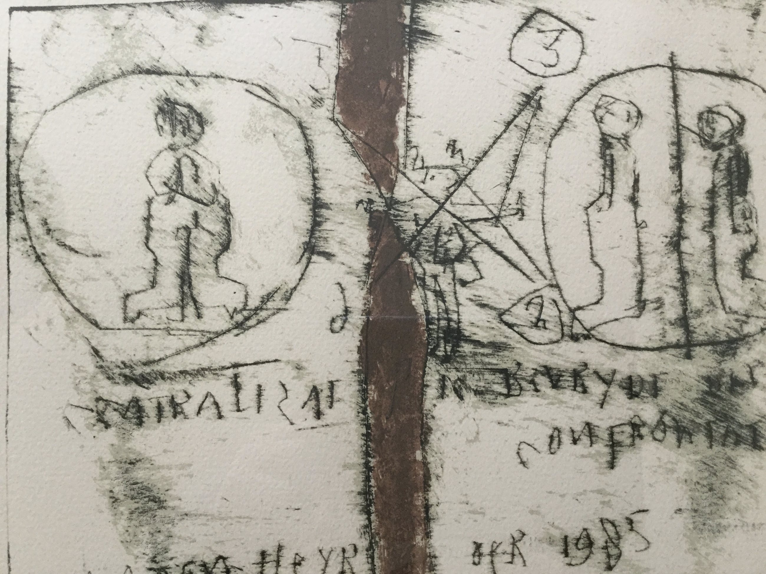 Het wezen in cirkel is de onschuld in het midden van de ets staat het systeem verbeeld en rechts de familie. In het boek "Het Systeem" van Anton Heyboer staat op pagina 16, "Onschuld is handen zonder handeling, voeten zonder te staan. Alleen beleven van de kwetsing die de geest de ziel aandeed zolang de mens zich denkt opgericht te hebben".