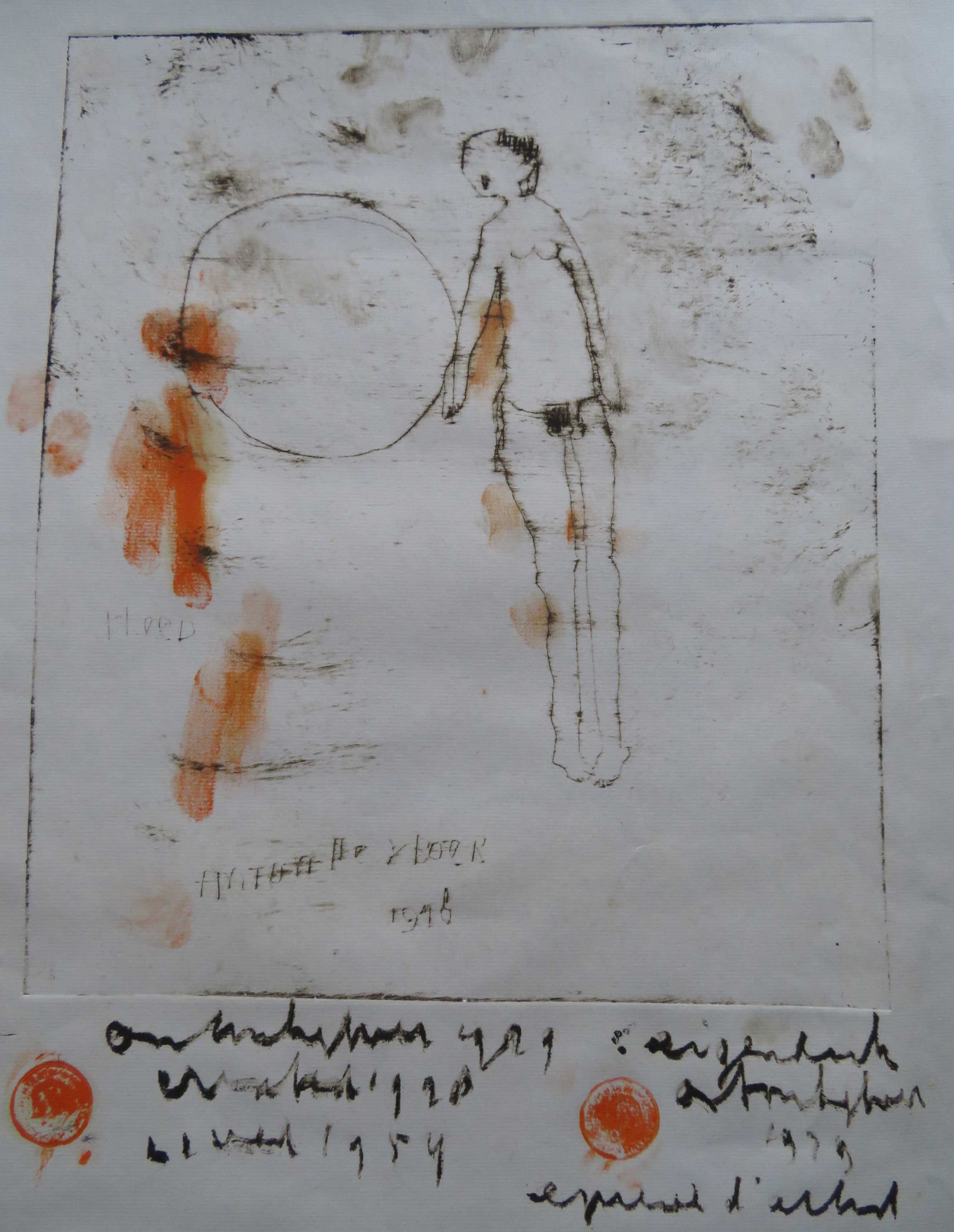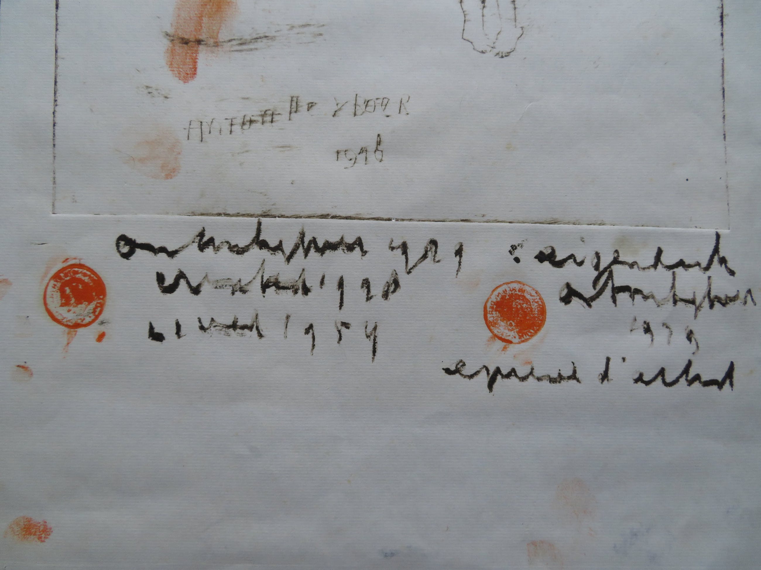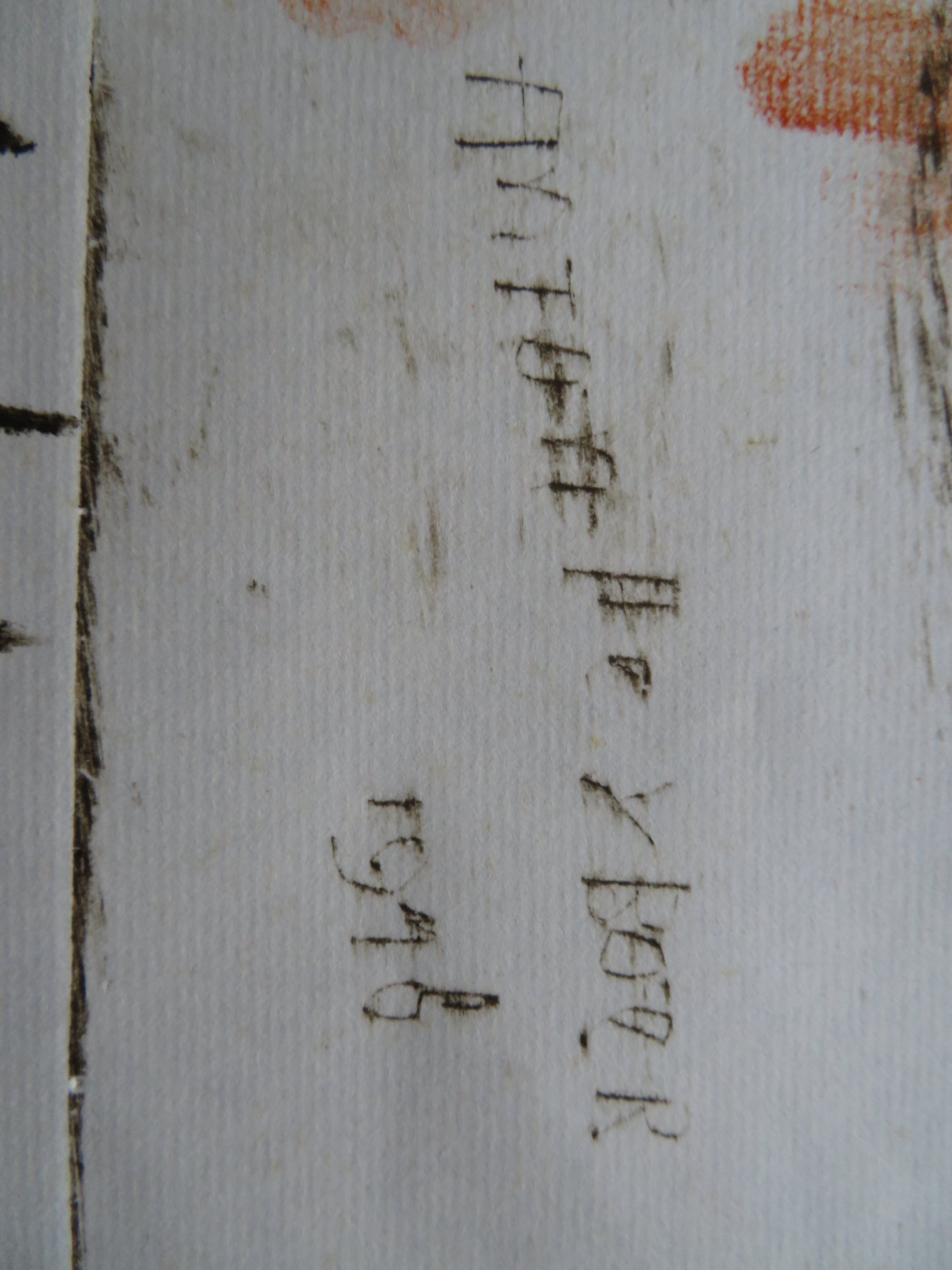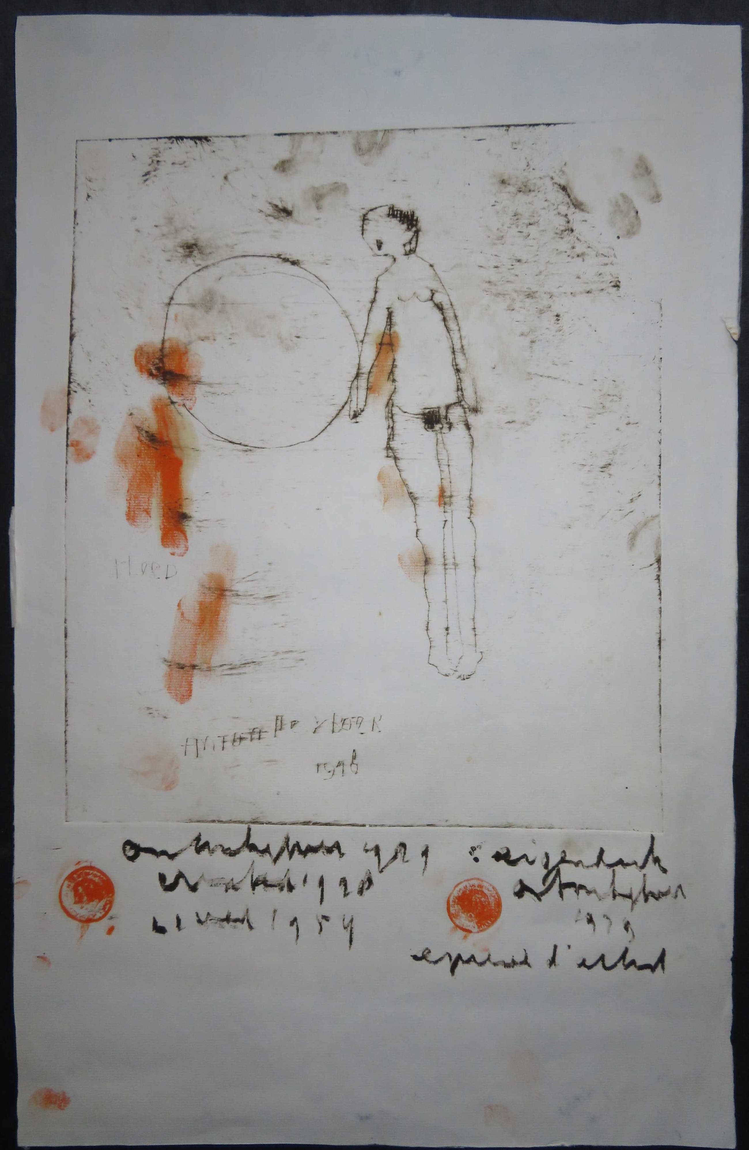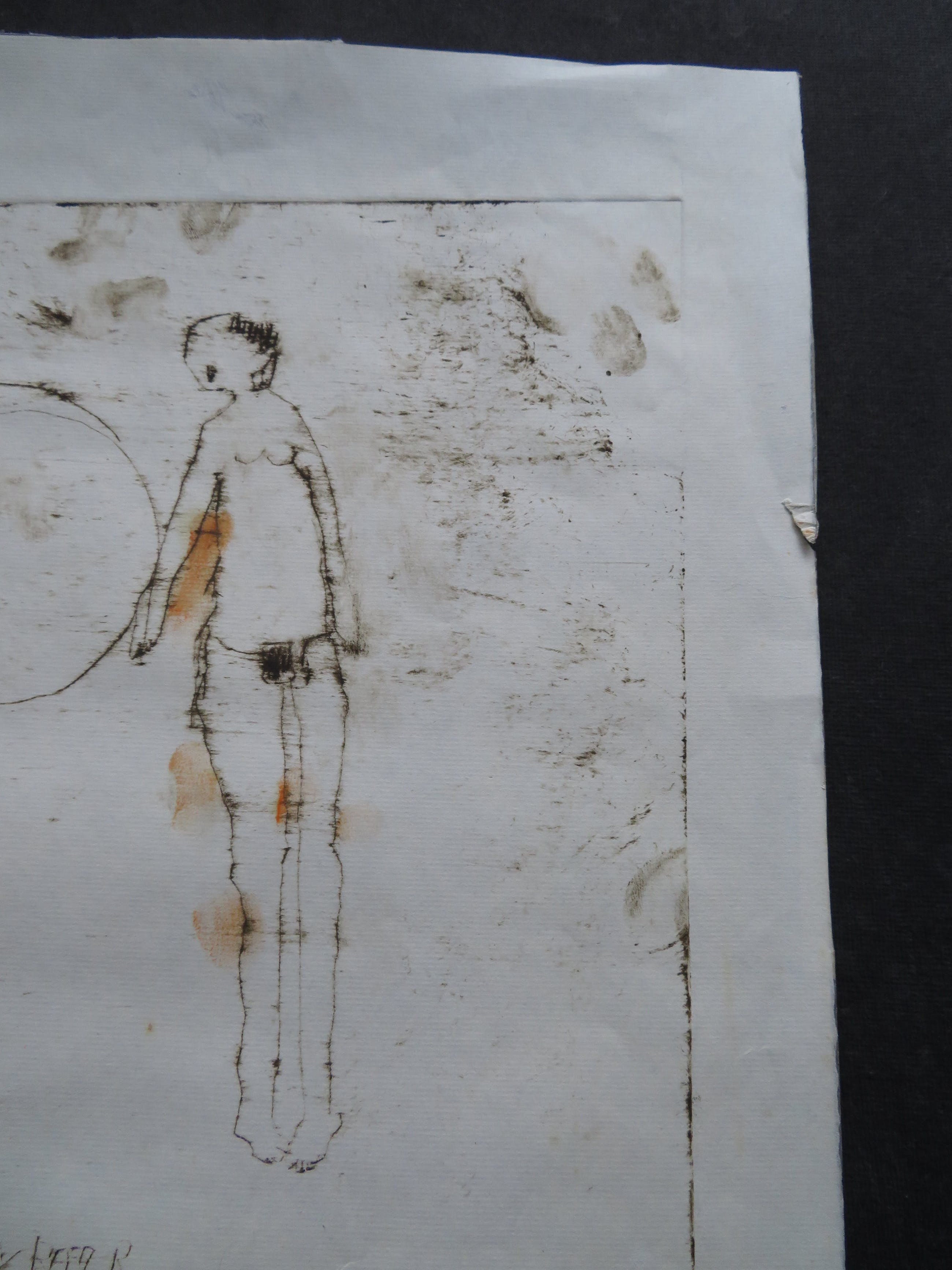 De ets is later met verf bewerkt en staat vol met zijn eigen vingerafdrukken (letterlijk en figuurlijk).Hij heeft diverse malen zijn naam en verschillende jaartallen erop geschreven.Verder staat er ook nog "eigen druk" en epreuve d'artist.En tekst die ik niet kan ontcijferen.