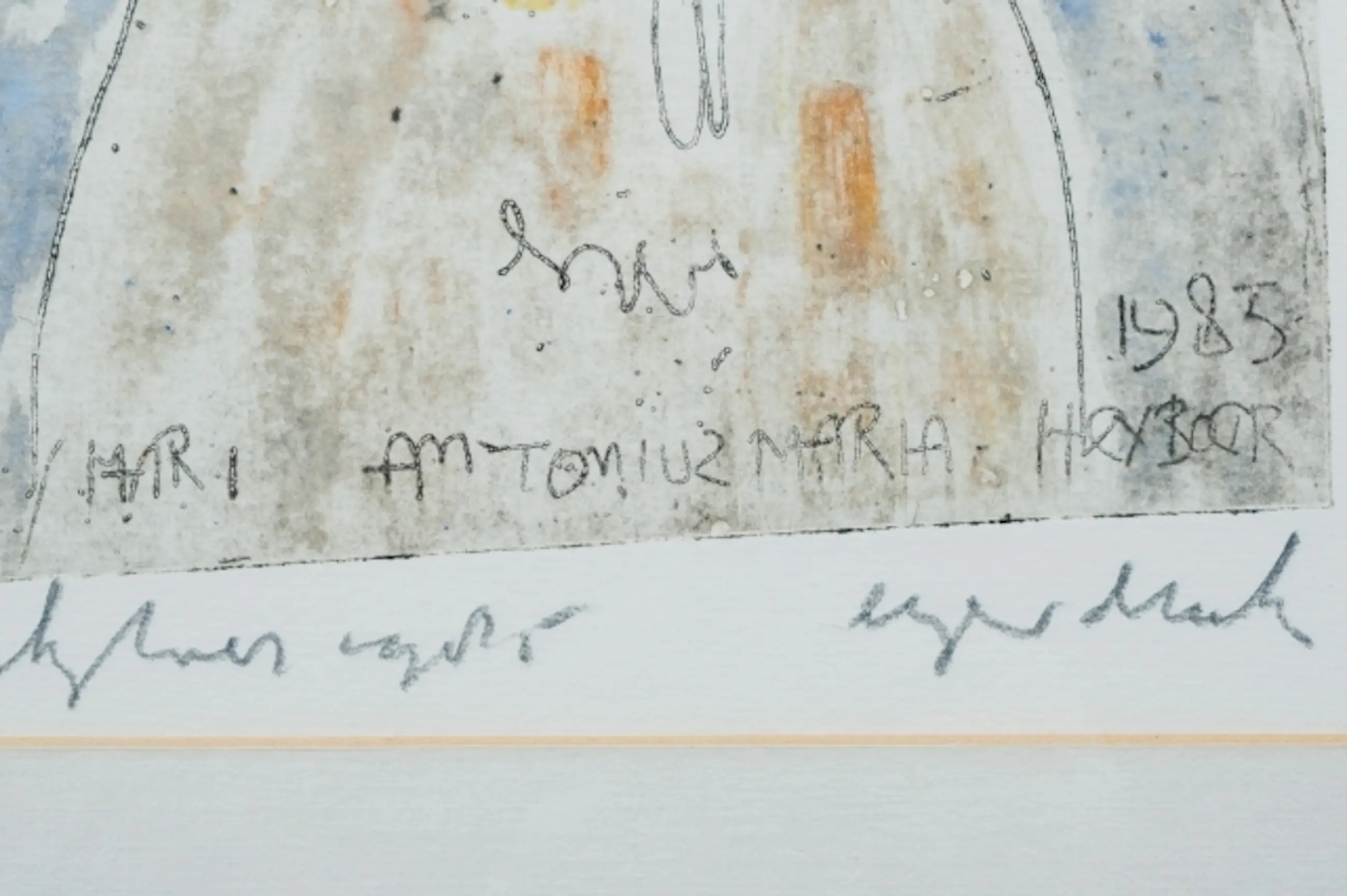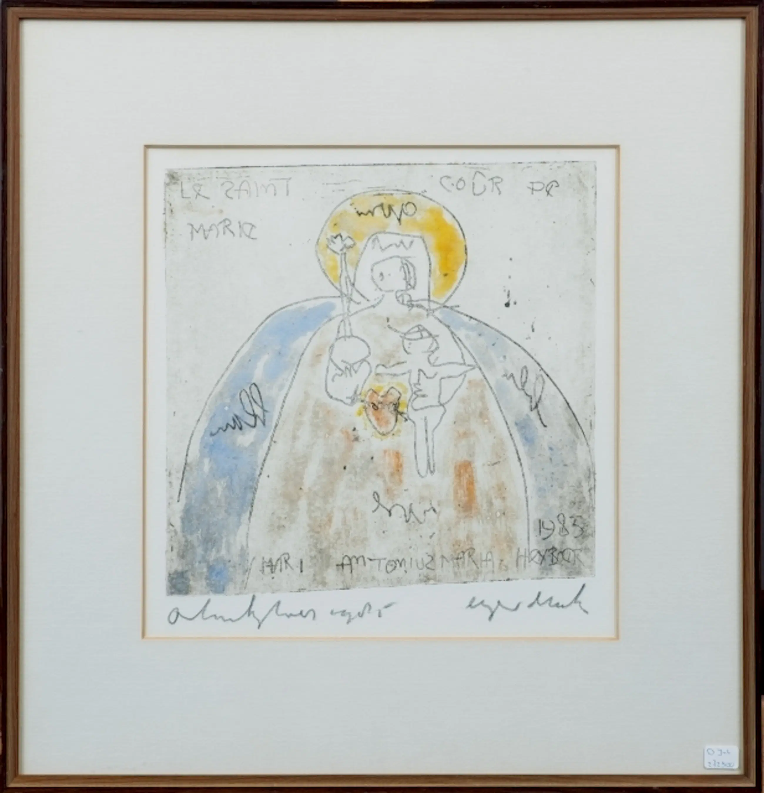 Ingelijste kleuren ets van Anton Heyboer. Titel: 'Le saint coeur de Maria'. Afmetingen incl lijst: H41 x b35cm. Afmetingen voorstelling: H26 x b25cm. Het werk is onderaan gesigneerd door de kunstenaar. De authenticiteit van het aangeboden werk wordt volledig gegarandeerd. Een certificaat van echtheid kan, op aanvraag, worden gemaild.
