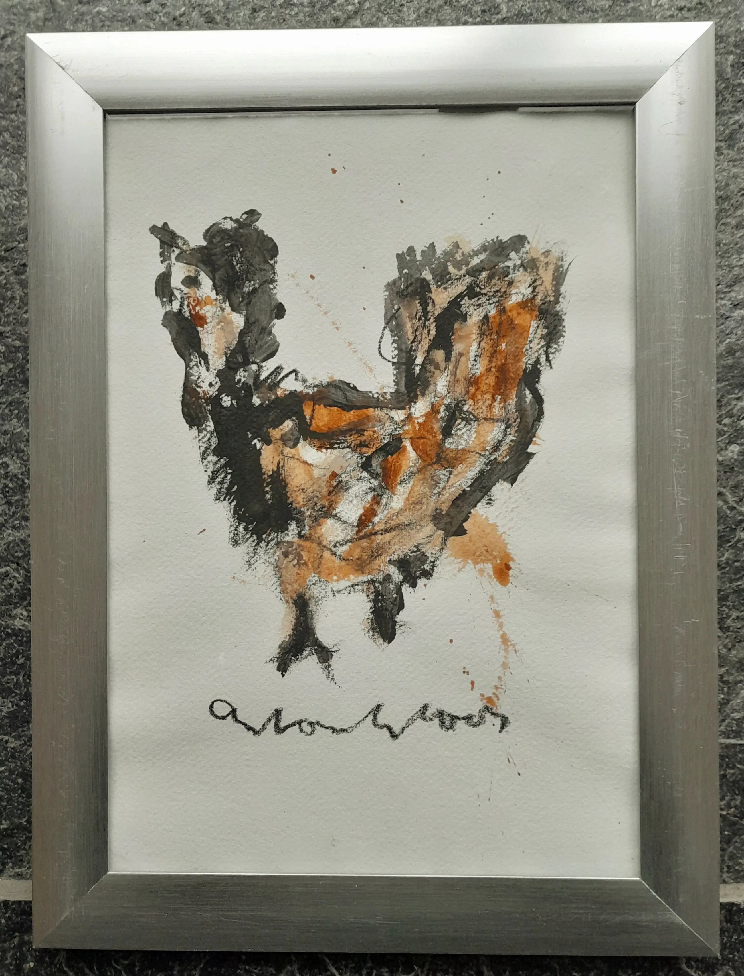 Kip met inkt en klei op geschept papier uit 1995 van Anton Heyboer. Formaat 35 x 26 cm. Het werk is in een eenvoudige aluminium lijst gezet met wat lichte gebruikssporen. Wordt aangetekend verzonden.