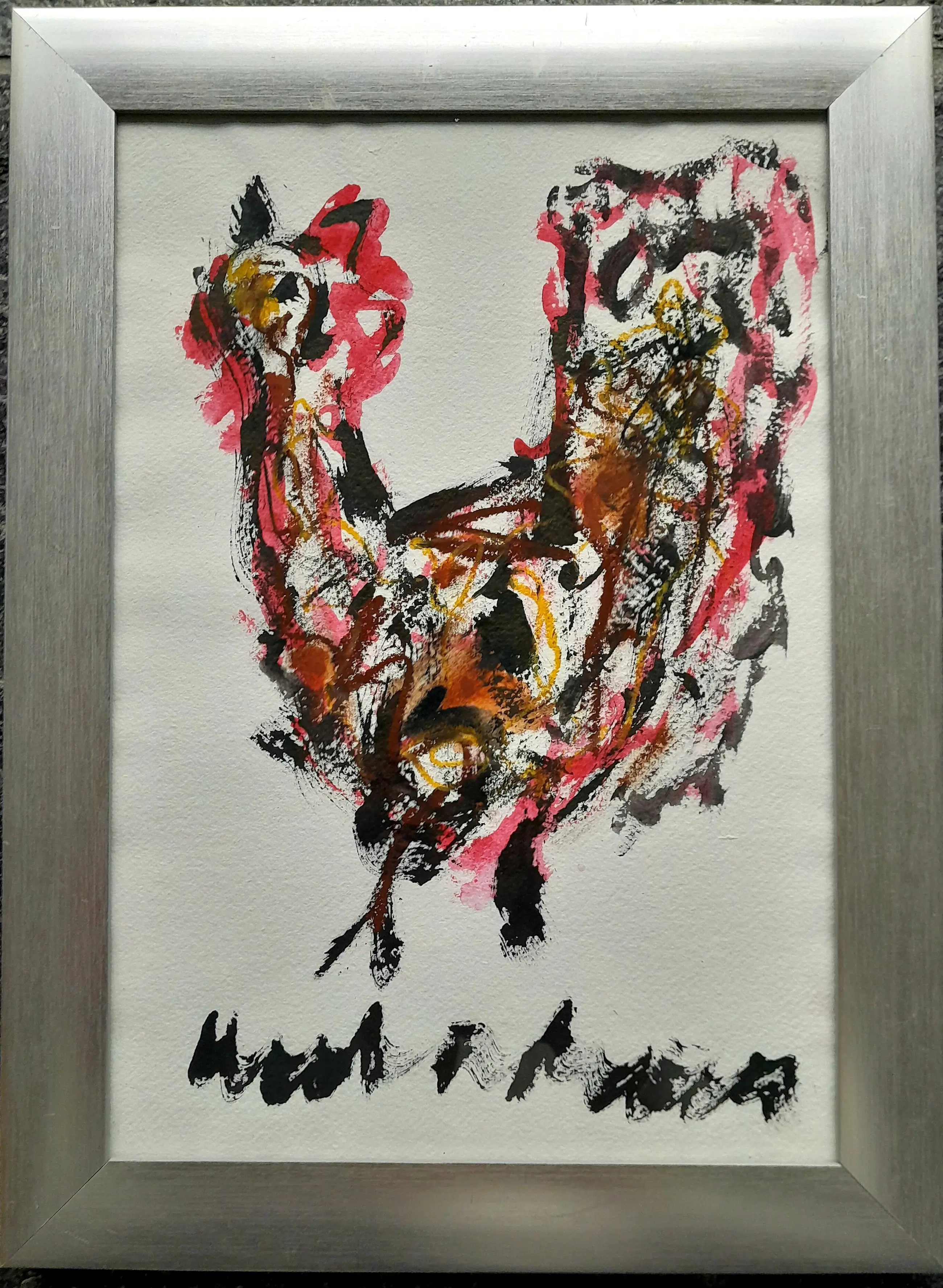 Kip met inkt en krijt op geschept papier uit 1995 van Anton Heyboer. Formaat 35 x 26 cm. Het werk is in een eenvoudige aluminium lijst gezet met wat lichte gebruikssporen. Wordt aangetekend verzonden.