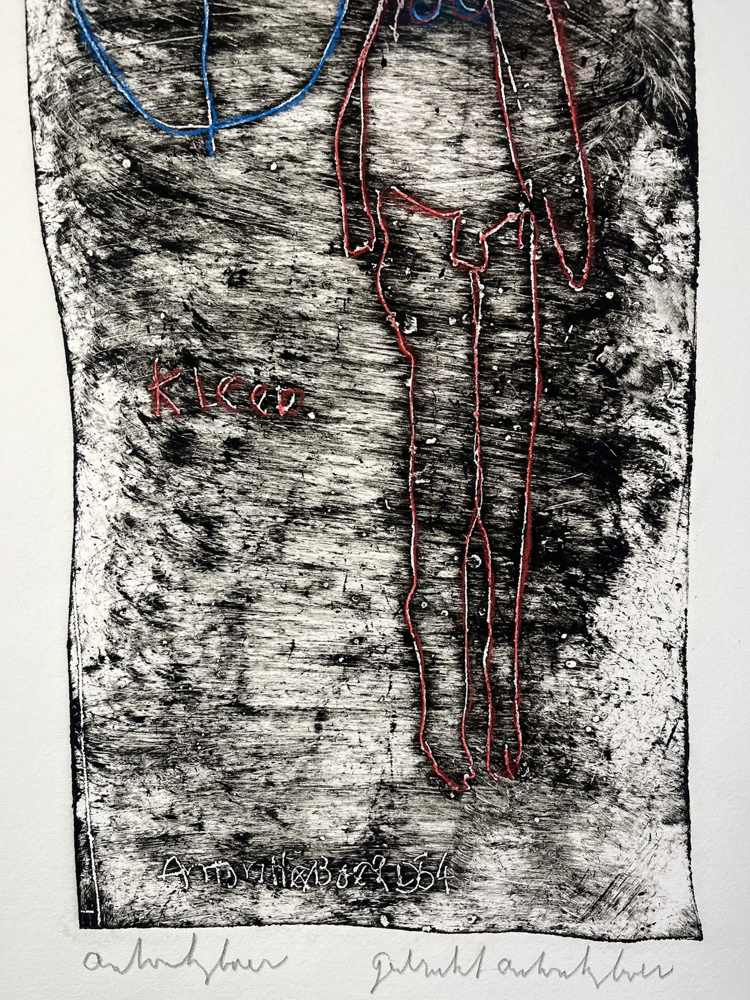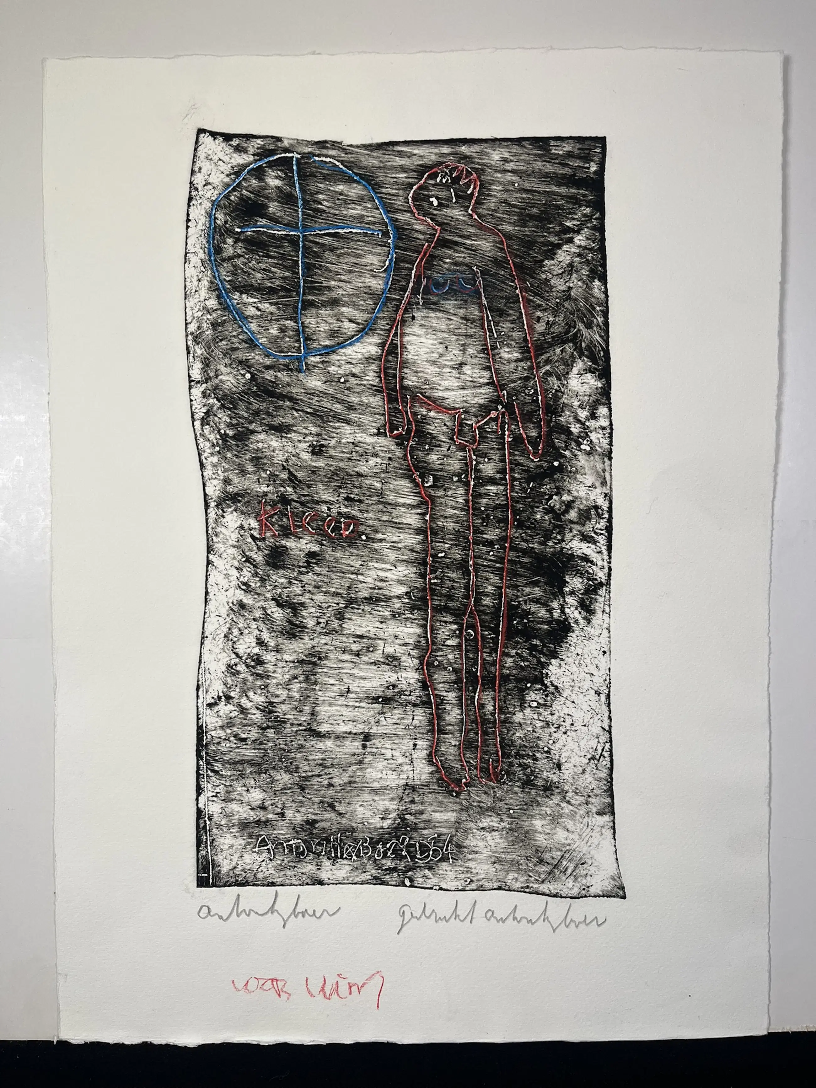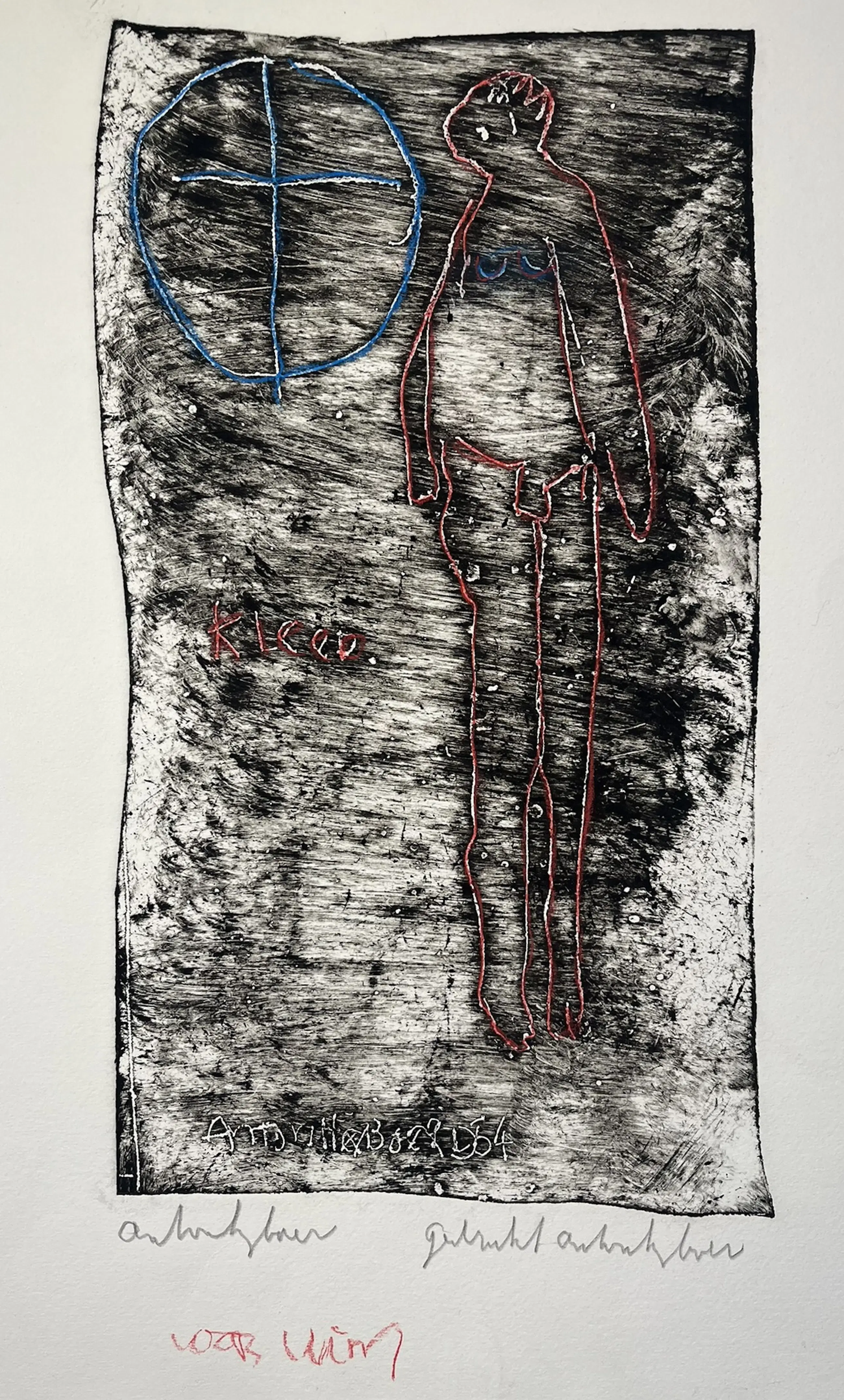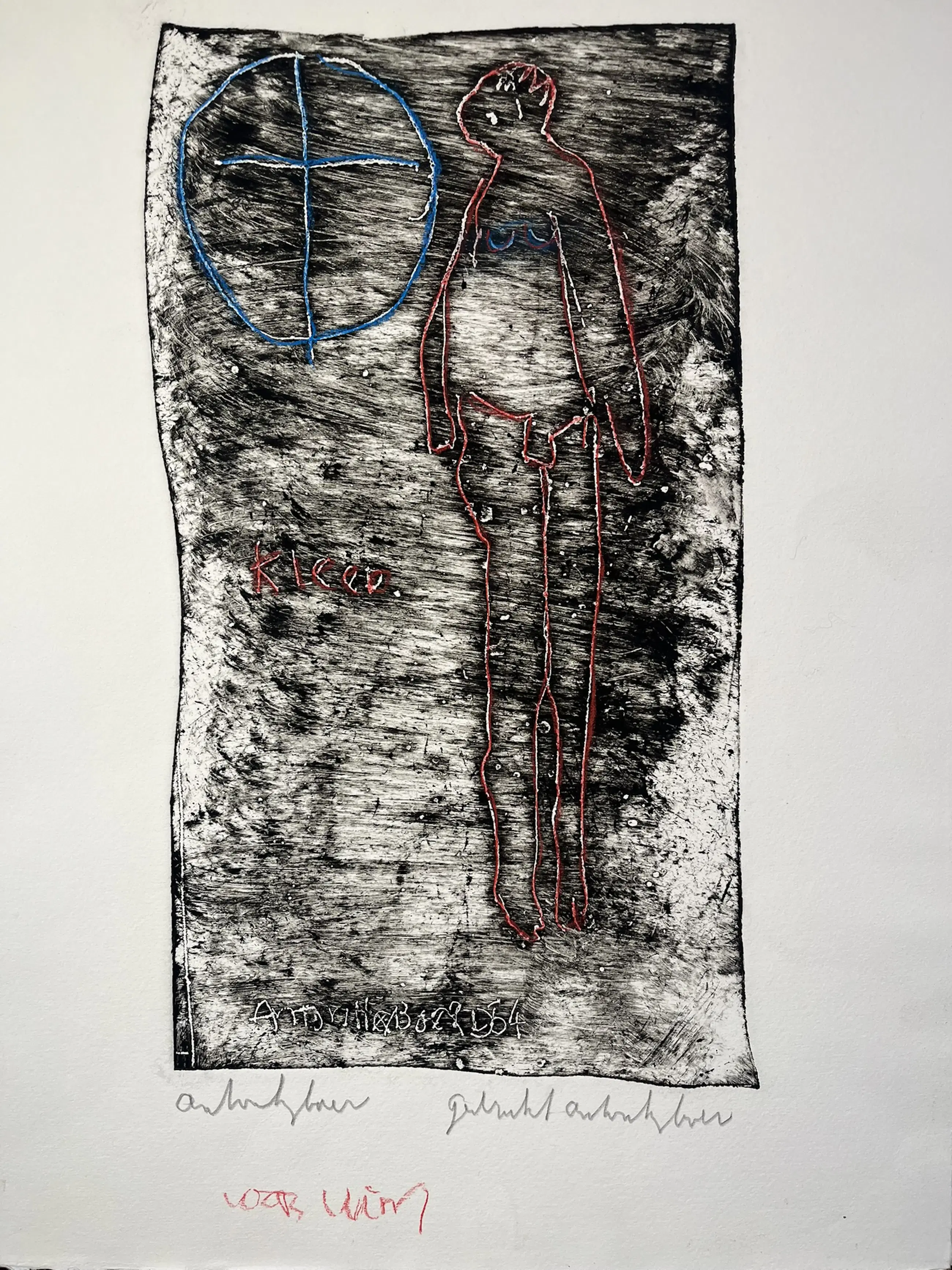 Anton heeft een paar keer een ets met deze voorstelling gemaakt. Een figuur met het minimum aan kleding, alleen maar een schaamlapje, en daarnaast een cirkel met een kruis, waardoor hij in vieren is verdeeld.