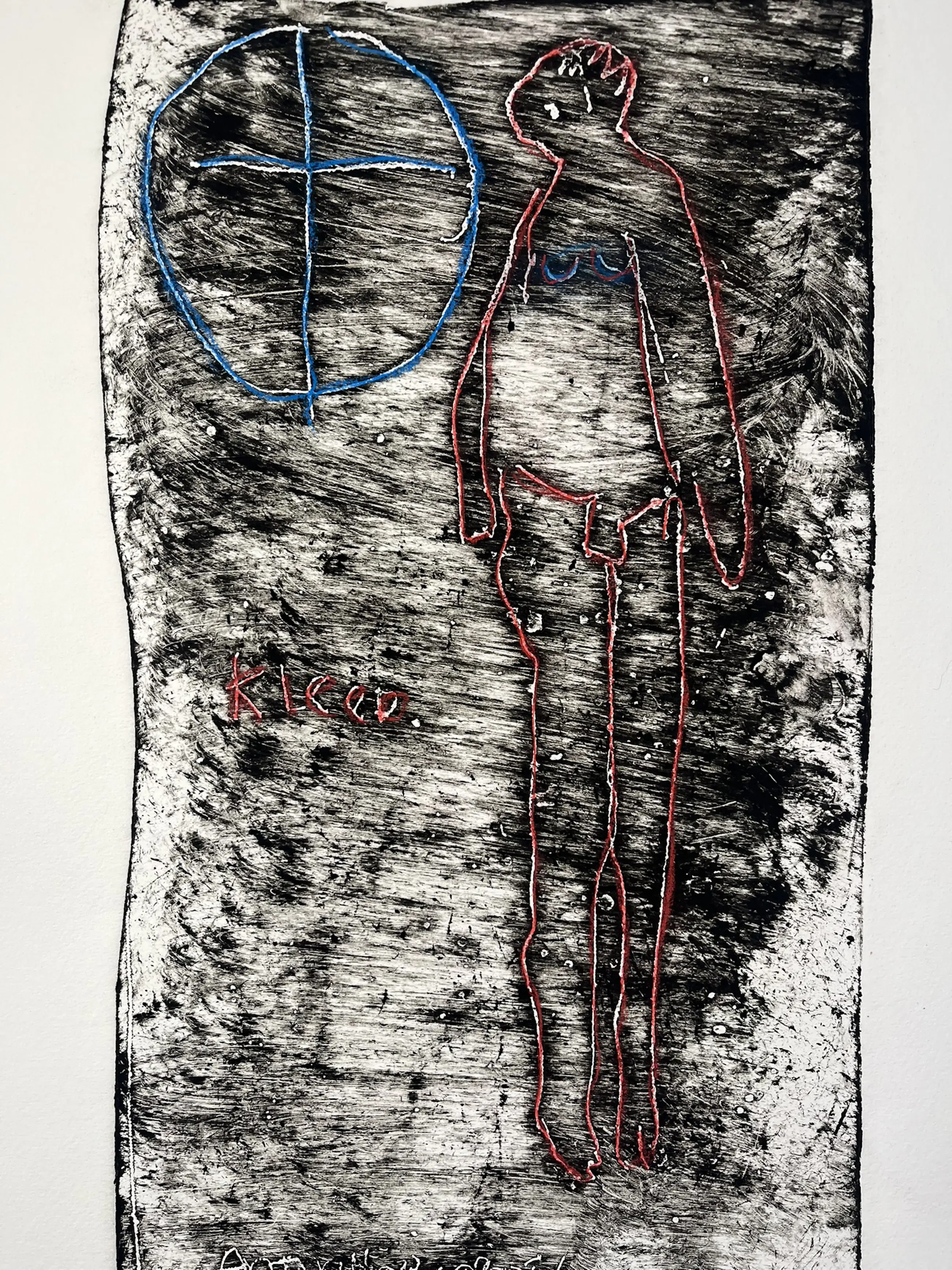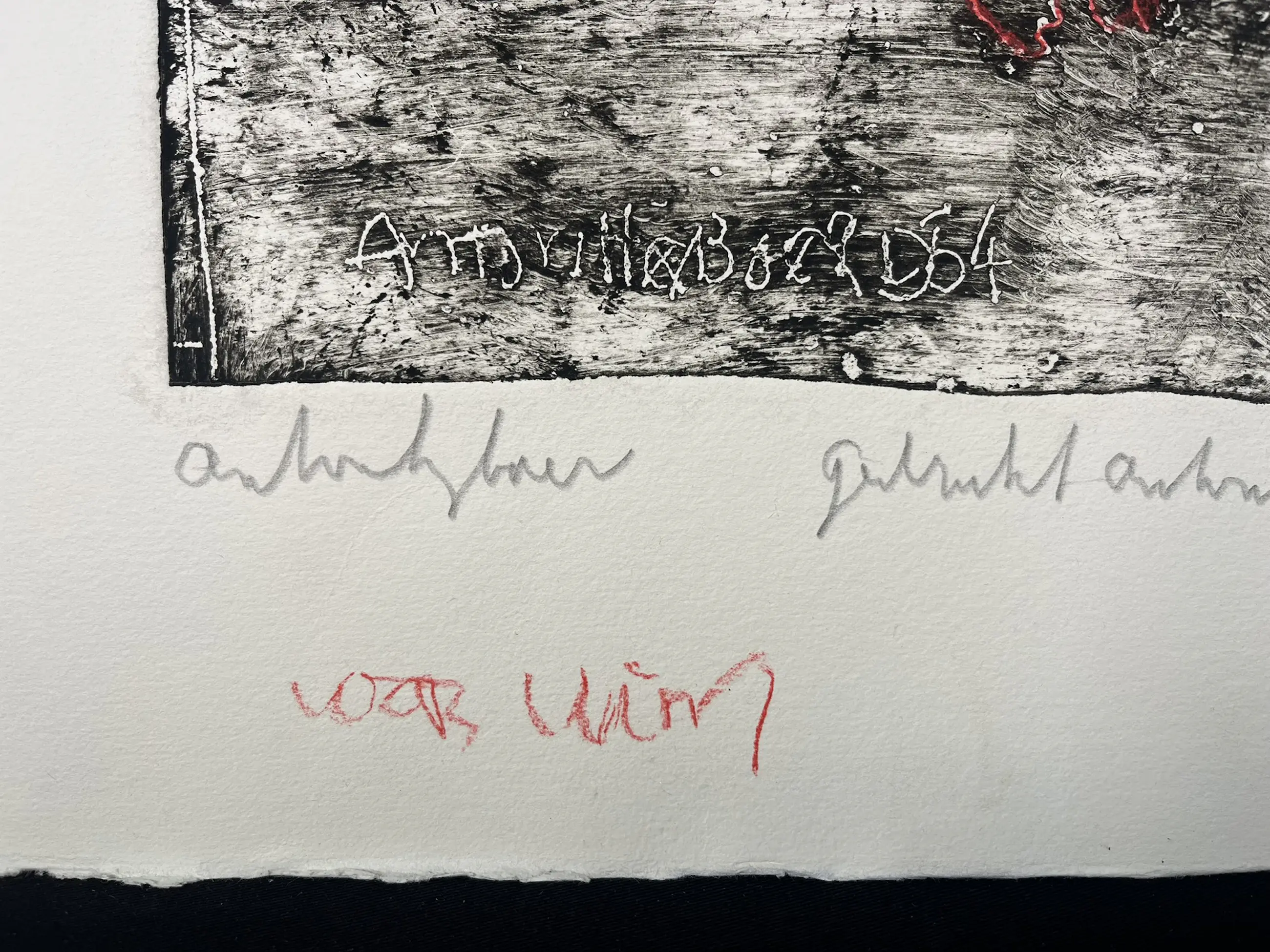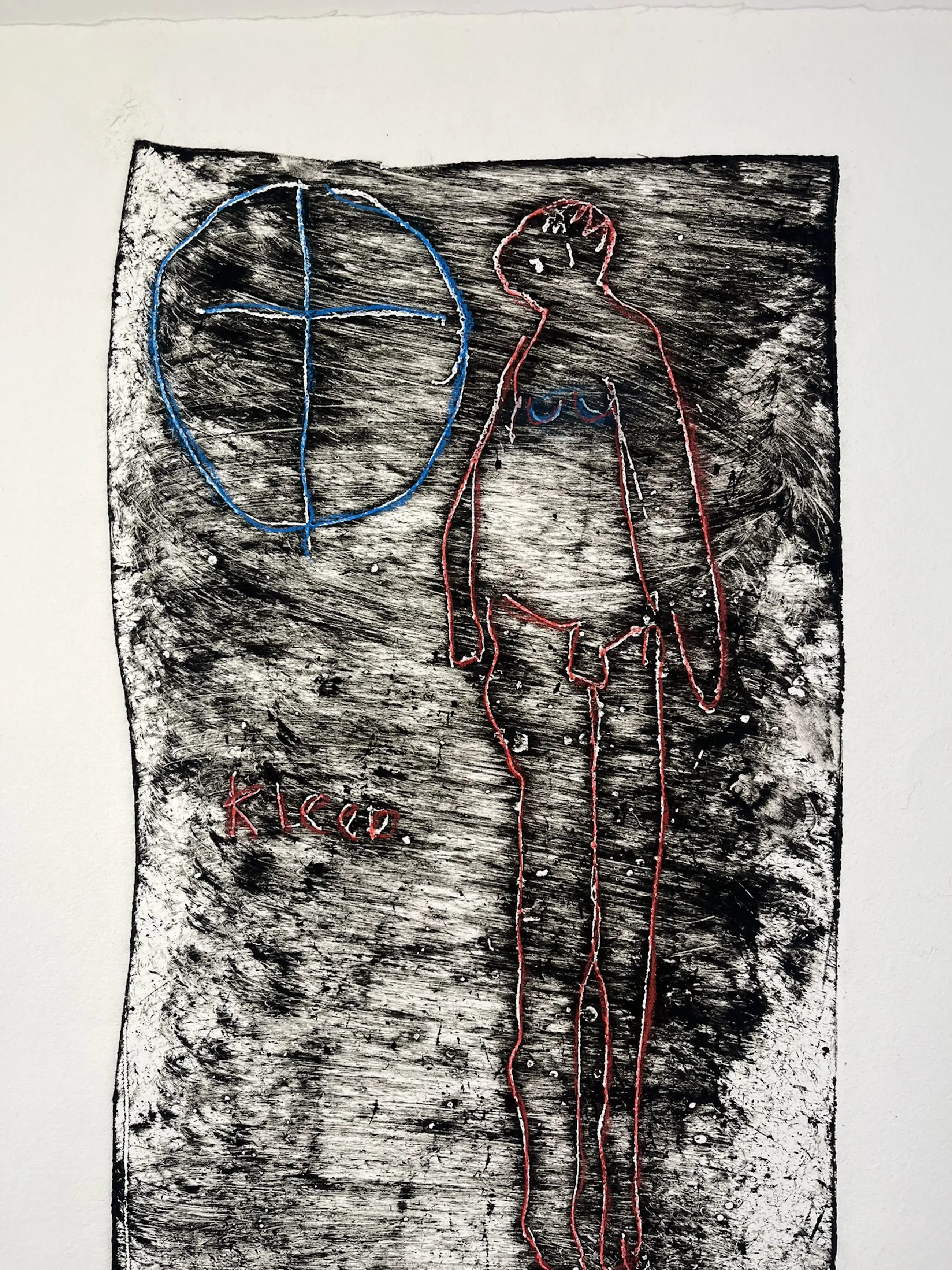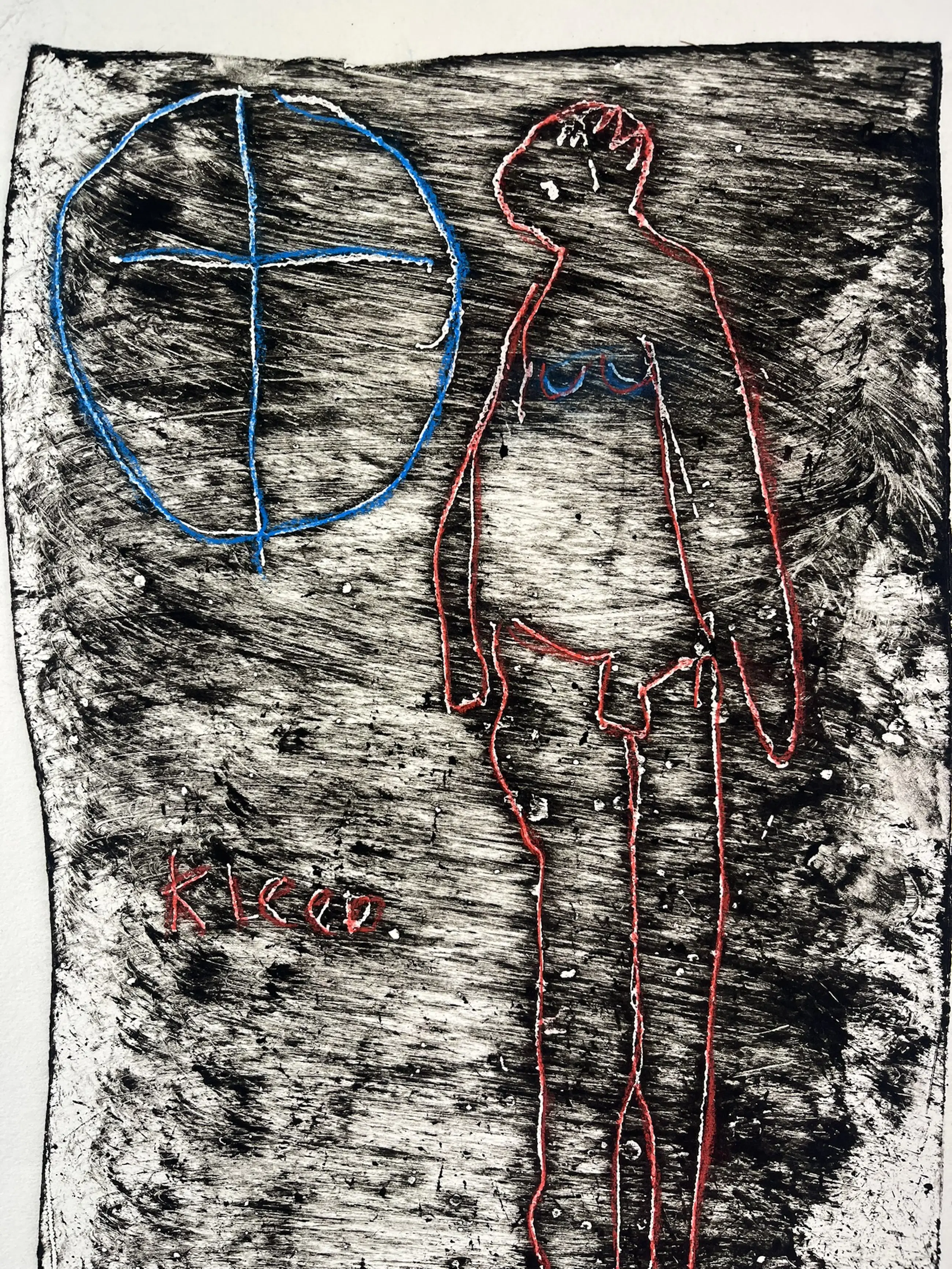 Anton heeft een paar keer een ets met deze voorstelling gemaakt. Een figuur met het minimum aan kleding, alleen maar een schaamlapje, en daarnaast een cirkel met een kruis, waardoor hij in vieren is verdeeld.