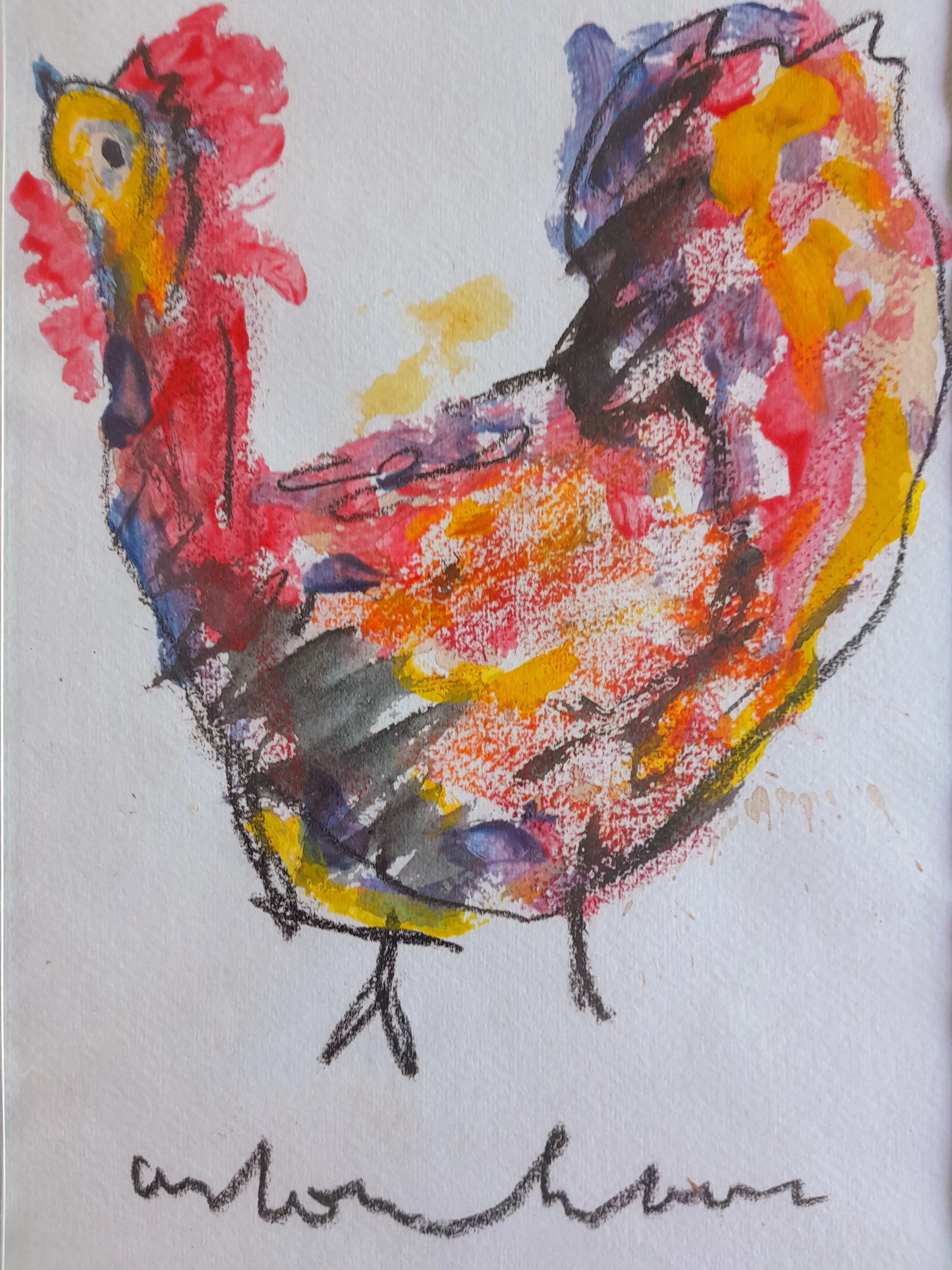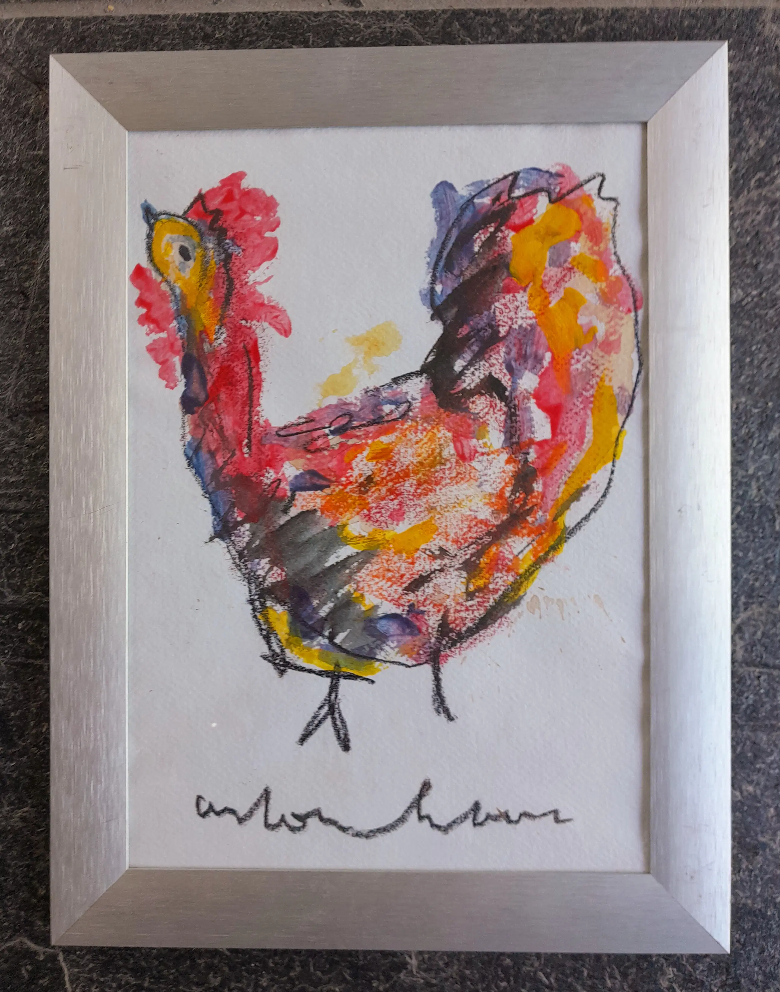 Kleurige kip van Anton Heyboer. Het werk is met aquarel en krijt gemaakt op handgeschept papier. het werk uit 1995 zit in een eenvoudige lijst van 35 x 26 cm. Wordt aangetekend verstuurd.