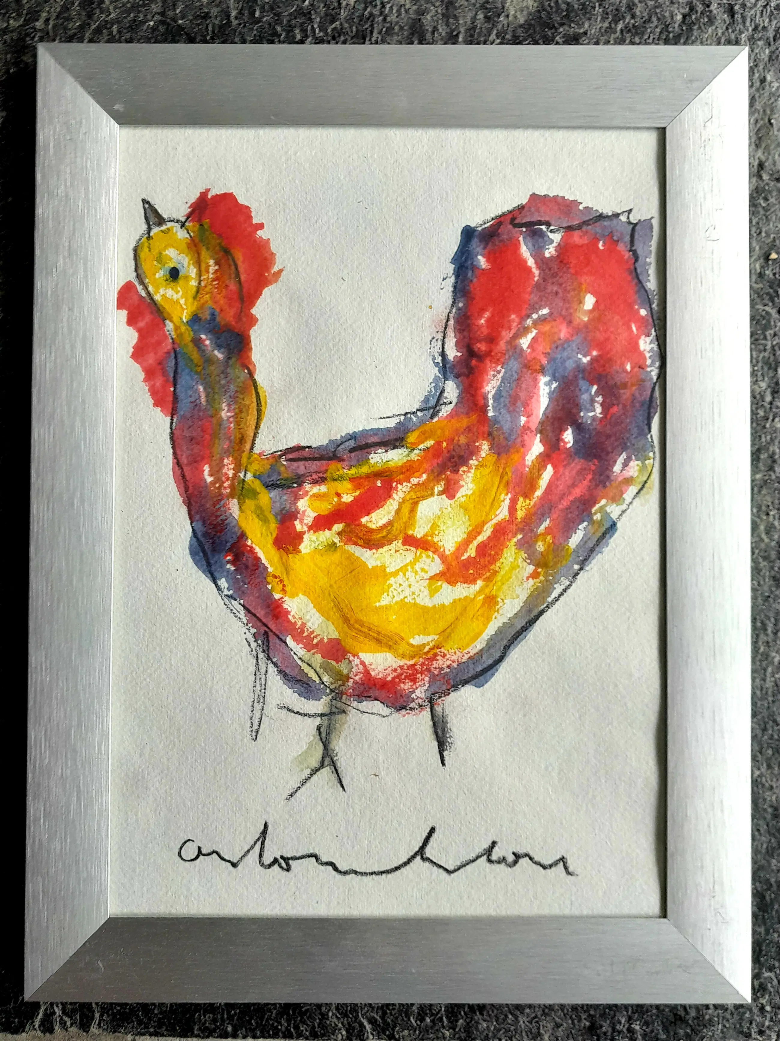 Kleurige kip van Anton Heyboer. Het werk is met aquarel en krijt gemaakt op handgeschept papier. het werk uit 1995 zit in een eenvoudige lijst van 35 x 26 cm. Wordt aangetekend verstuurd.