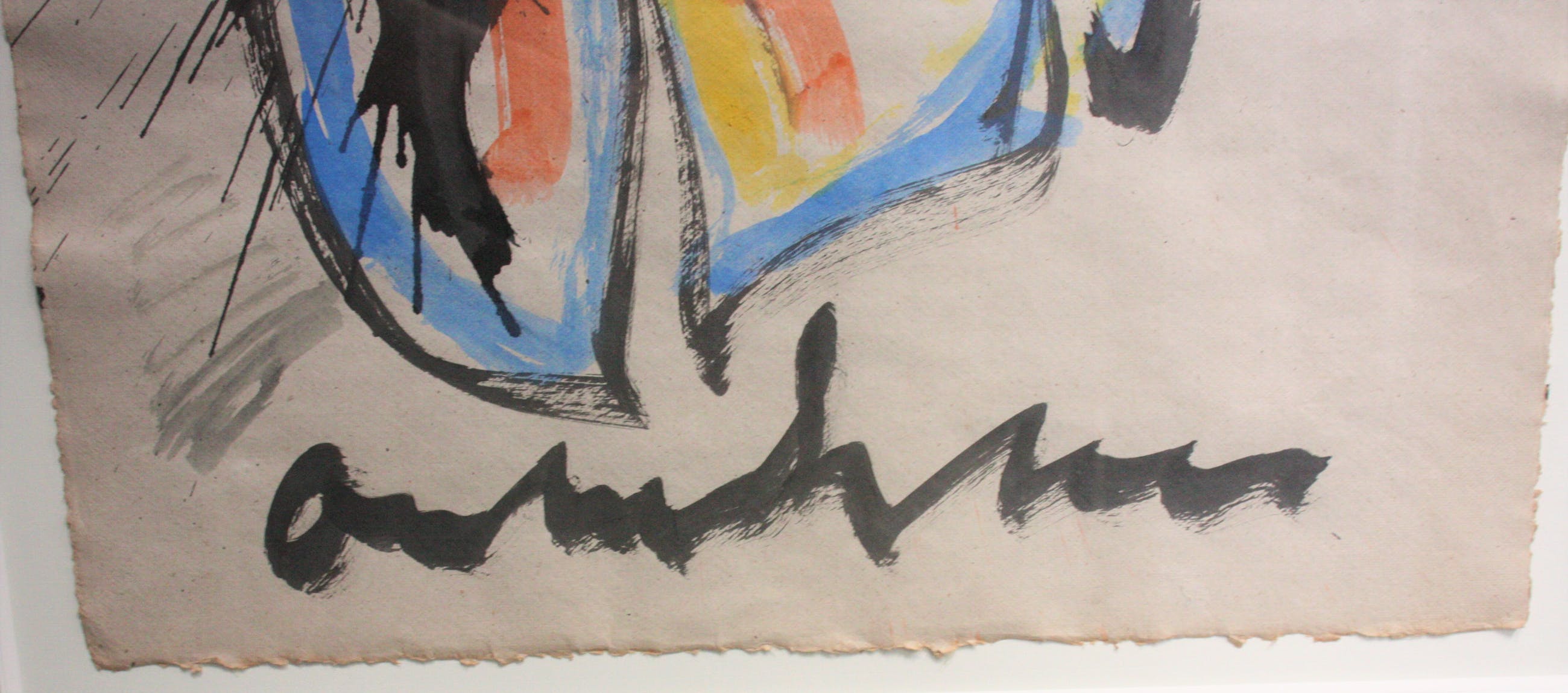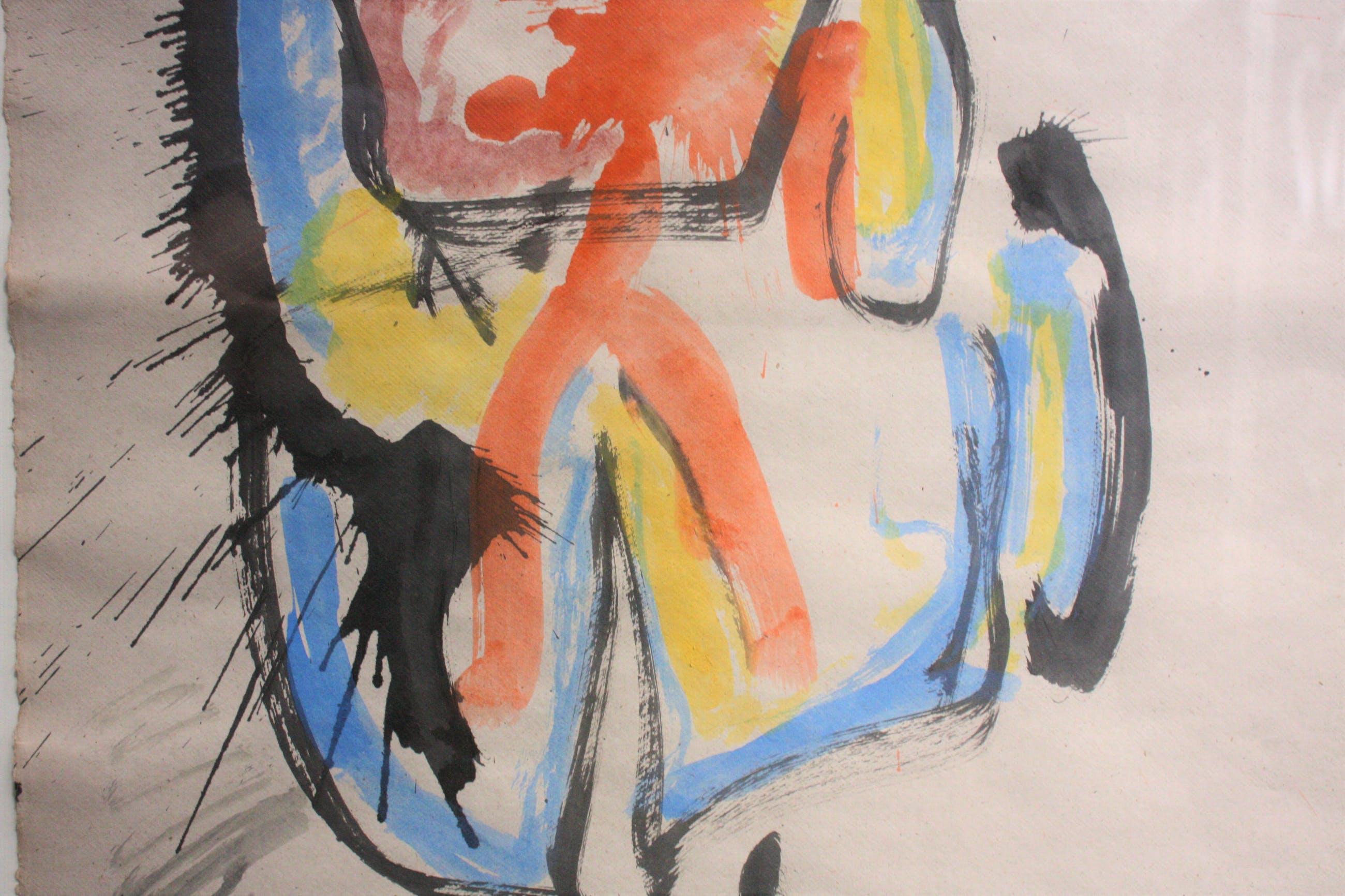 Het papier met enkele minieme kreukellijntjes en (gebruikelijke) rafeling langs de randen. Ingelijst in passe-partout en achter glas, de lijst in goede staat.