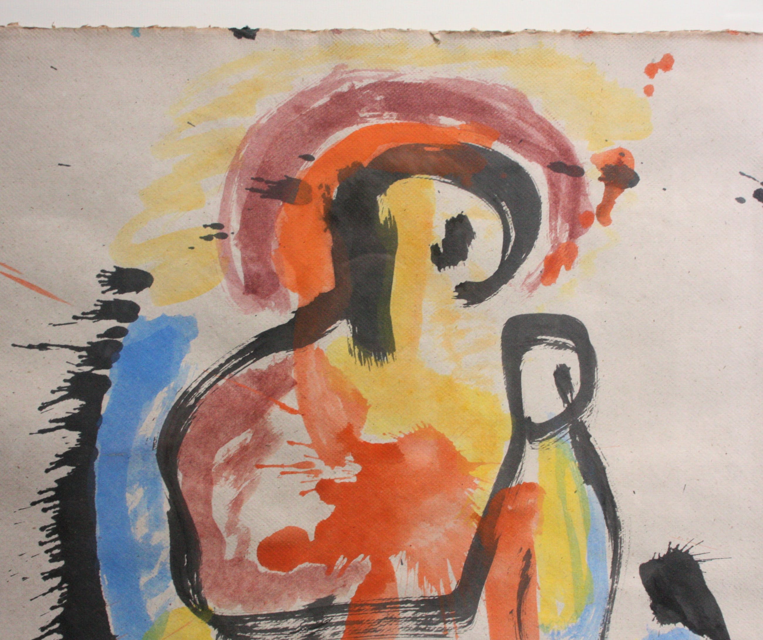 Dit werk is van de Nederlandse kunstenaar Anton Heyboer. Op het papier is in felle kleuren Maria afgebeeld met het kind op haar arm. Het werk is in goede staat, onderaan gesigneerd en ingelijst in passe-partout en achter glas.