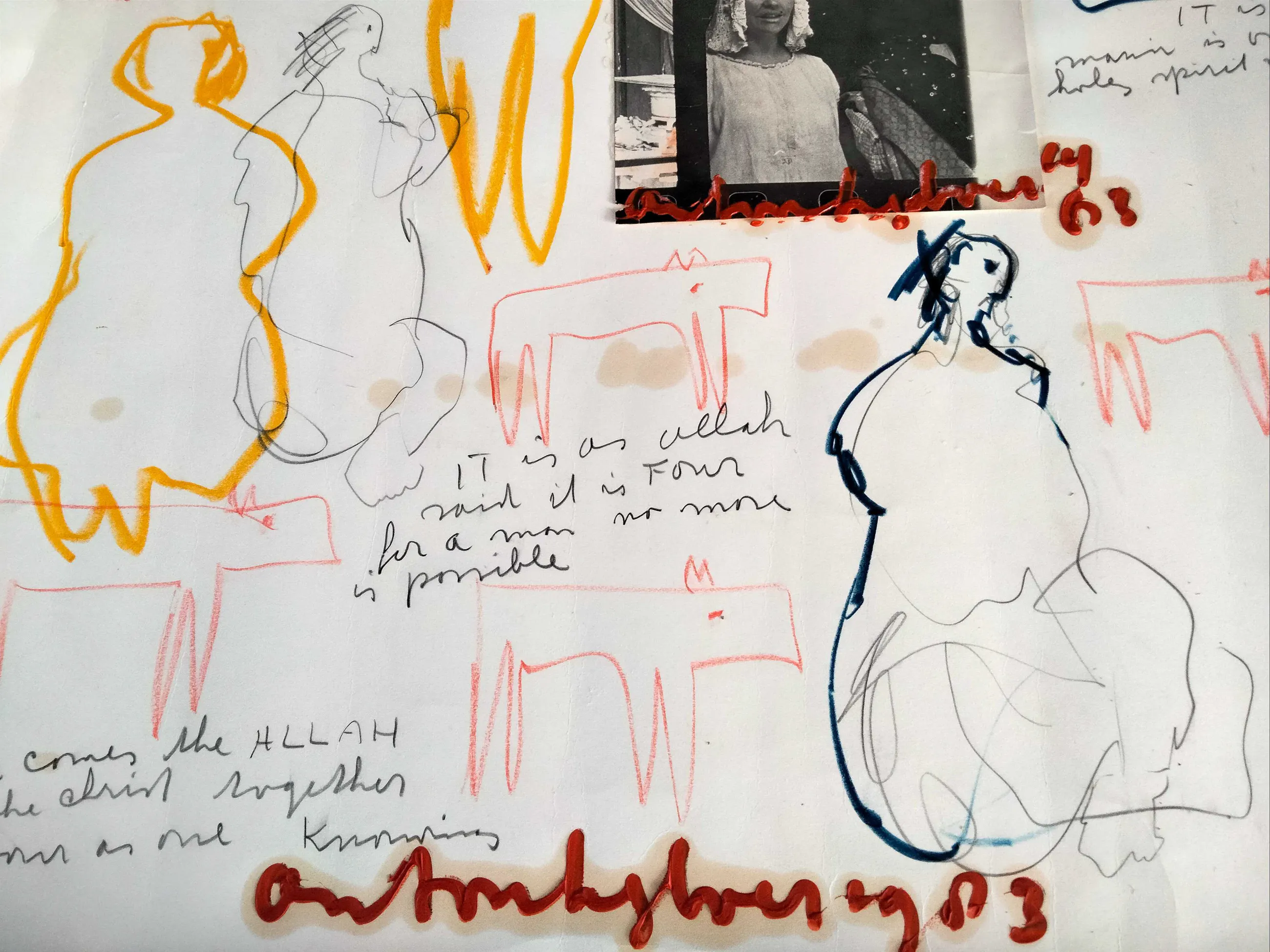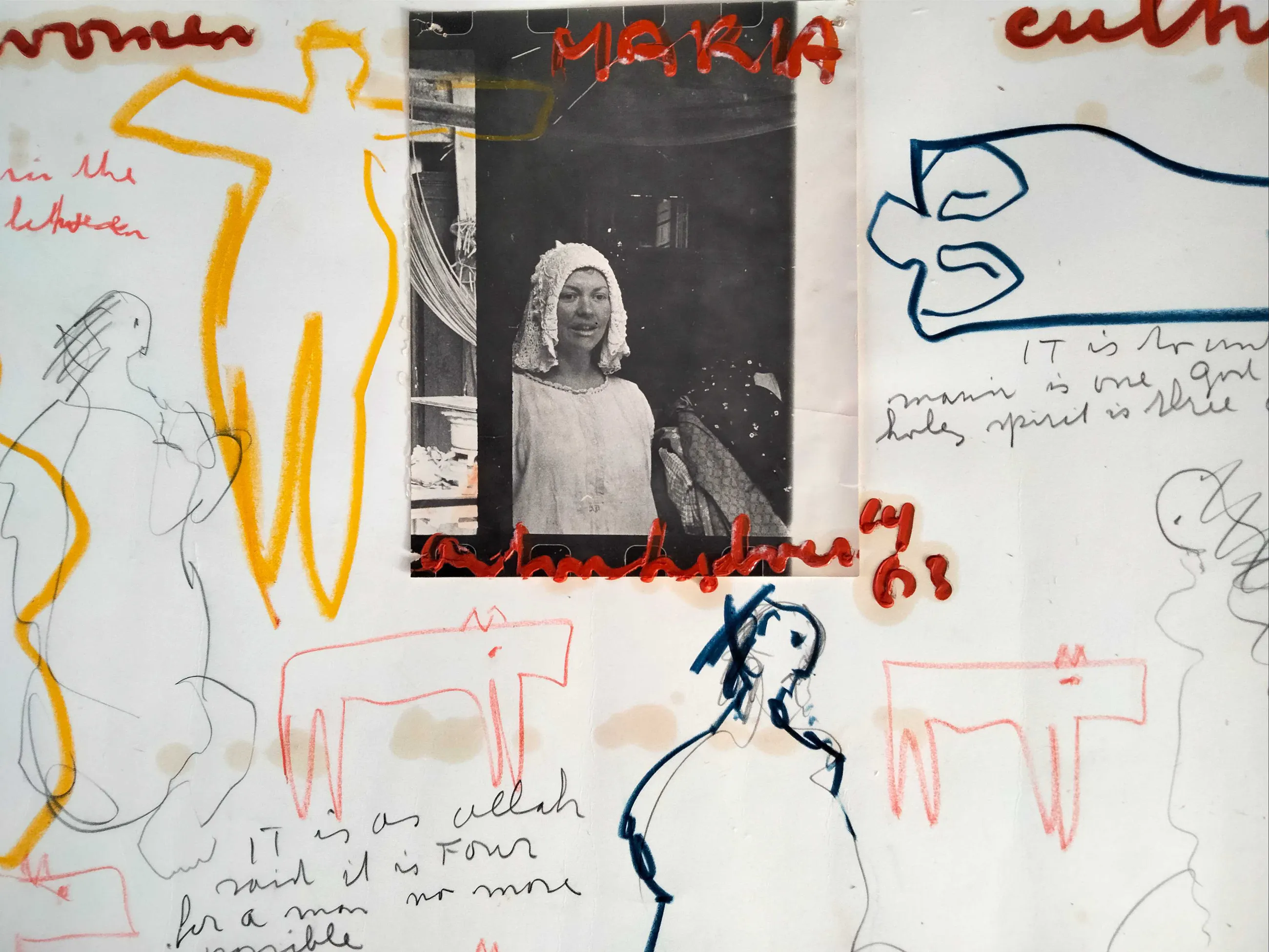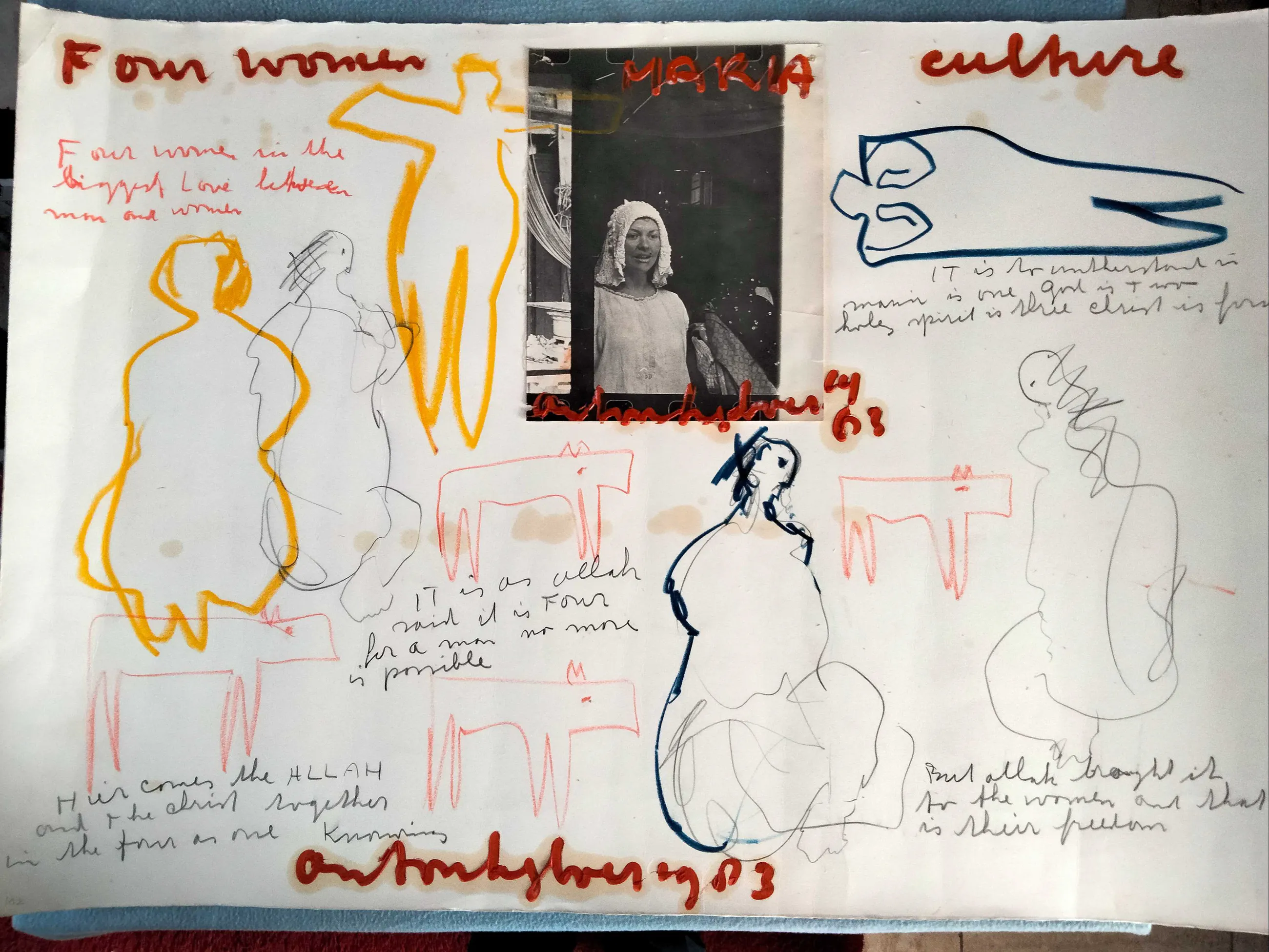 Zeldzame collage met diversen technieken gemaakt door Anton Heyboer in 1983 Gesigneerd 2x door anton met olieverf. De grote originele foto van Maria is ook met olieverf bewerkt. Verder staat er veel tekst en figuren geschreven in potlood en wasco.