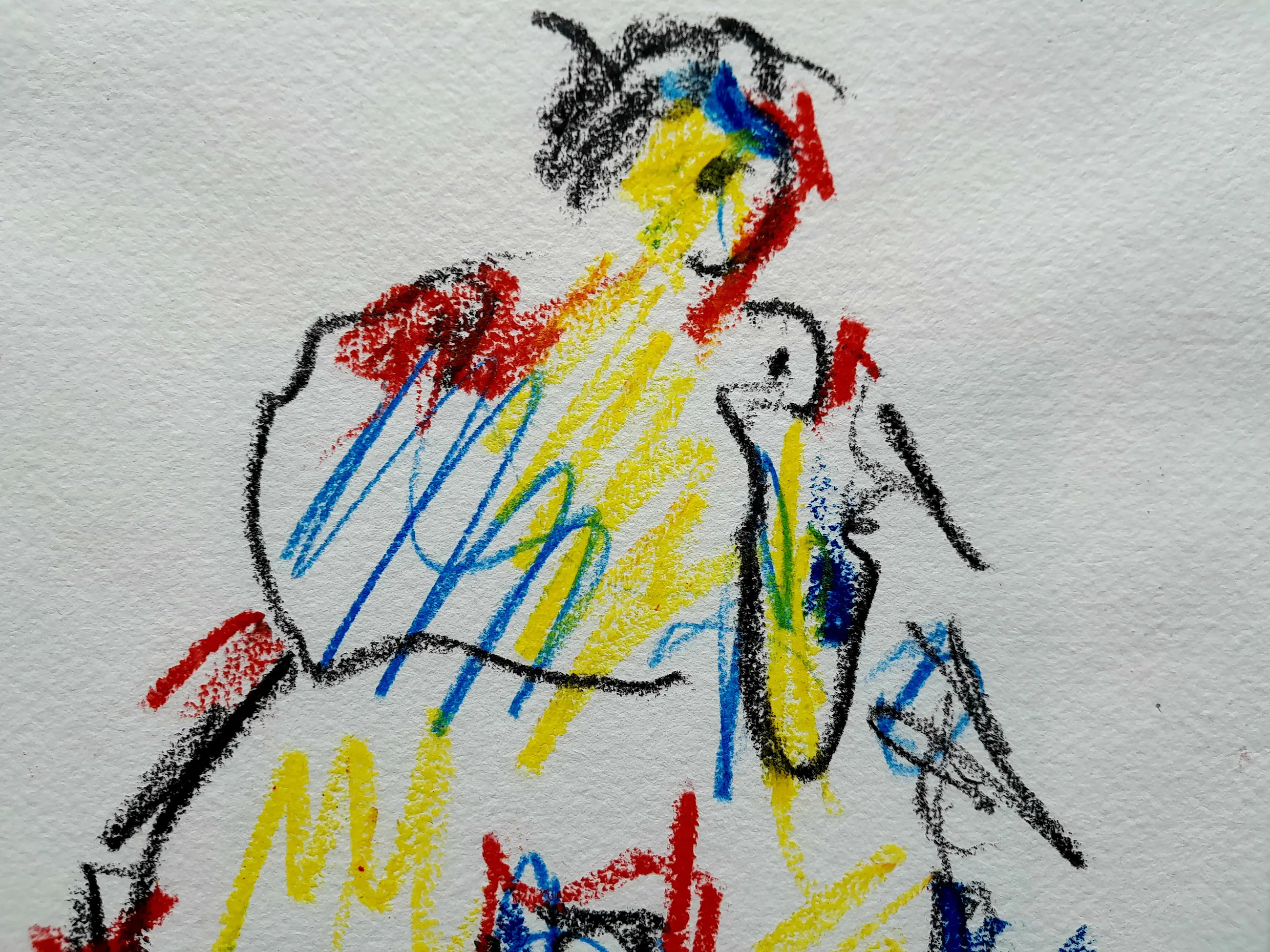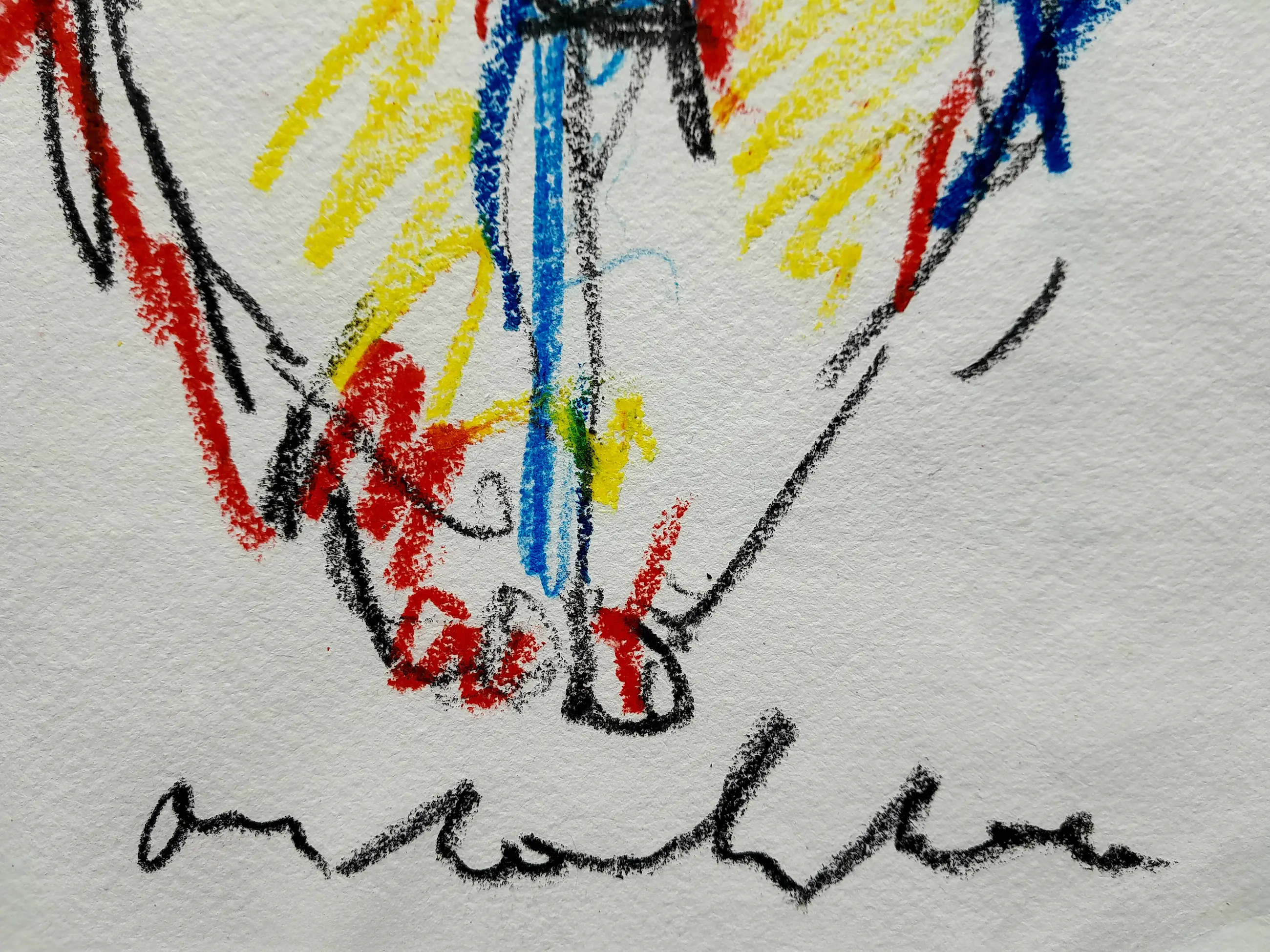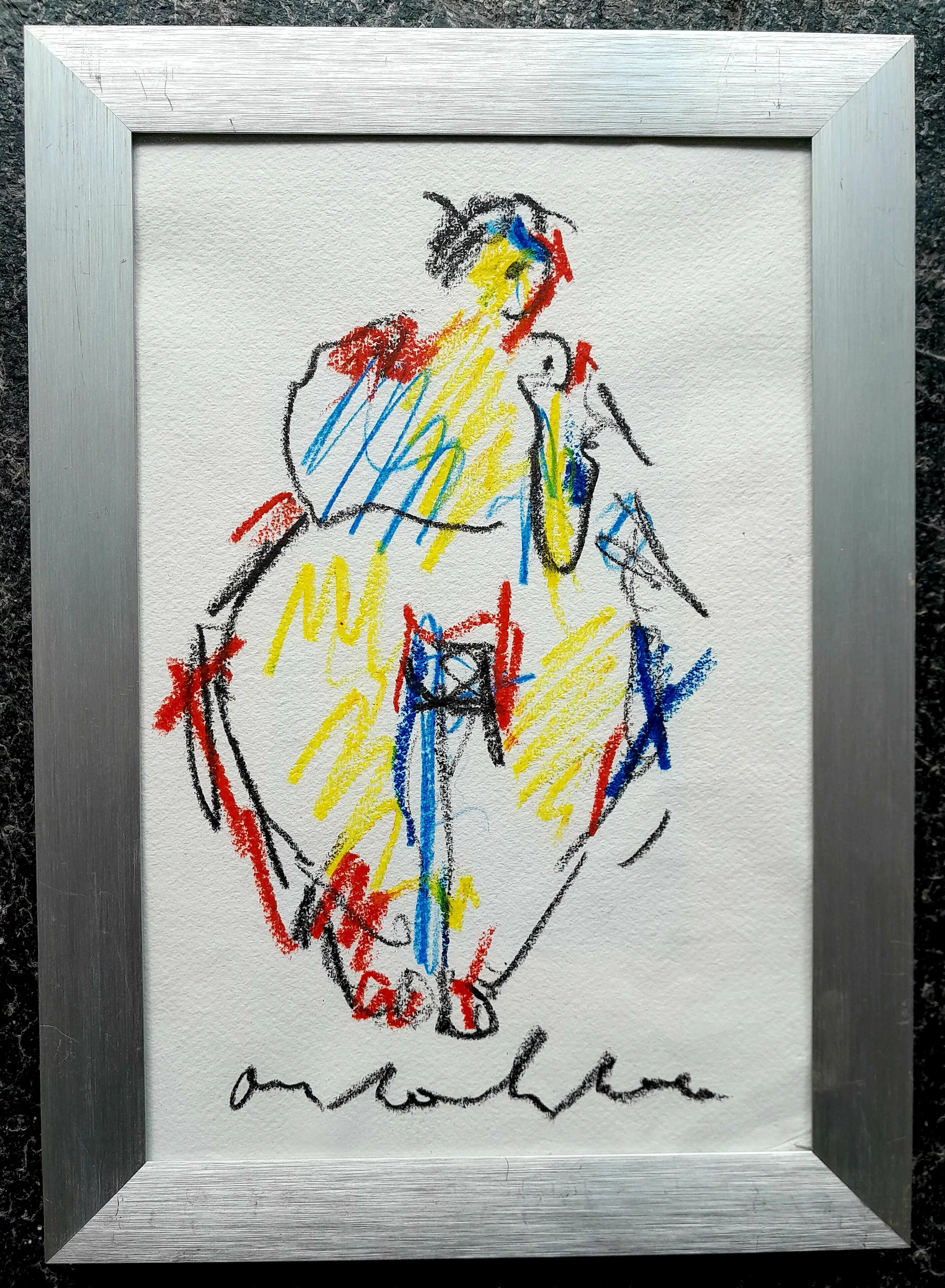 Moeder met kind met krijt uit 1996 van Anton Heyboer. Formaat 35 x 26 cm. Het werk is in een eenvoudige aluminium lijst gezet met wat lichte gebruikssporen. Wordt aangetekend verzonden.