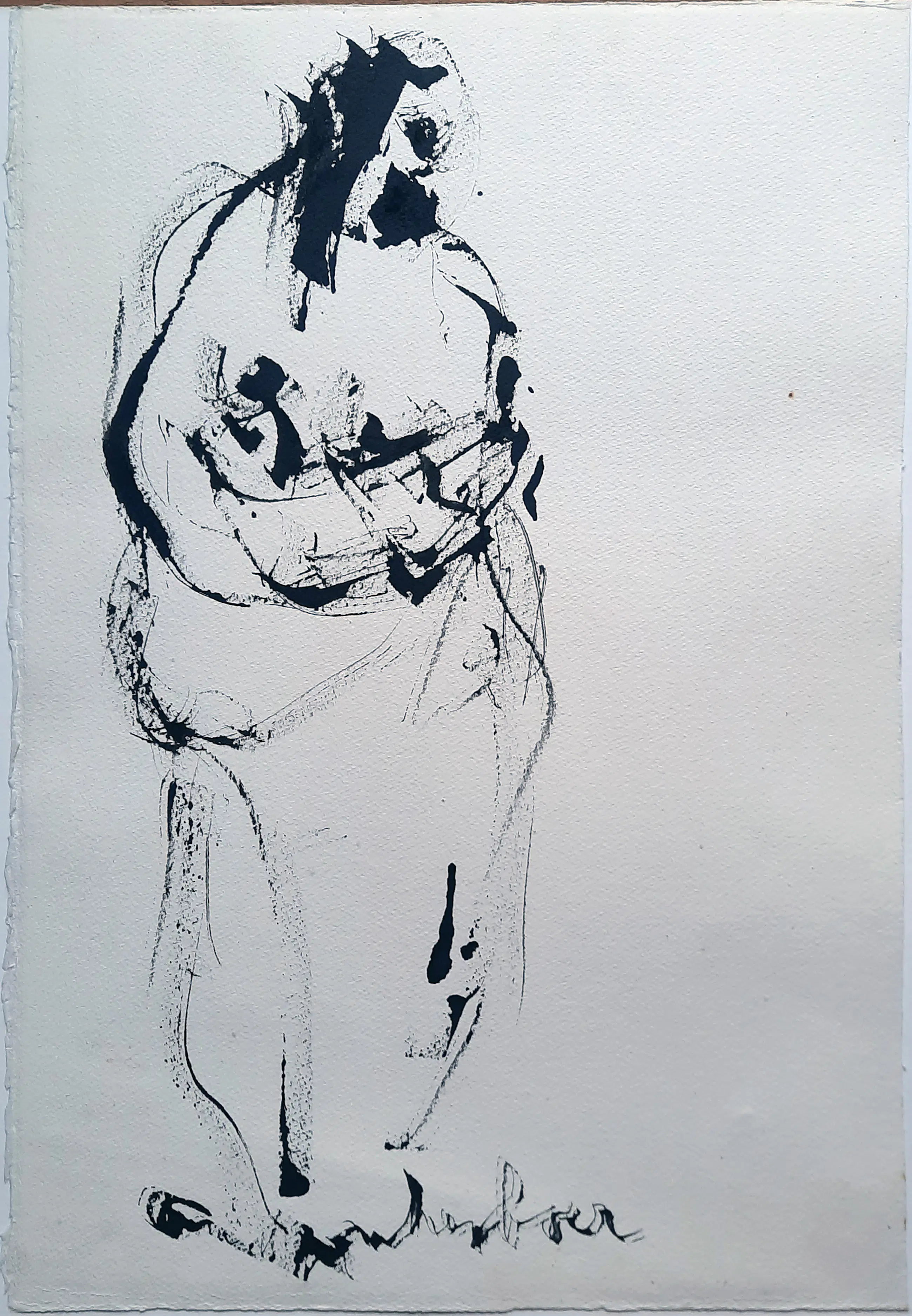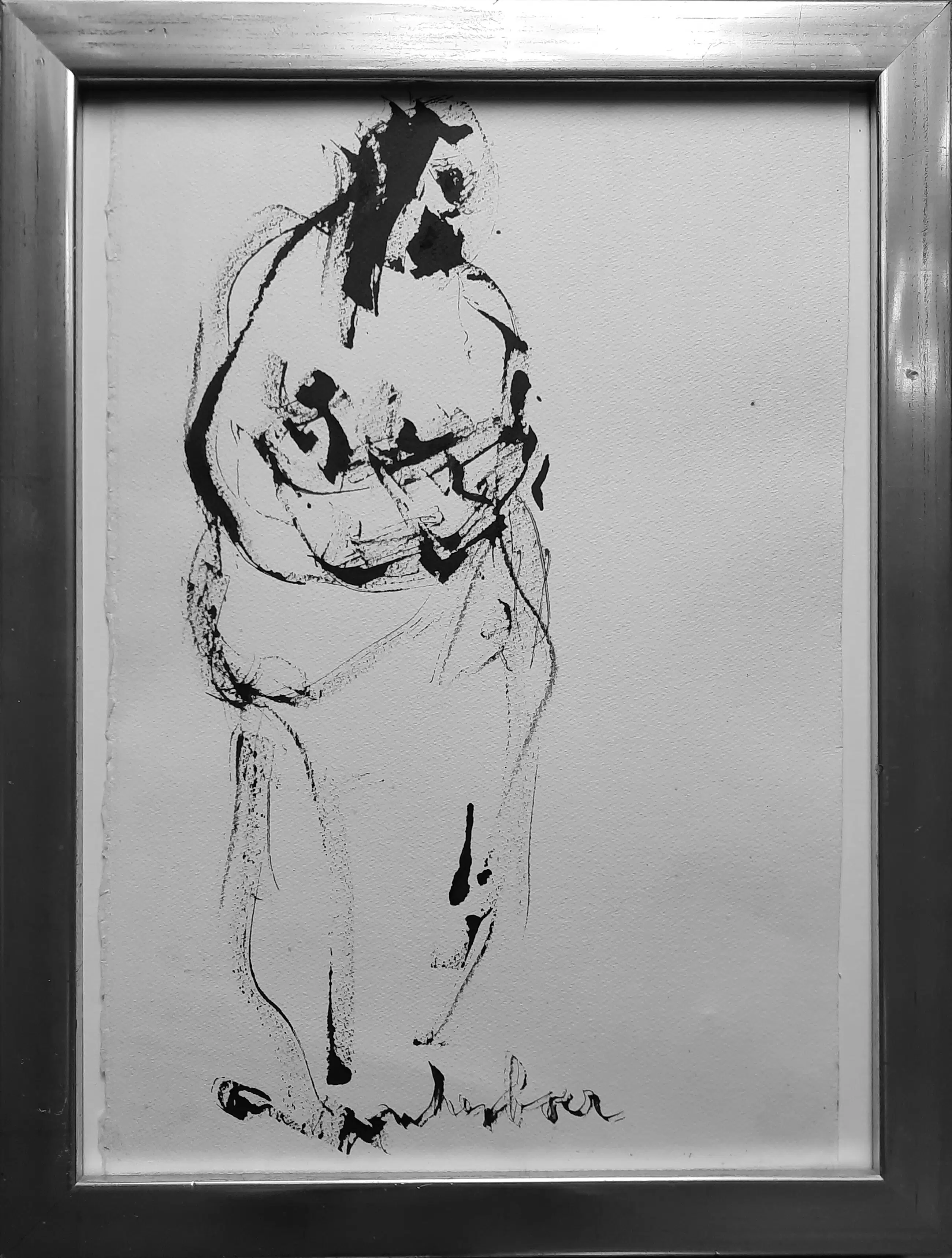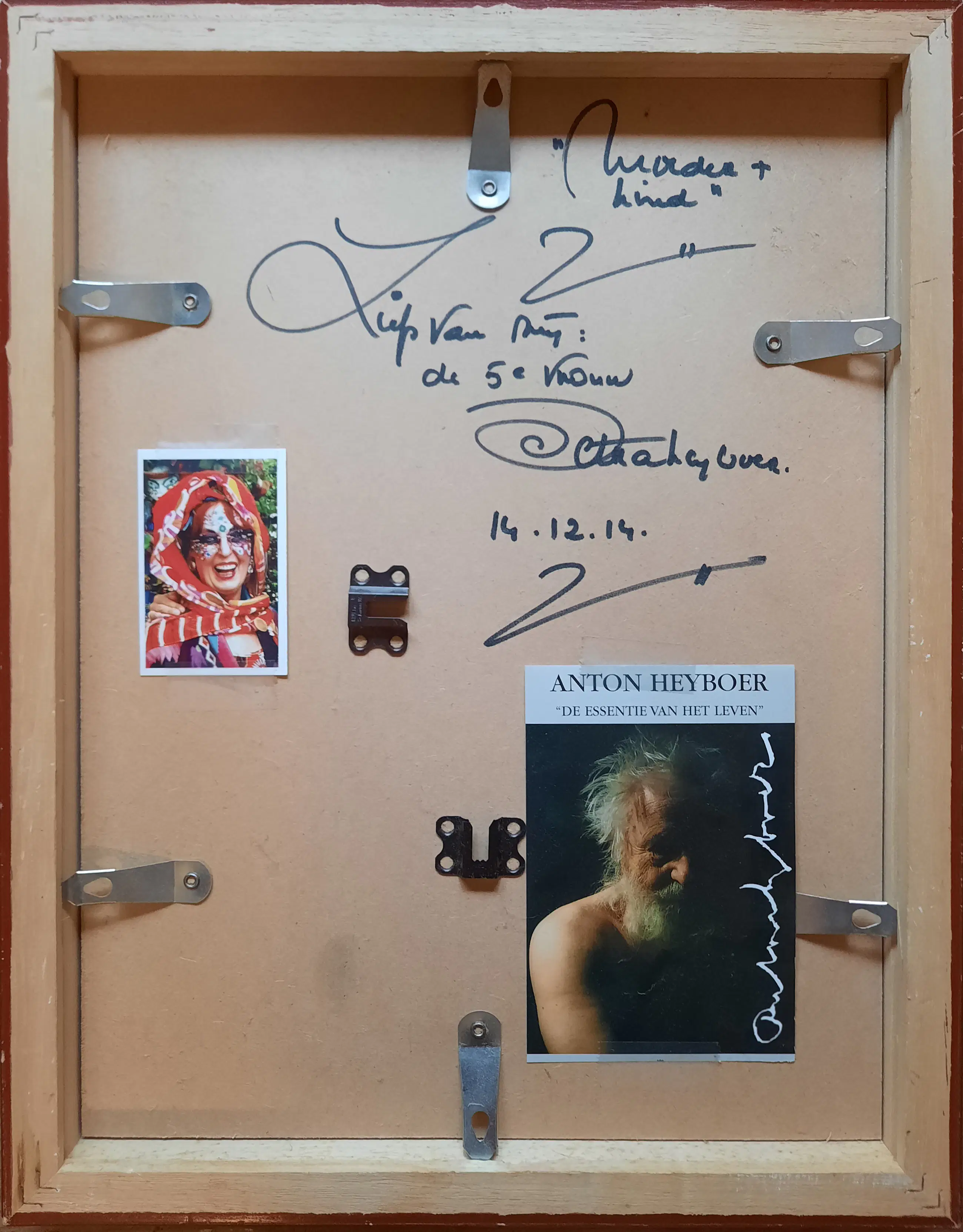 In houten zilverkleurige lijst achter glas op geschept papier. Uitsnede 40 x 30 cm. Met bericht op de achterzijde van de 5de vrouw: Petra.