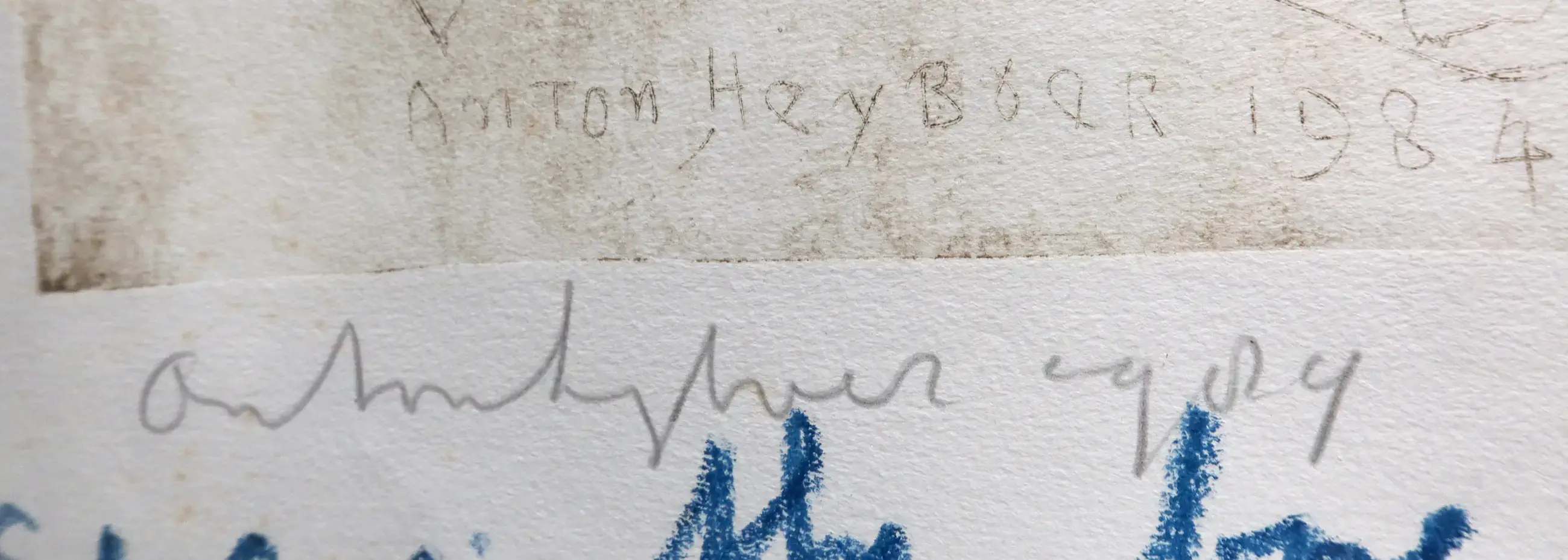 Ets van Anton Heyboer dat is na bewerkt met krijt. Heyboer heeft het werk zowel druk gesigneerd (en gedateerd) als later opnieuw met de hand.