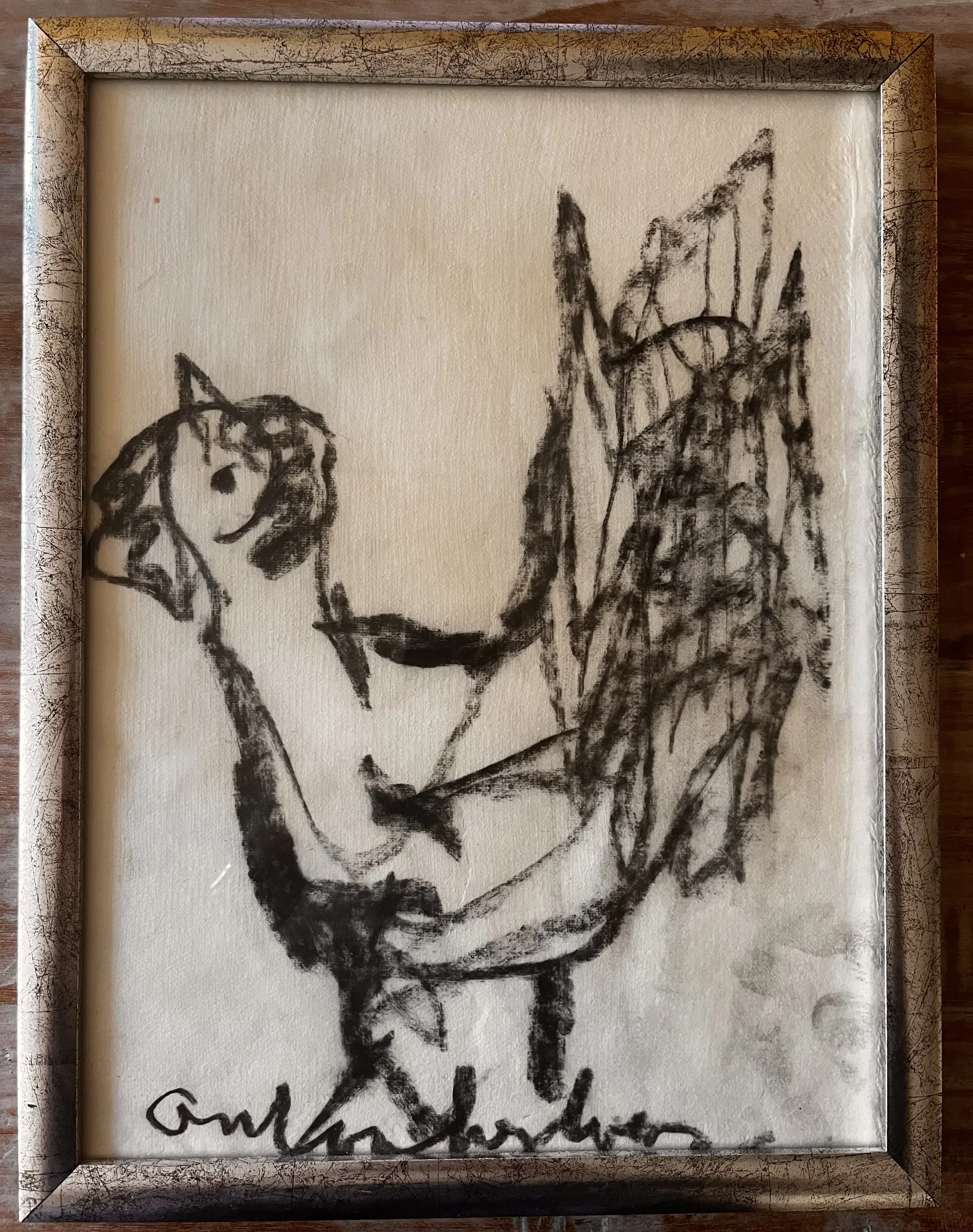 Leuke tekening met de bekende Oervogel/kip van Anton Heyboer. Tekening is ingelijst gekocht. Zal opnieuw moeten worden ingelijst, want is naar mijn mening te krap ingelijst. Aan de achterzijde is een rand van het papier zichtbaar, die zit geklemd tussen de lijst. Opnieuw inlijsten, waarbij het (ruwe) papier geheel zichtbaar is, is volgens mij veel mooier met een mooie passe-partout er omheen.