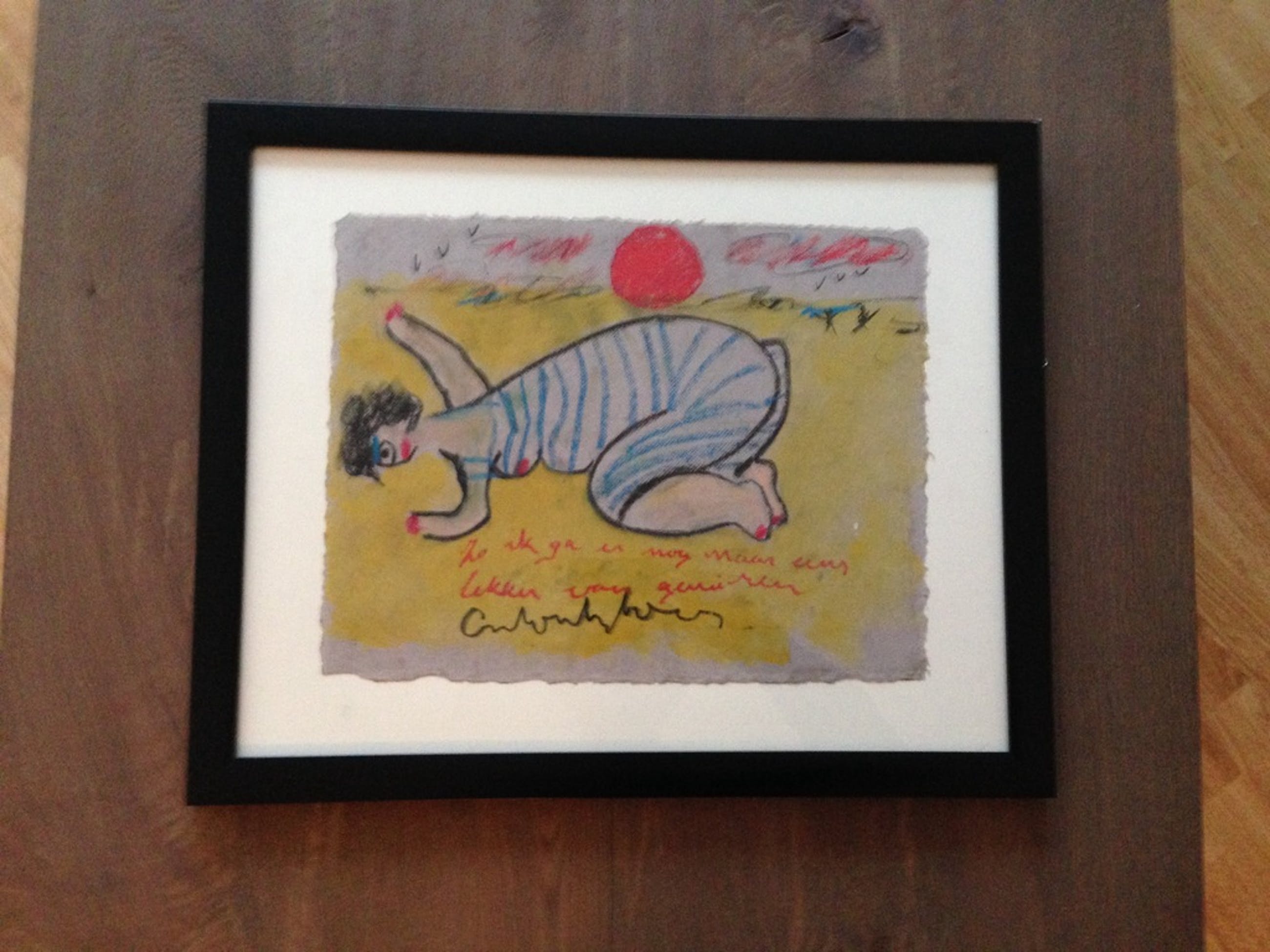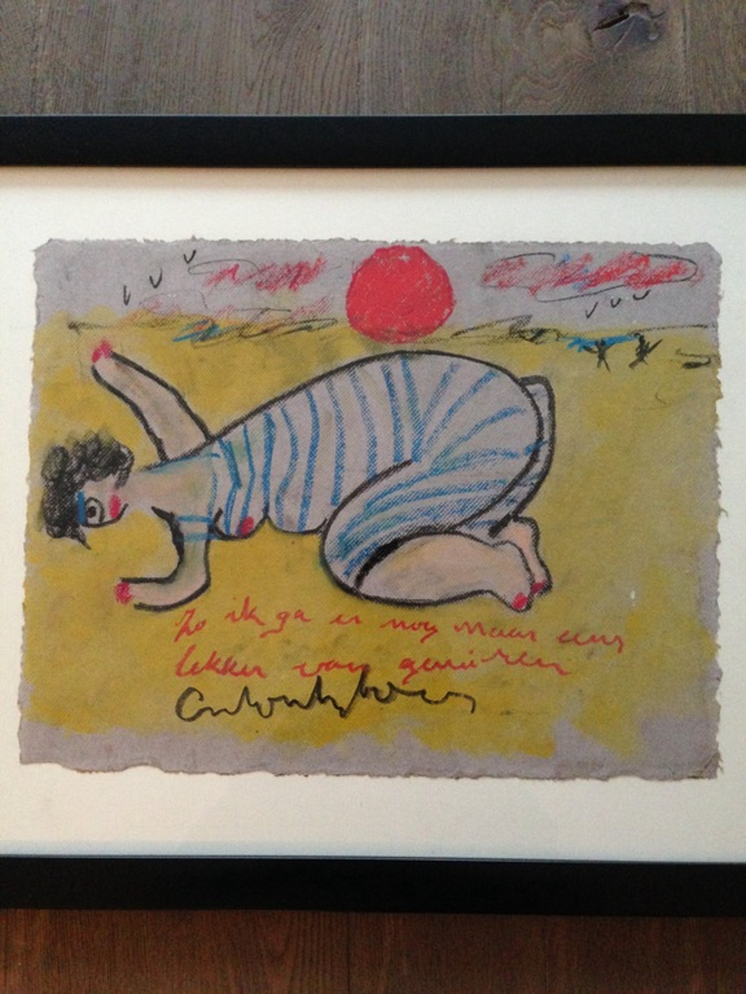 Mooi origineel kleurrijk werk van Anton Heyboer in lijst. Leuke voorstelling van en Dikke dame op het strand. Het werk is voorzien van een nette lijst en is ook voorzien van tekst.
