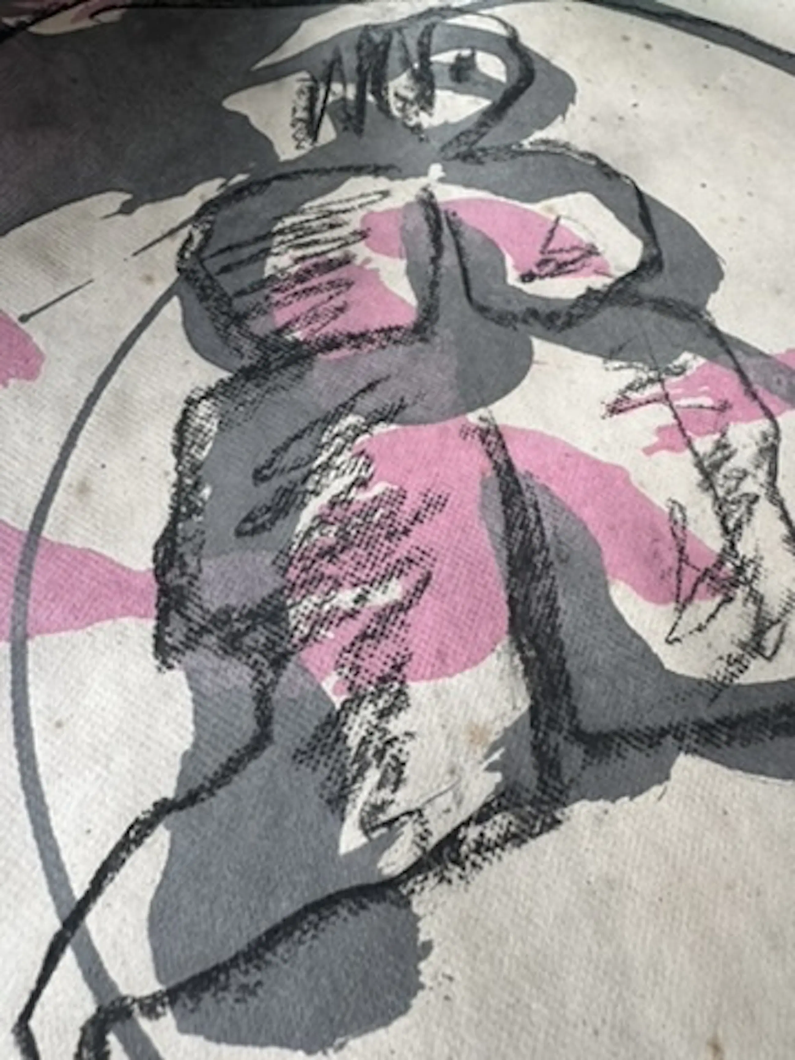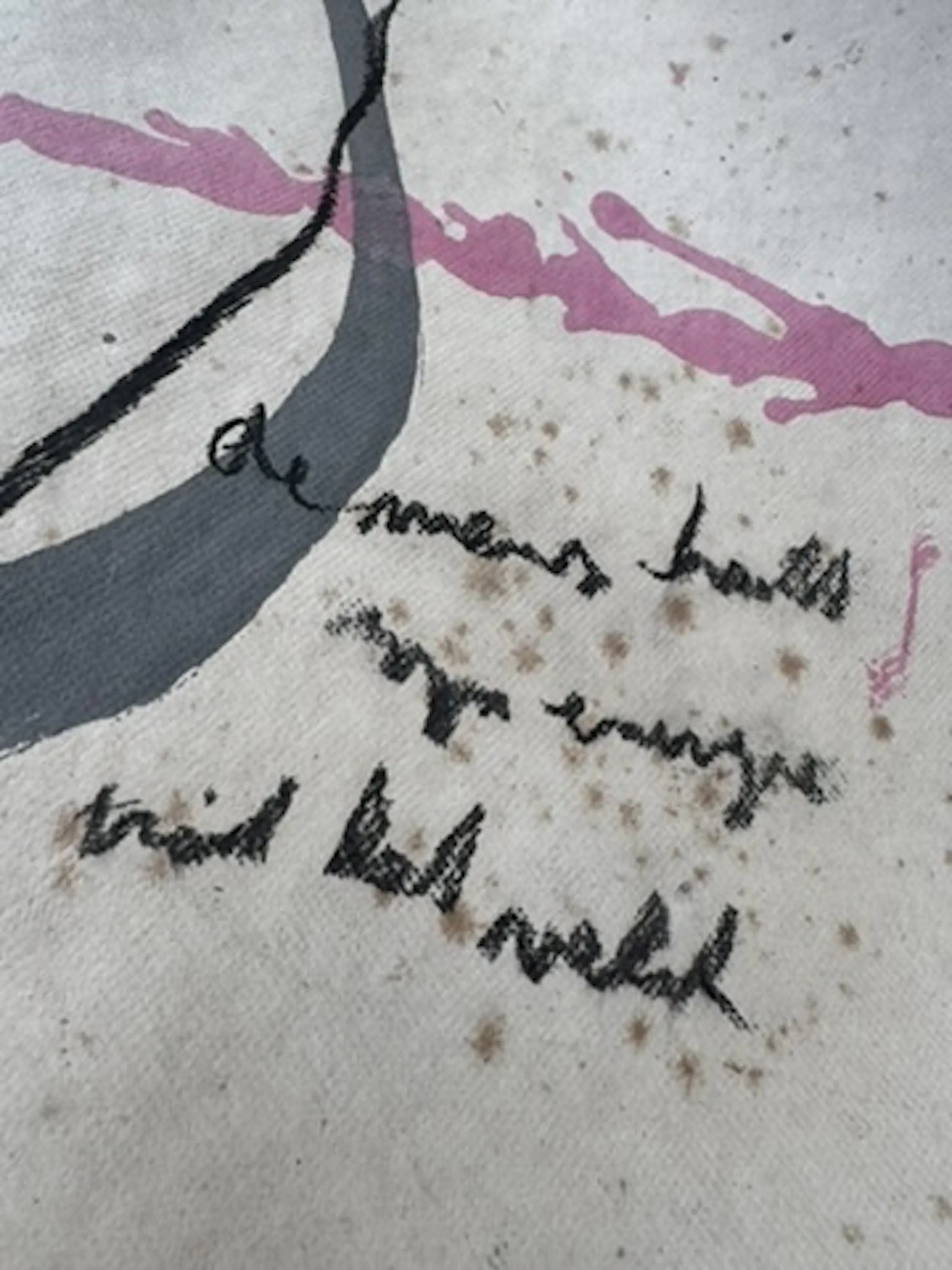 De voorstelling toont een expressieve, bijna primitieve figuur, omsloten door een krachtige zwarte cirkel. De combinatie van inkt, roze verf en later toegevoegde houtskool geeft het werk een rauwe, directe energie. De handgeschreven tekstfragmenten – kenmerkend voor Heyboers denken en werken – versterken het conceptuele karakter.