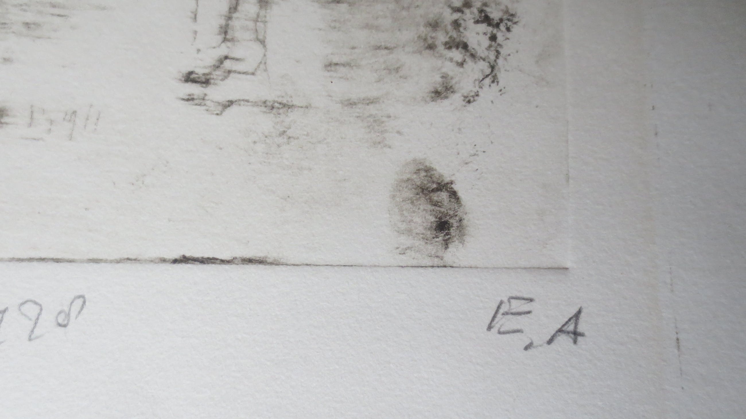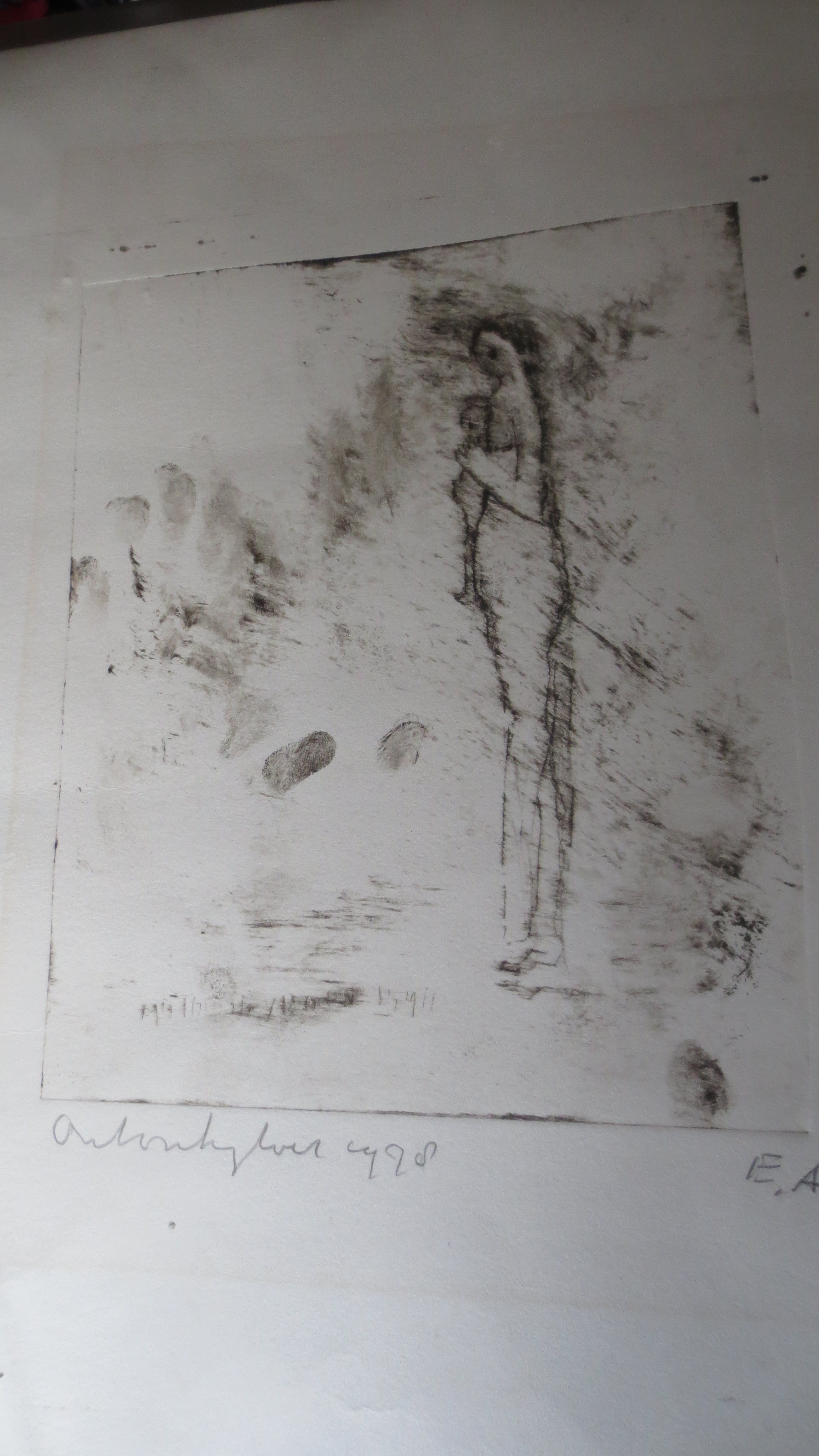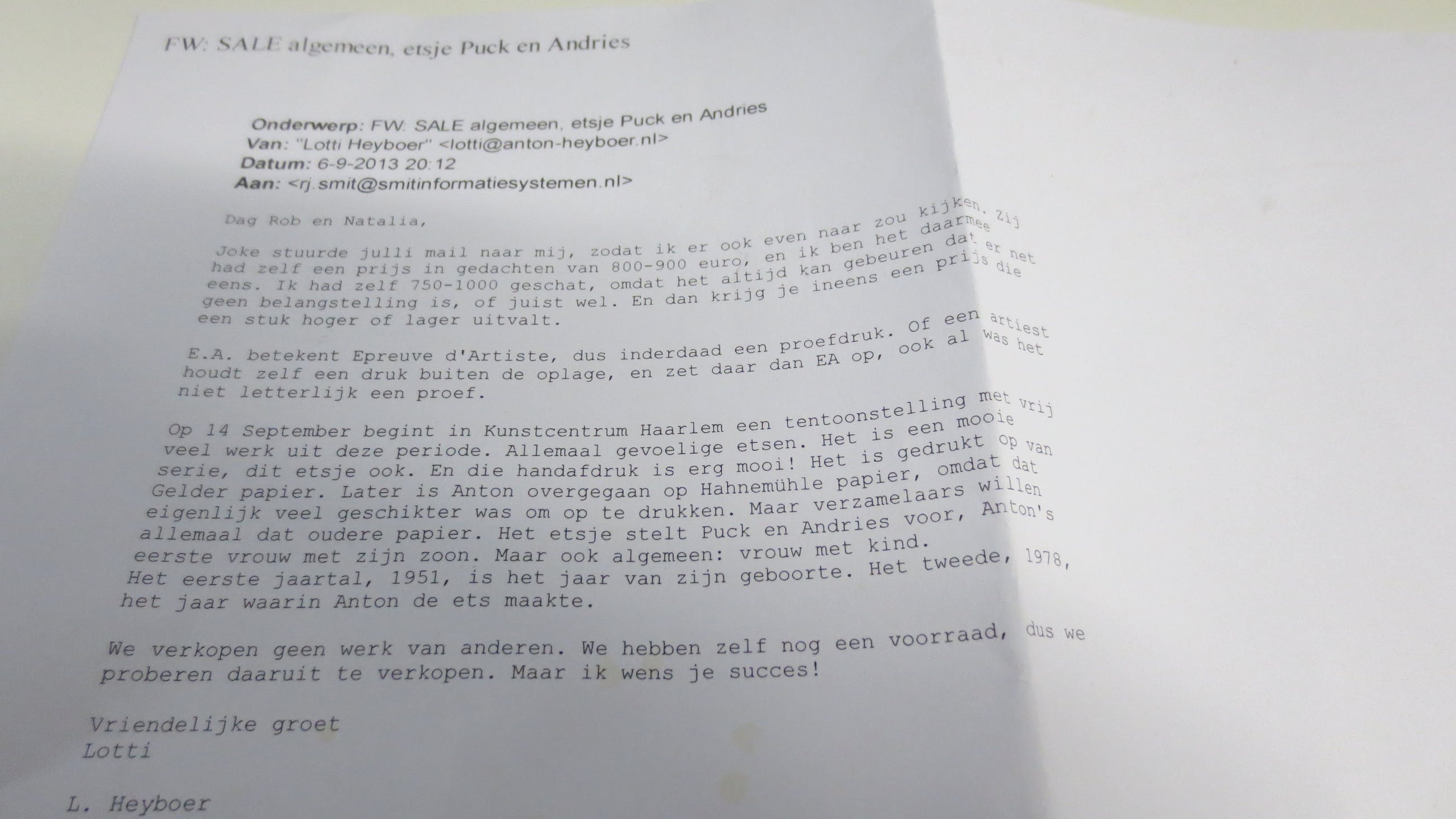 Bij deze ets is een brief van Lotti Heyboer over subject - Anton's eerste vrouw Puck met zijn zoon Andries. en uitleg over datum's