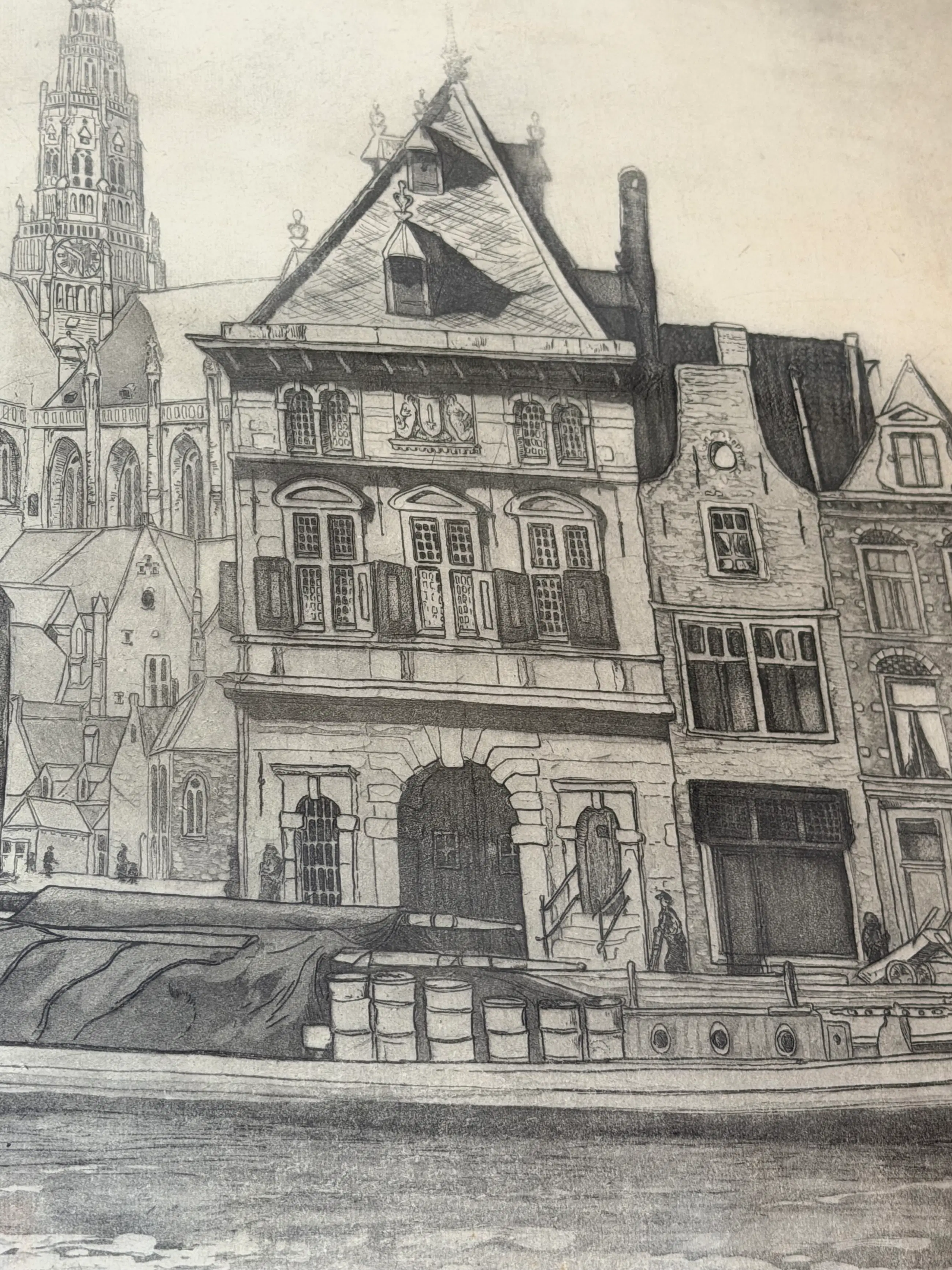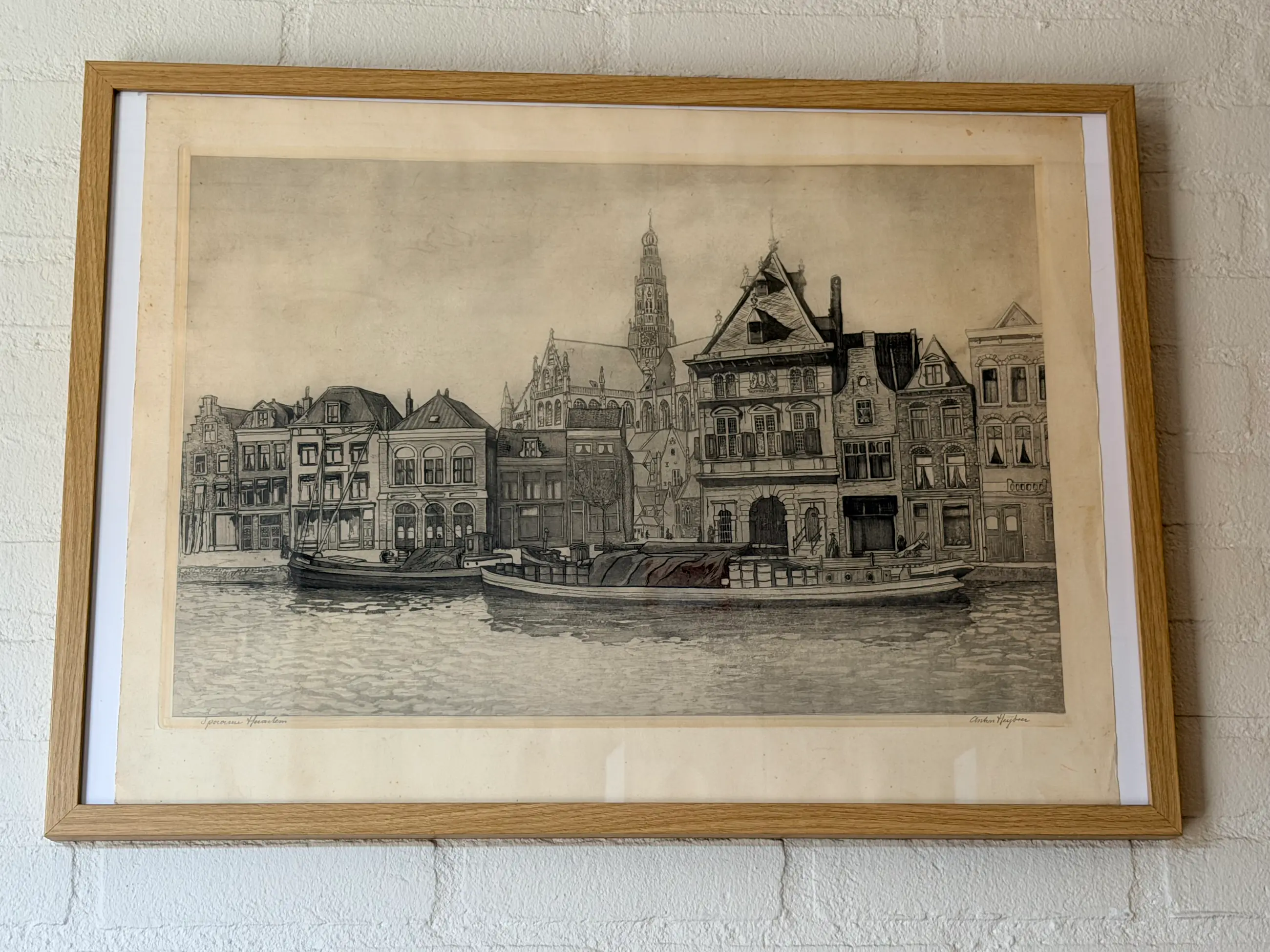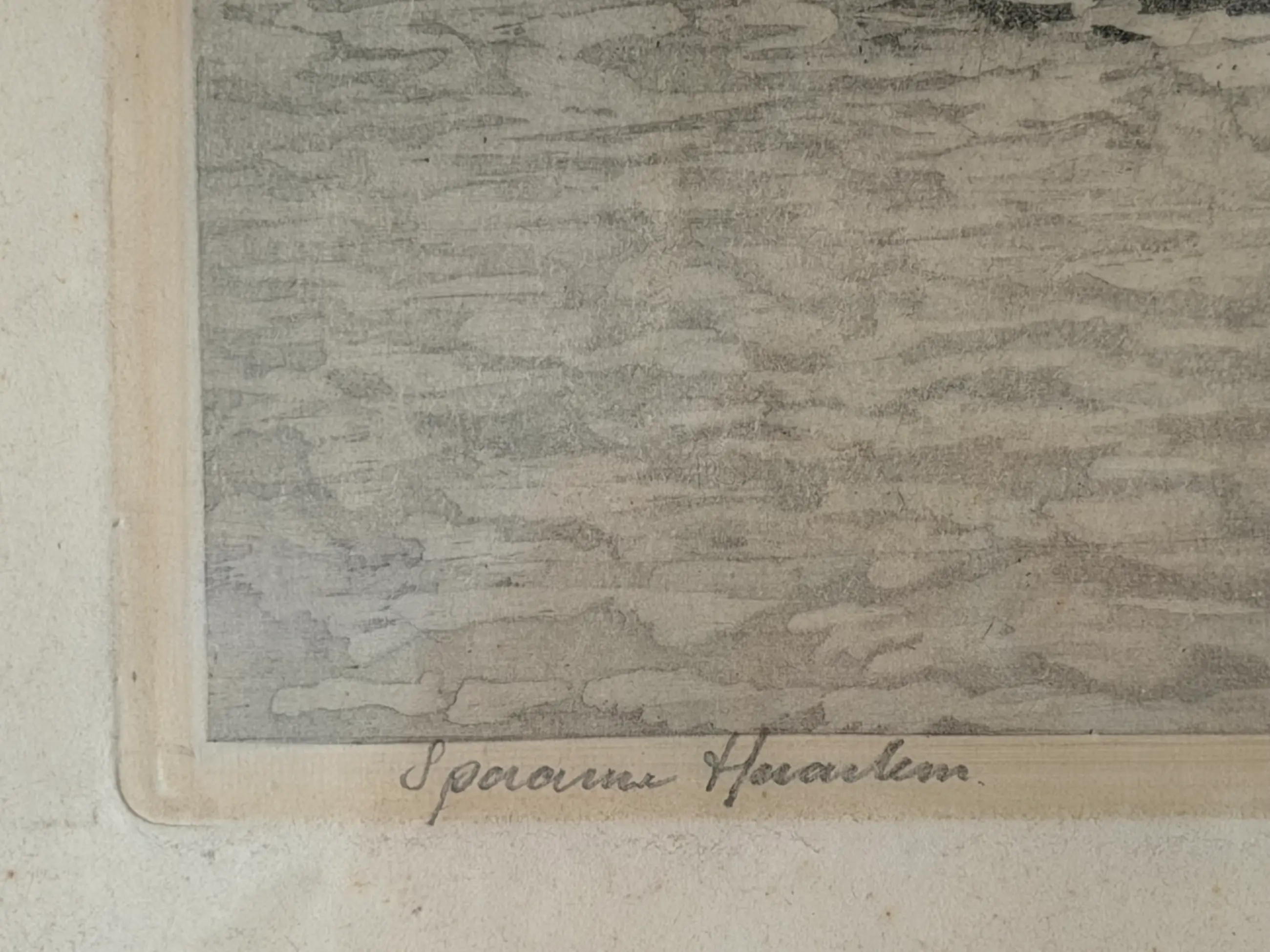 Anton Heyboer (1925 - 2005) Titel ets : Spaarne Haarlem Ets : Niet ingekleurde ets. Afmeting papier : 64 x 48 cm. Afmeting ets. : 57.5 x 38 cm. Gedateerd : omstreeks 1948. Kunstenaar(s). : Anton Heyboer Signatuur ; rechts onder signatuur kunstenaar Naam ets. : links onder met potloot.