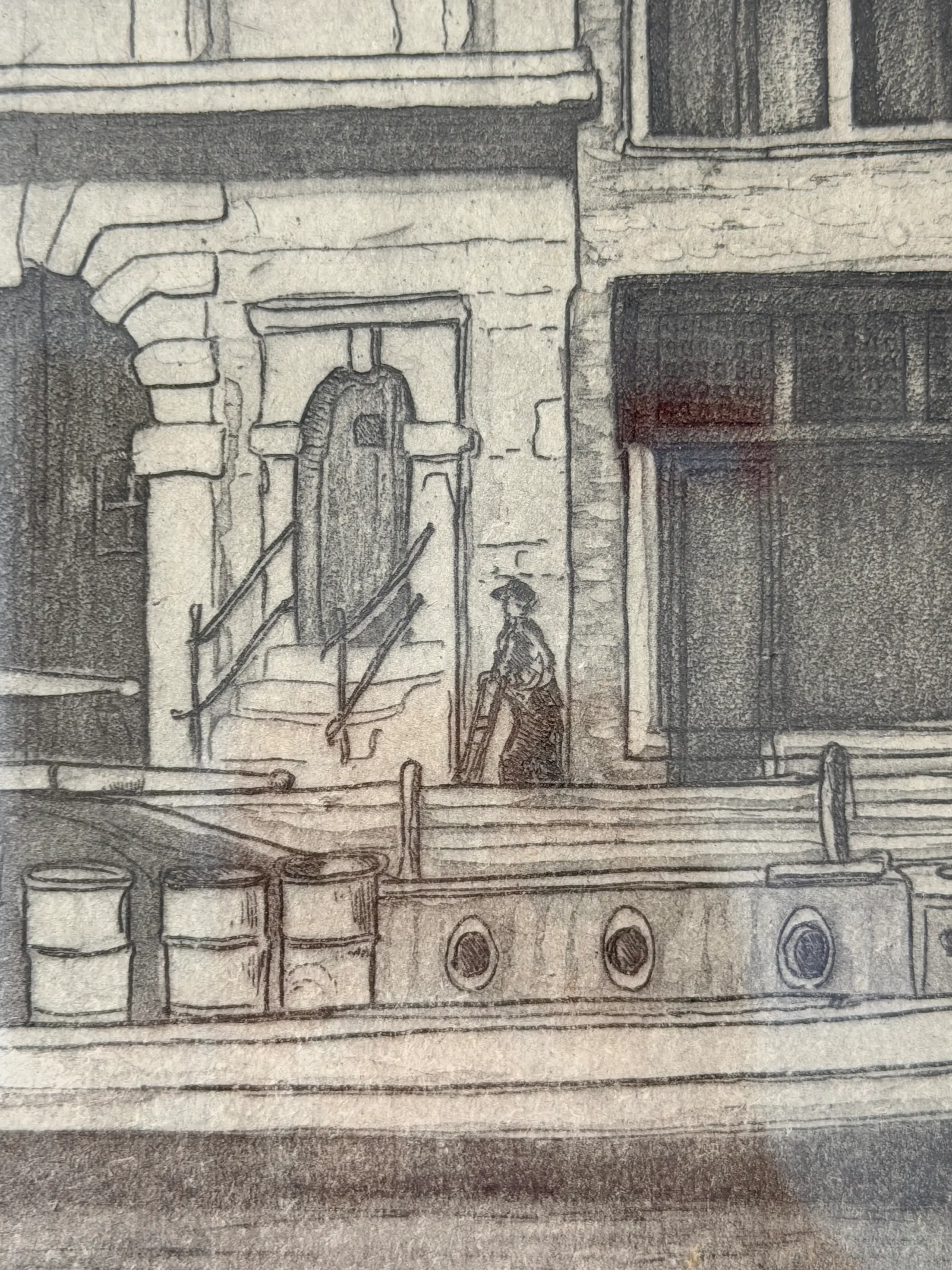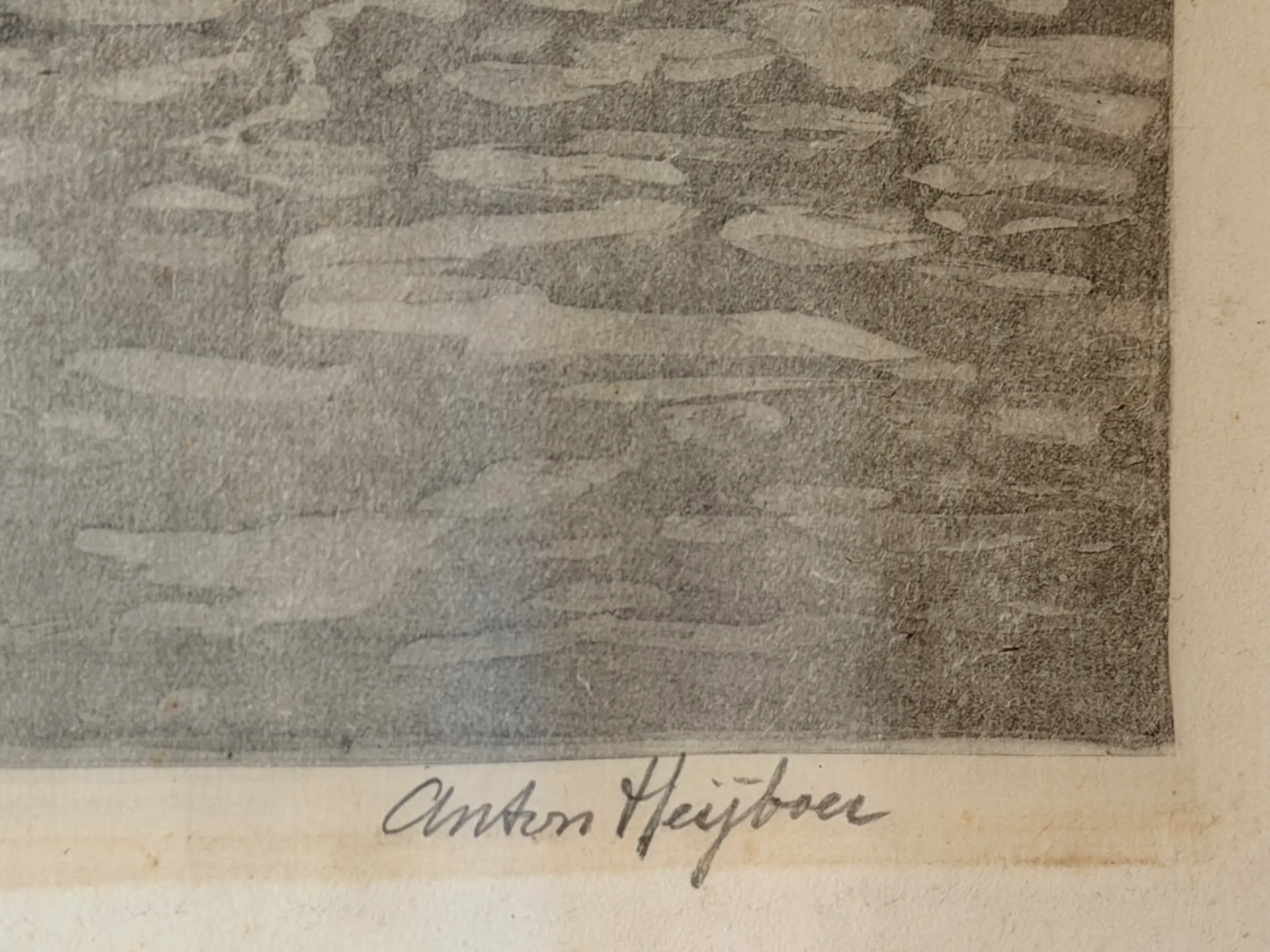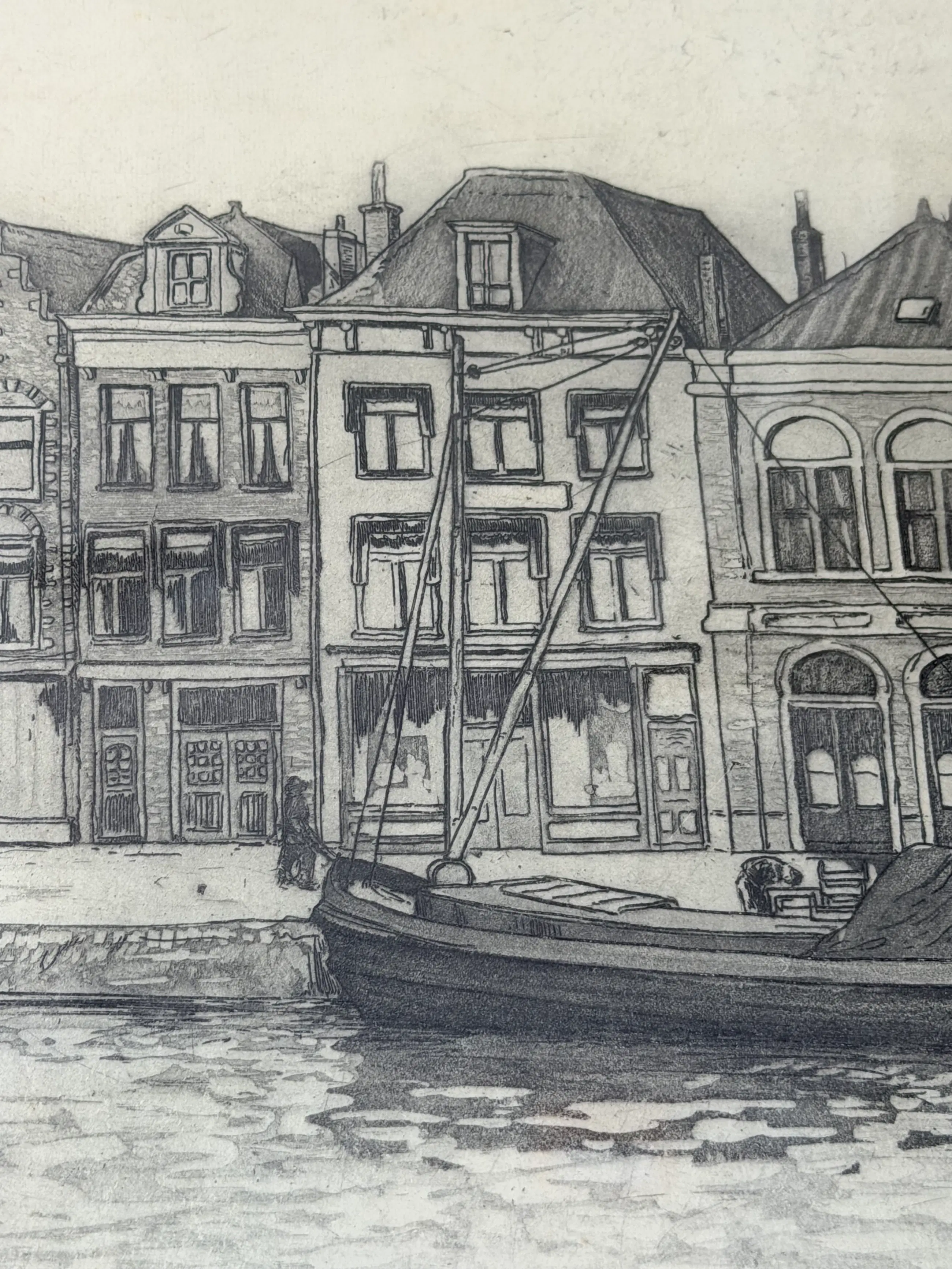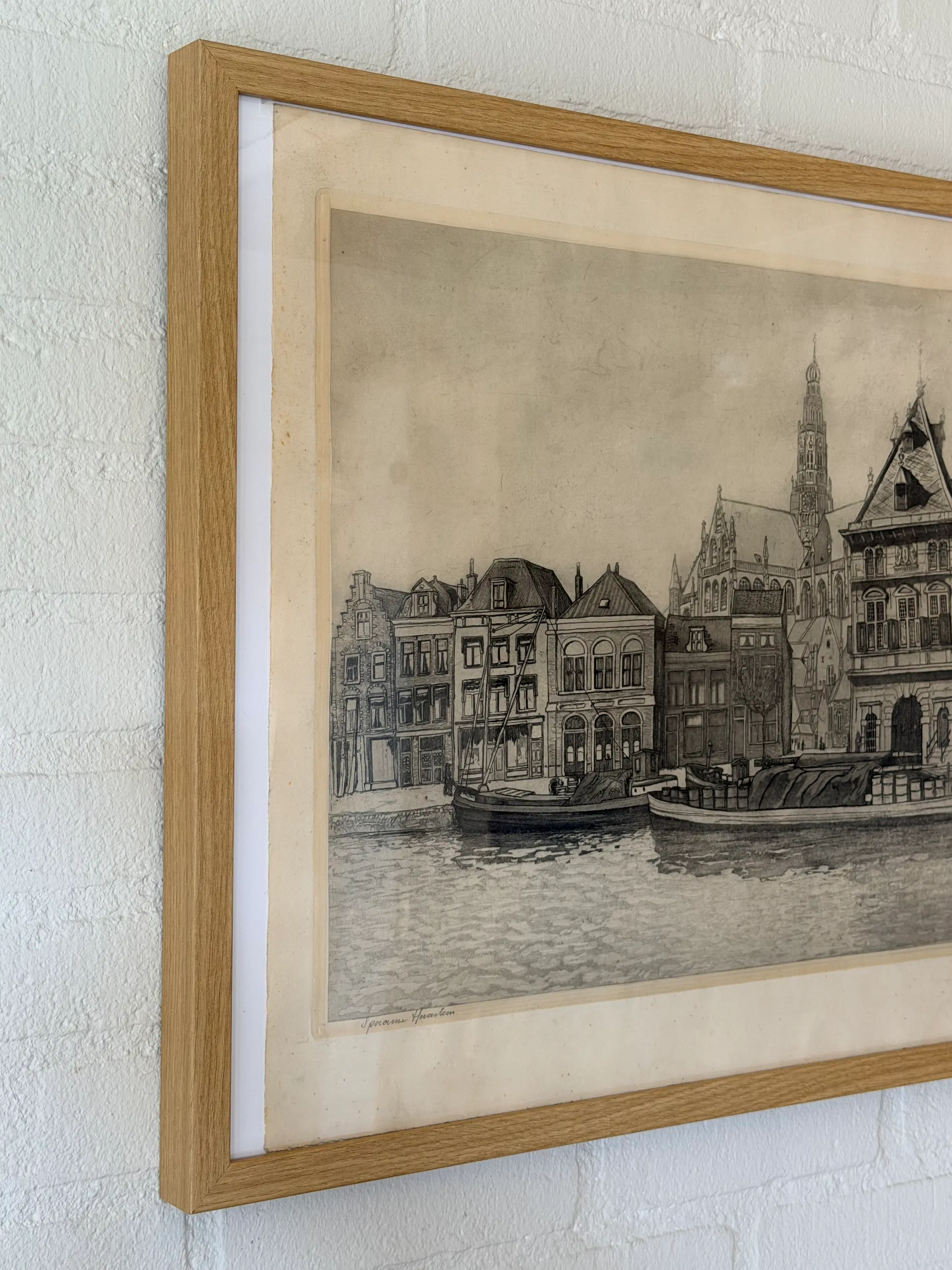 Anton Heyboer (1925 - 2005) Titel ets : Spaarne Haarlem Ets : Niet ingekleurde ets. Afmeting papier : 64 x 48 cm. Afmeting ets. : 57.5 x 38 cm. Gedateerd : omstreeks 1948. Kunstenaar(s). : Anton Heyboer Signatuur ; rechts onder signatuur kunstenaar Naam ets. : links onder met potloot.