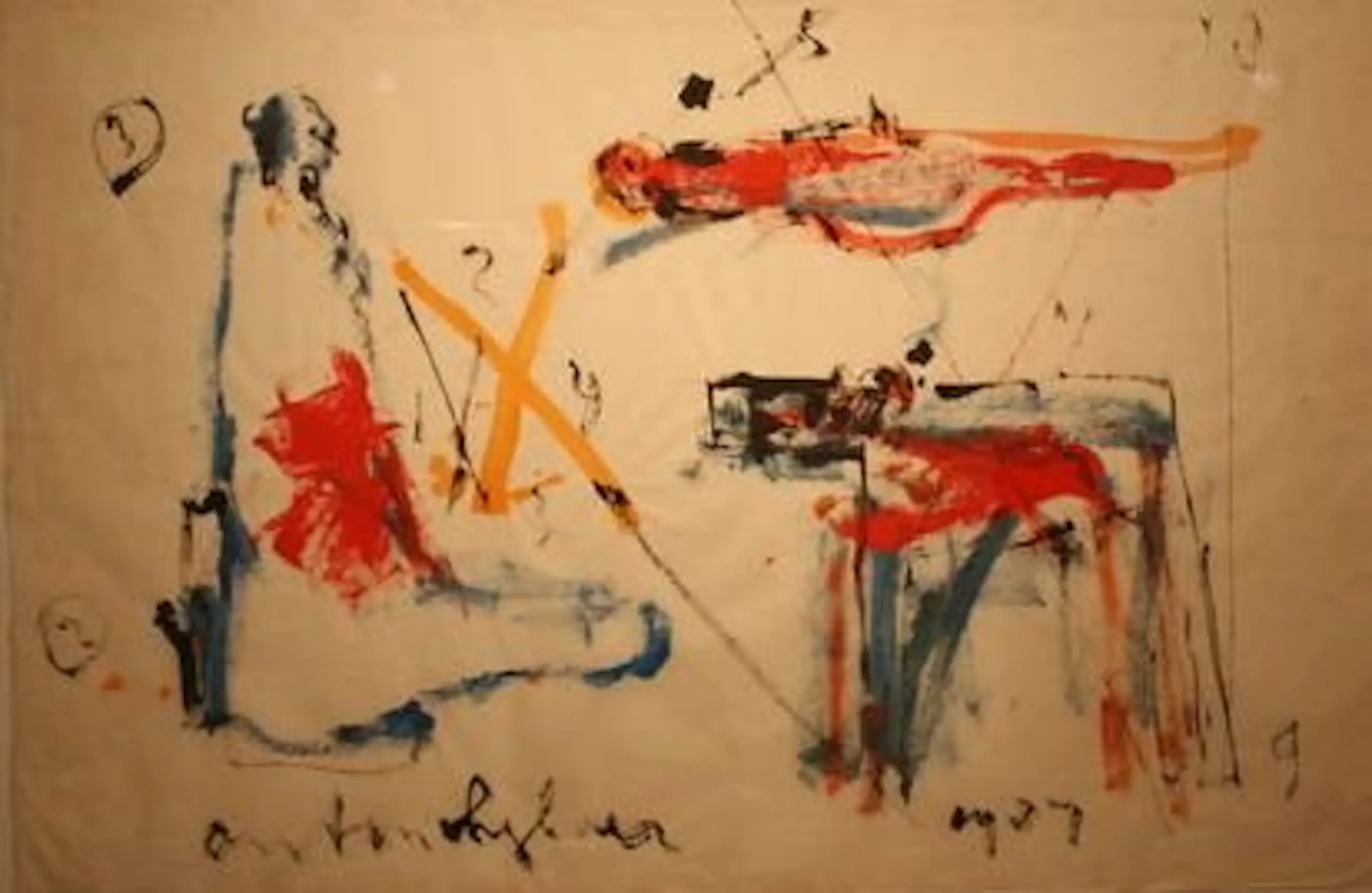 In dit werk zijn alle kenmerkende symbolen van Anton Heyboer weergegeven die hij ook in zijn vroege etsen plaatste: