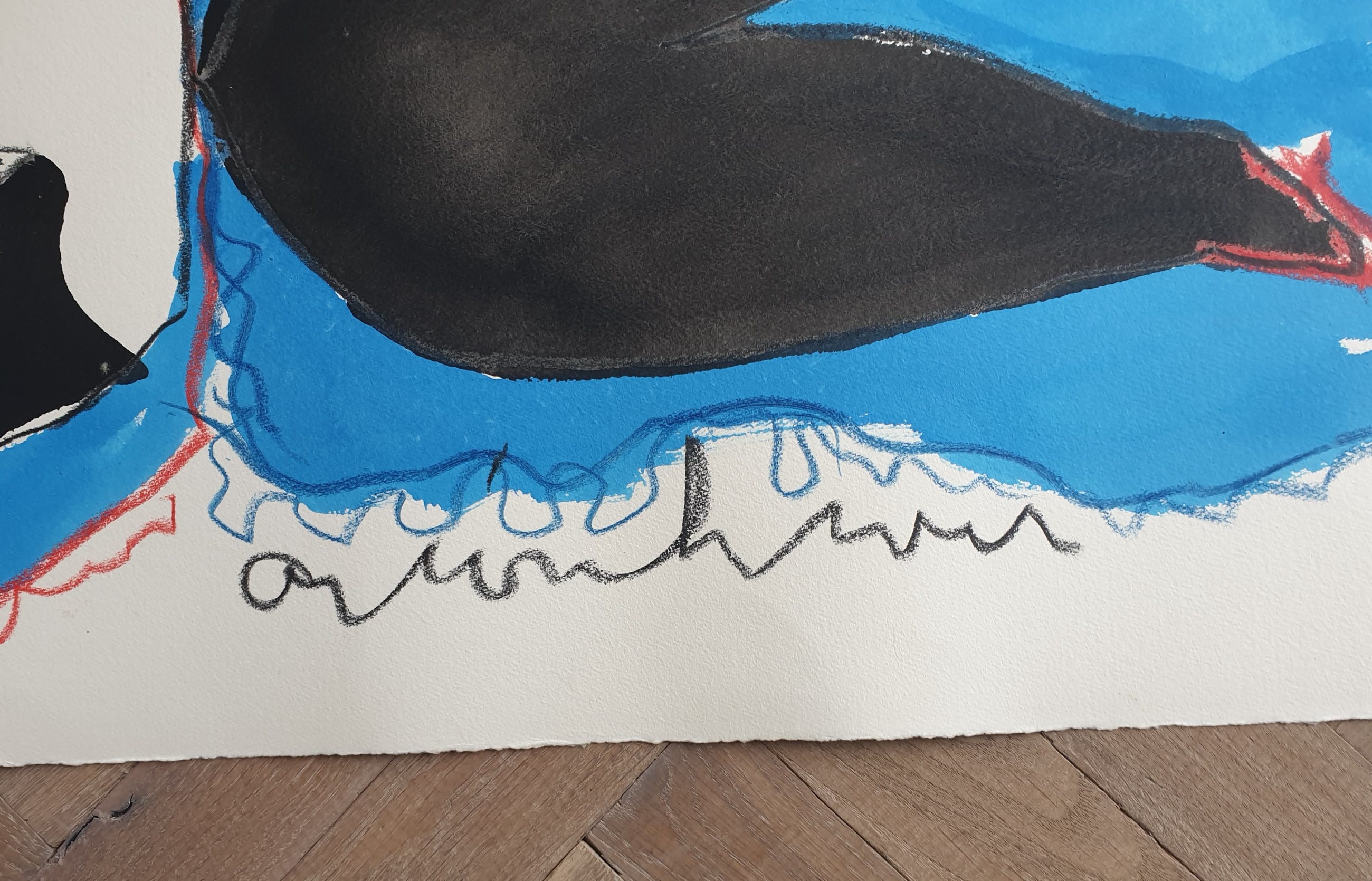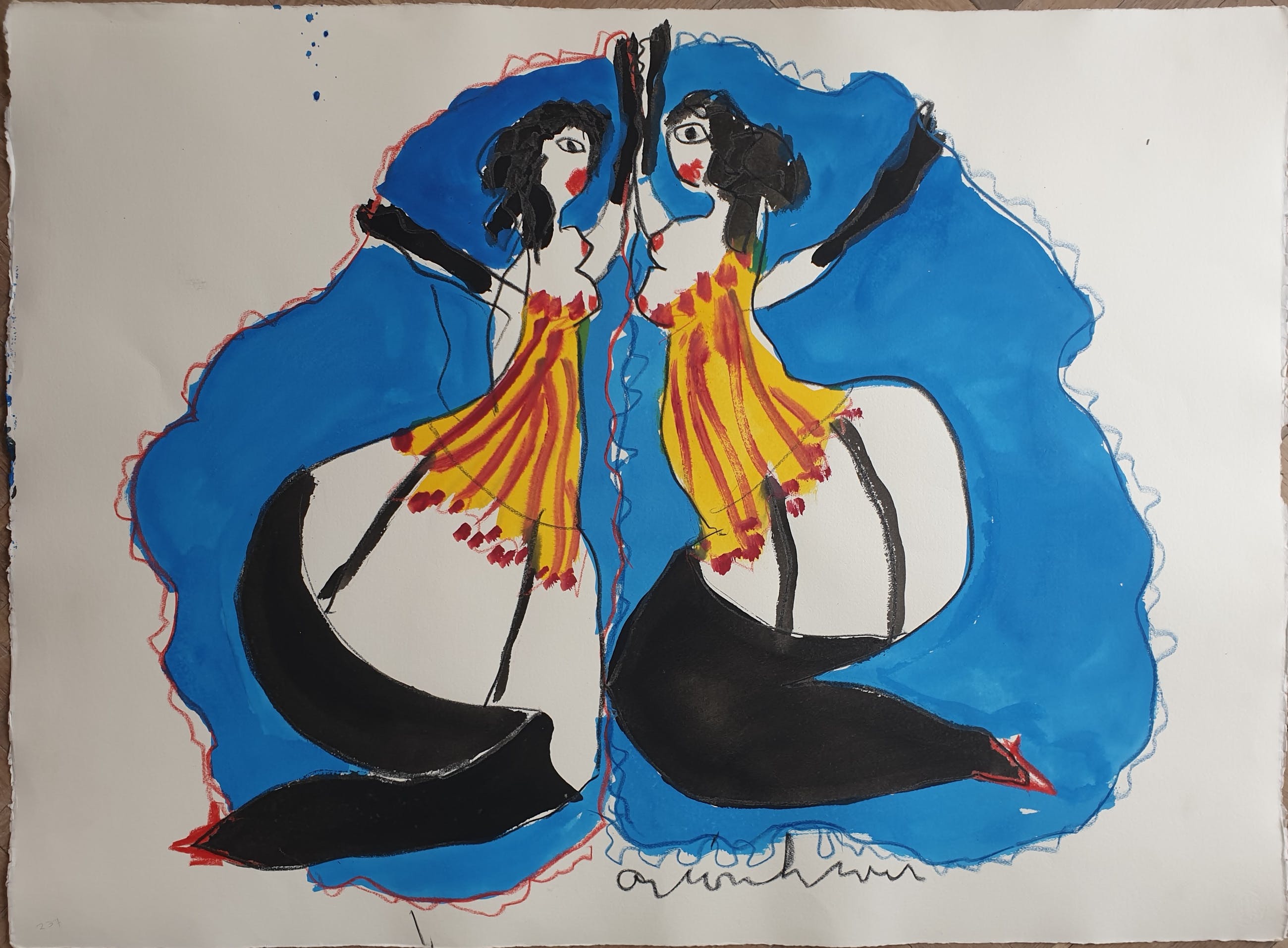 Gouache en krijt van Anton Heyboer. Twee Can Can danseressen die zijn geschilderd op dik "Hahnemühle" papier. Het werk meet 79 x 108 cm. Wordt is stevige koker verstuurd.