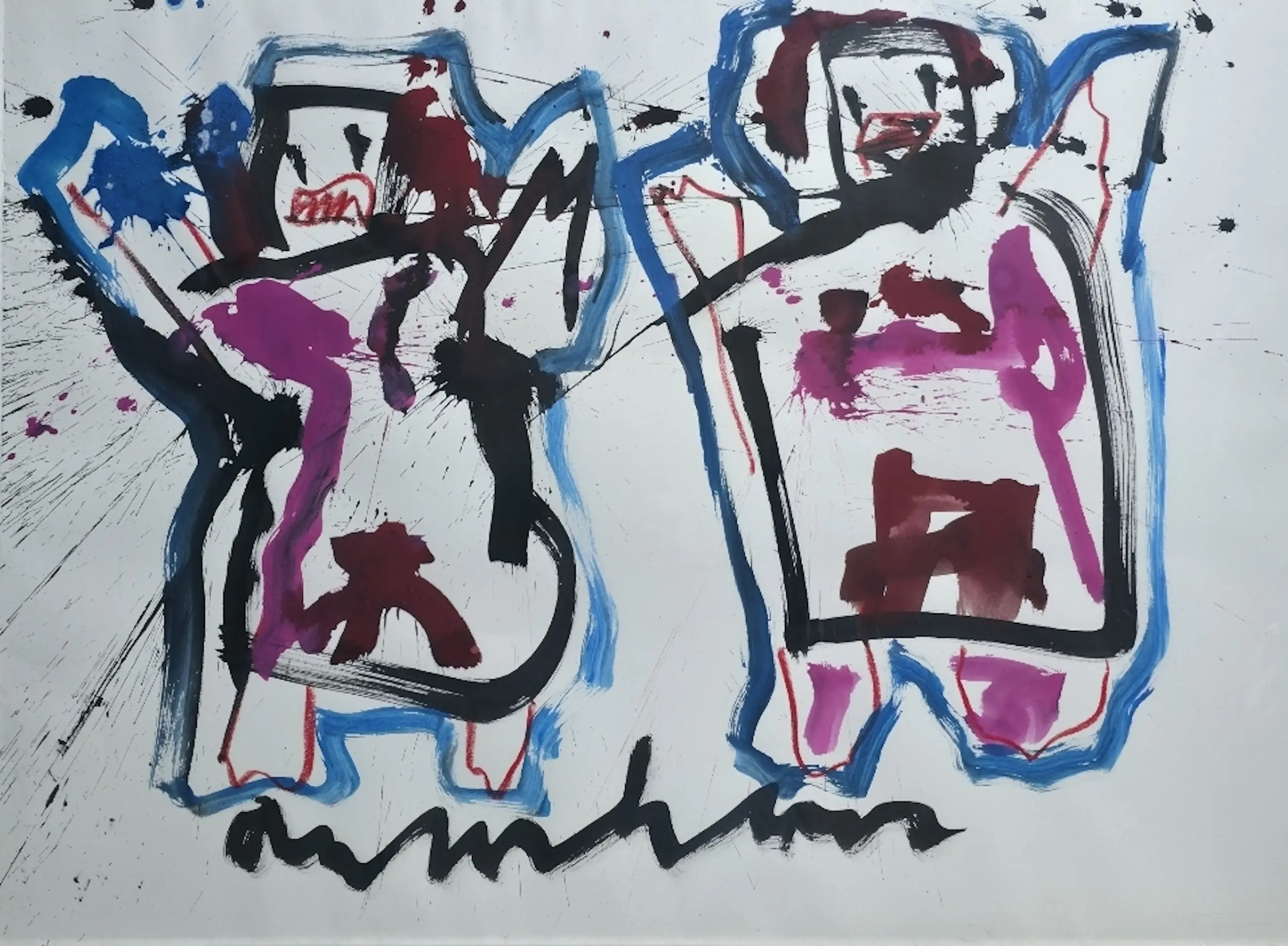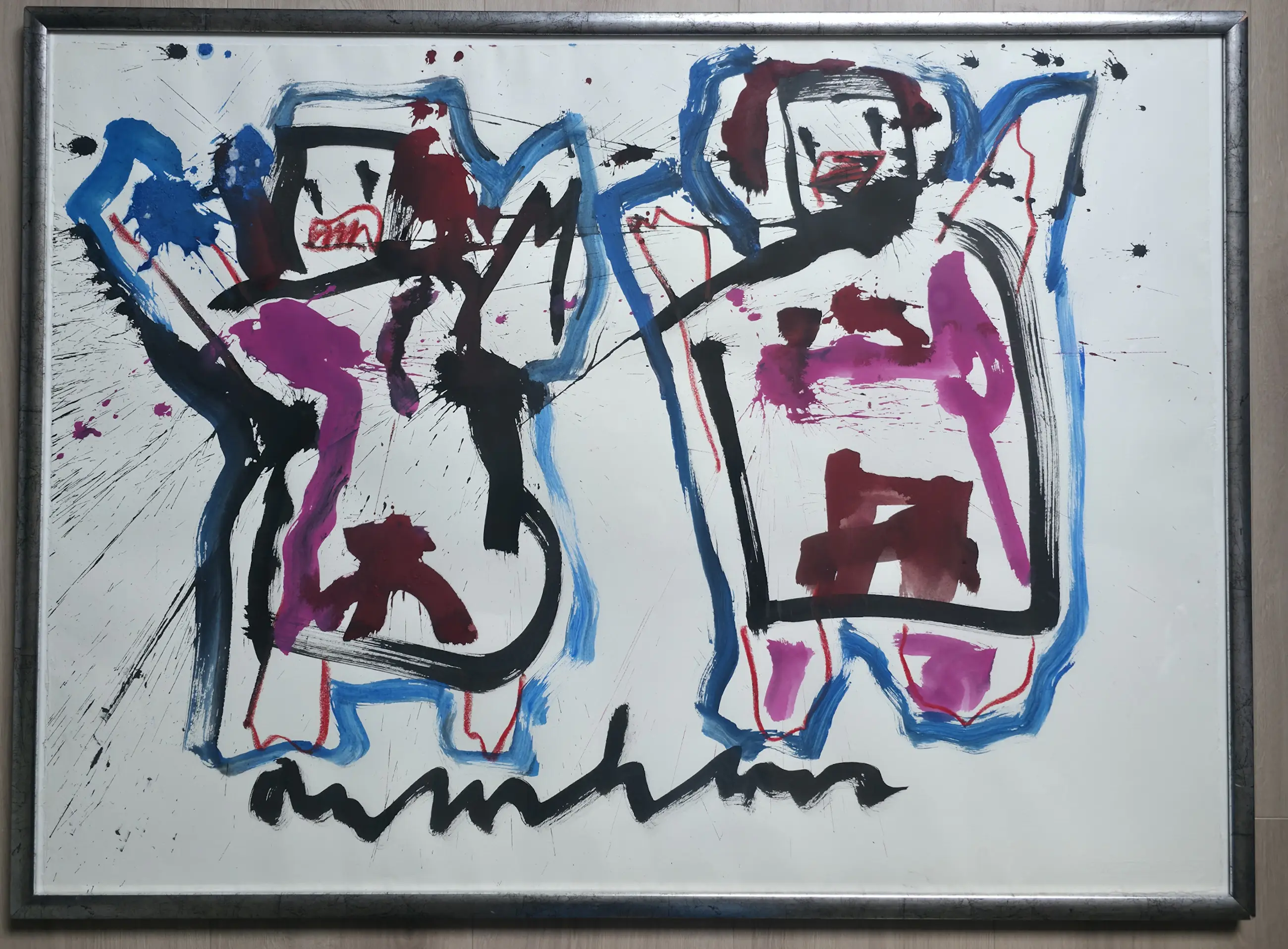 Titel: Twee figuren Signatuur: hand gesigneerd Techniek: gemengde techniek Afmeting beeld: 80 x 108 cm. Afmeting lijst: 83x113 cm.