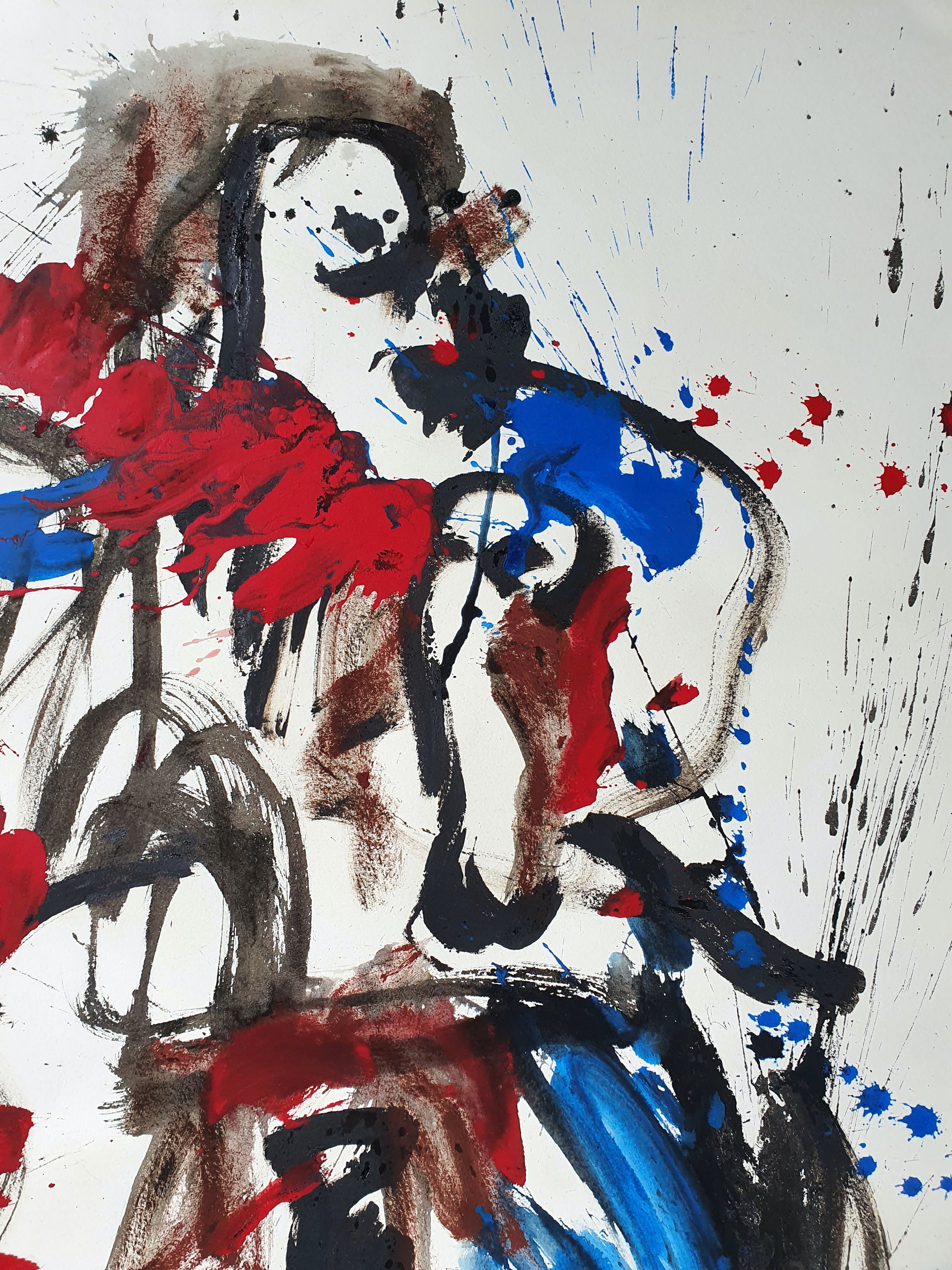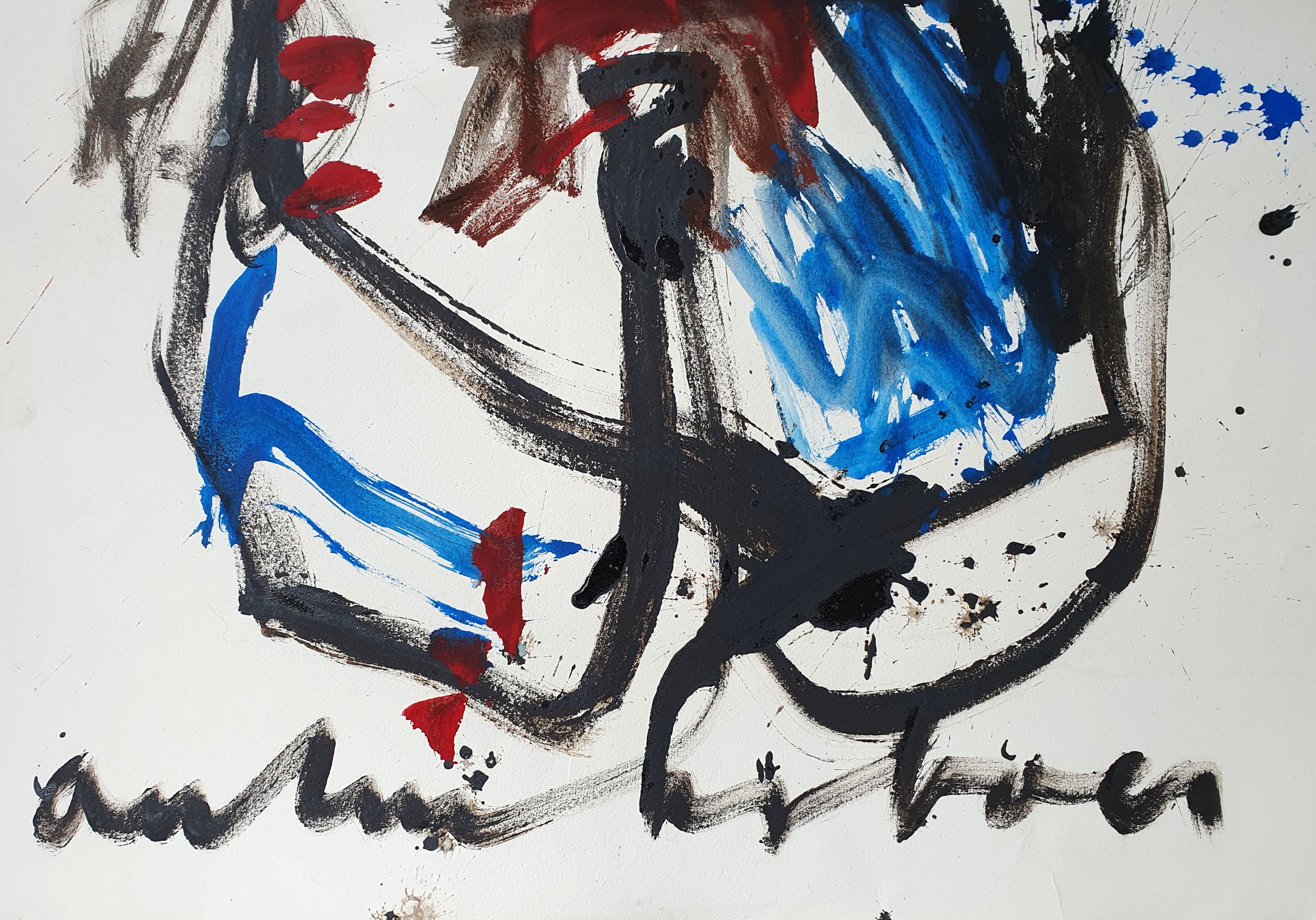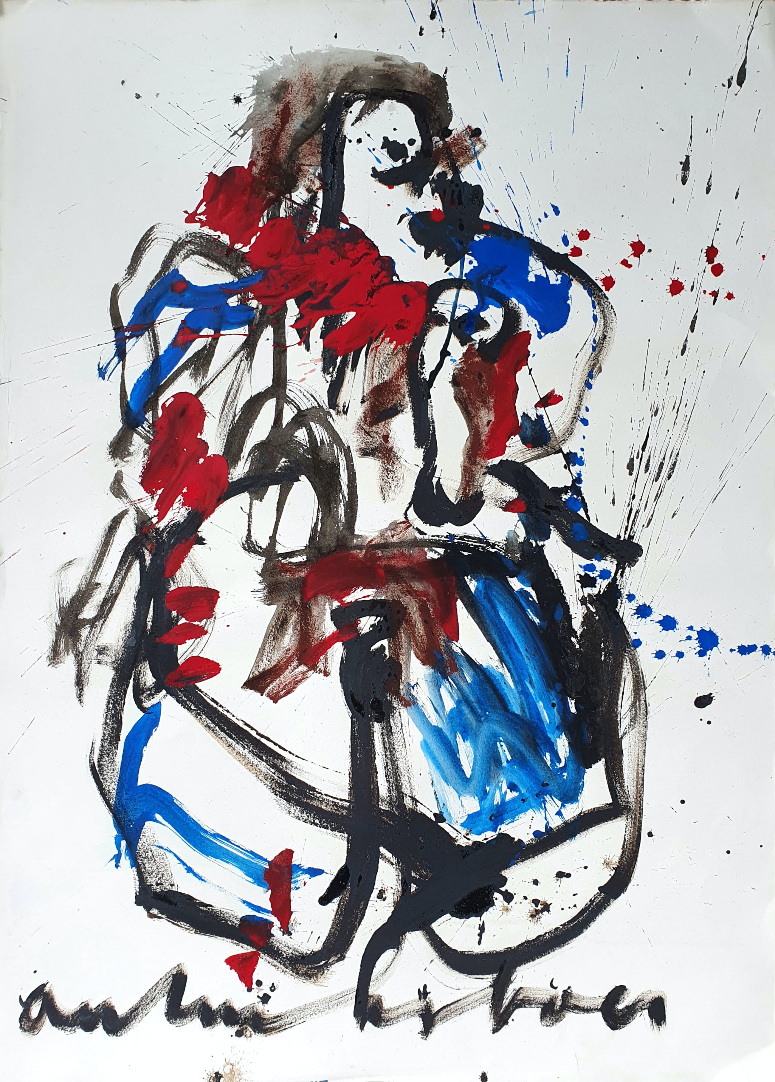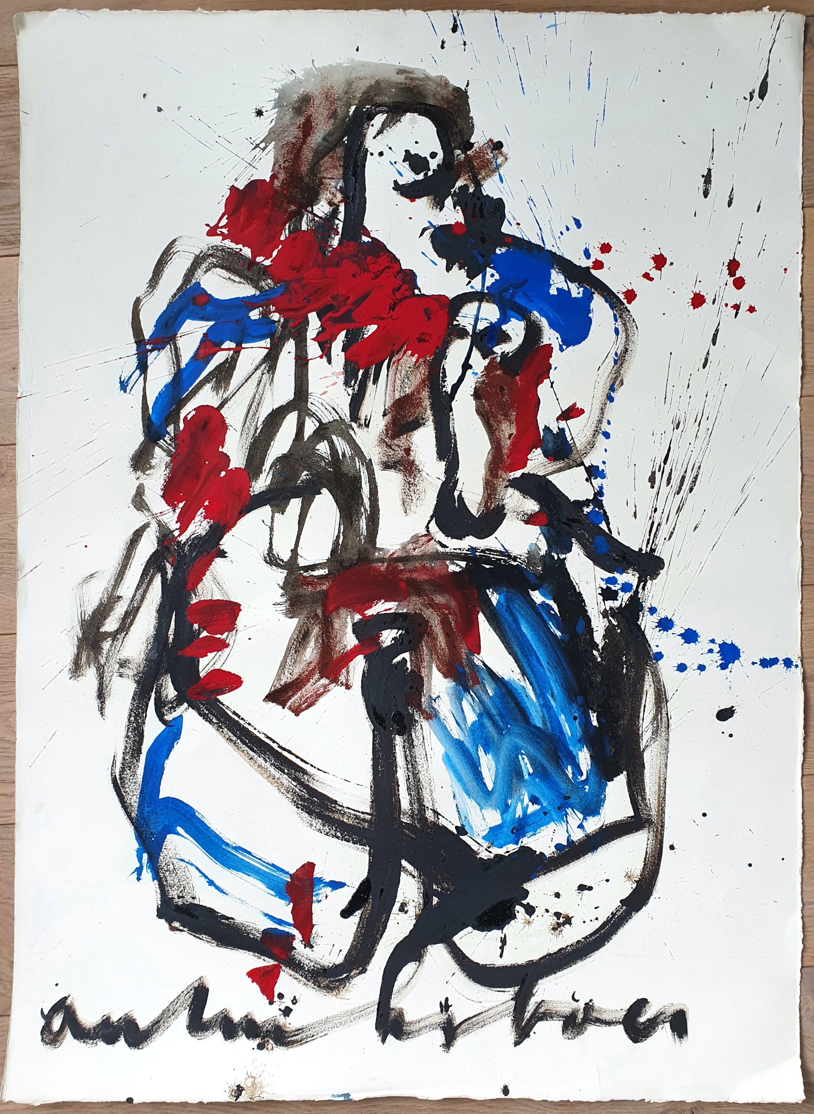 Waterverf met krijt (gemengde techniek) op geschept papier van Anton Heyboer. Het werk is middenonder gesigneerd door de kunstenaar.