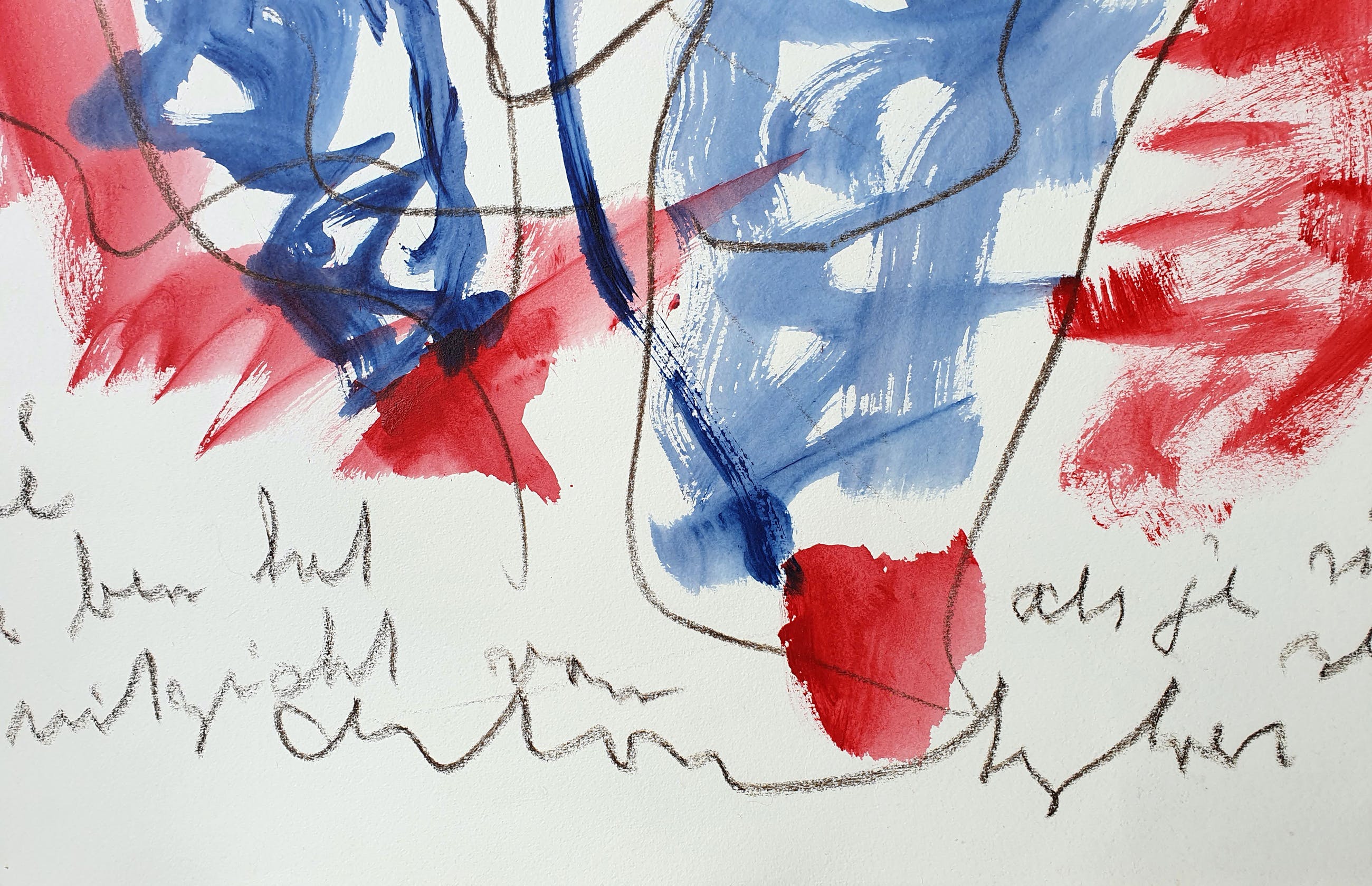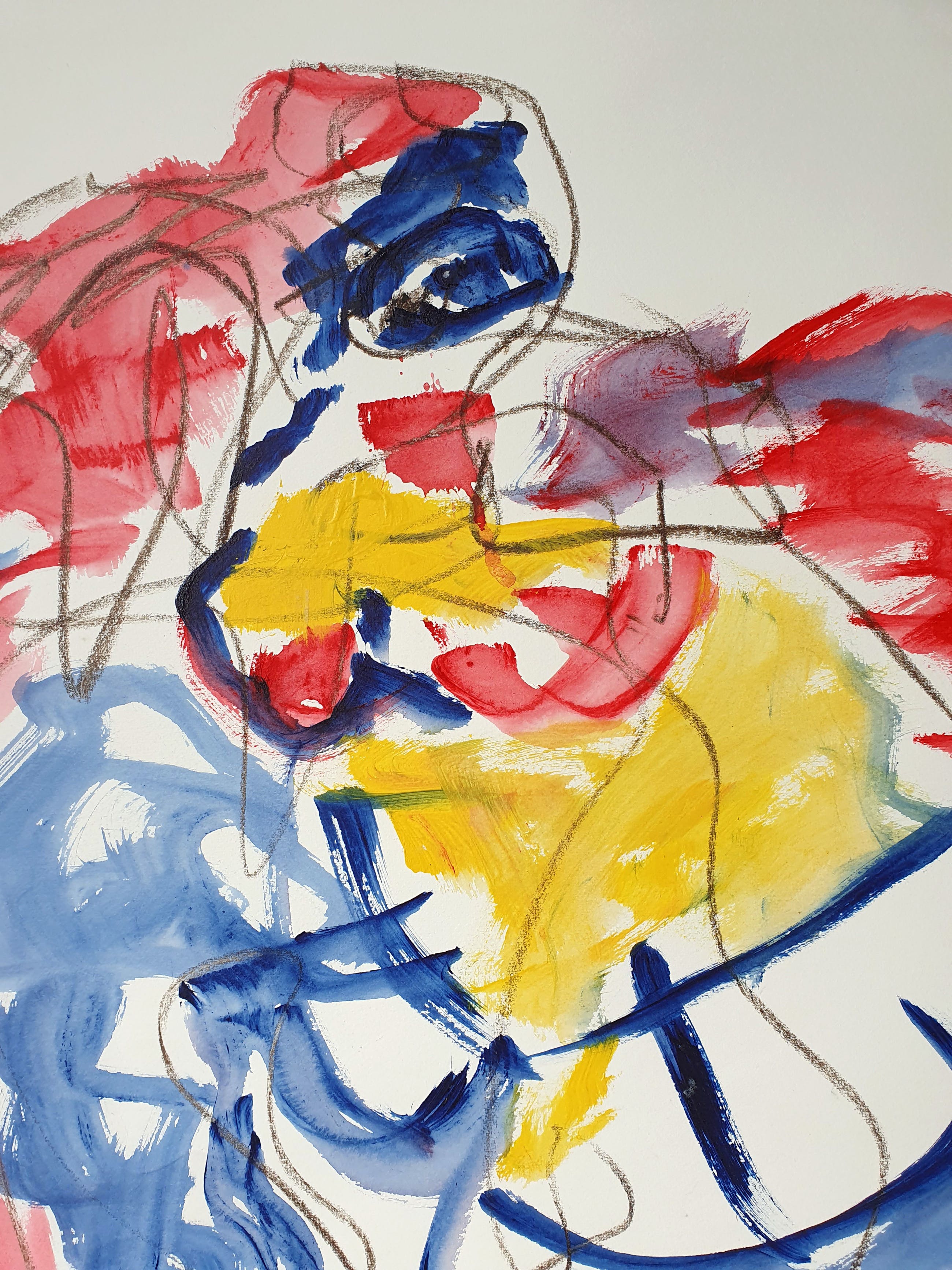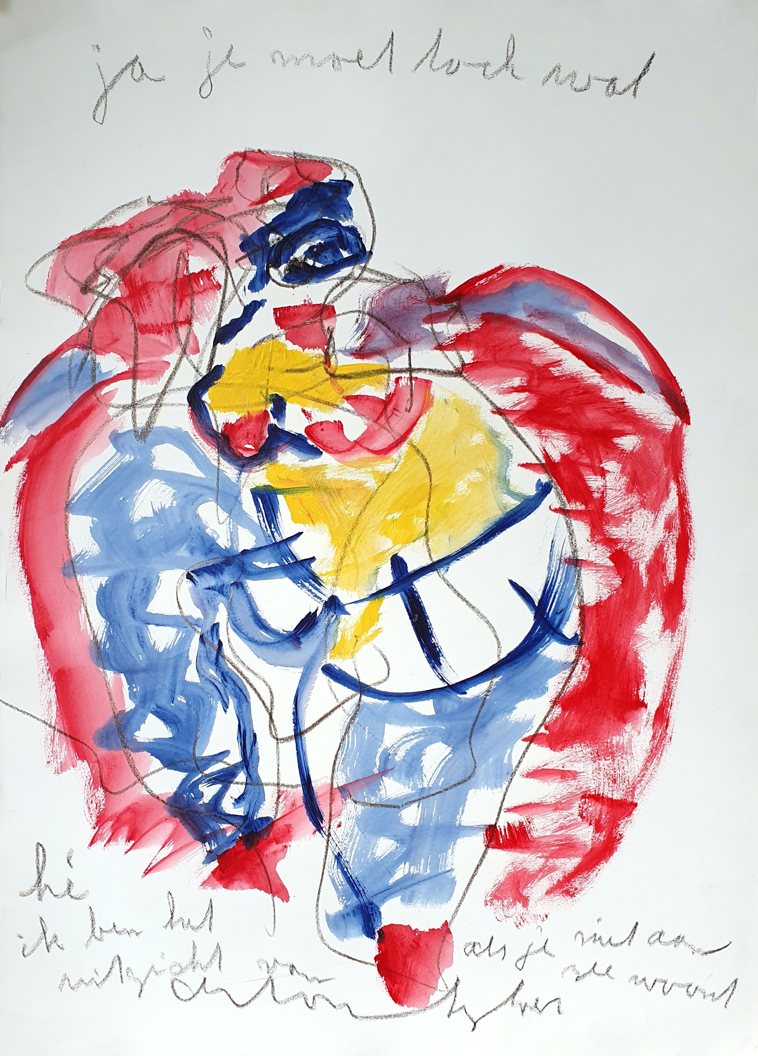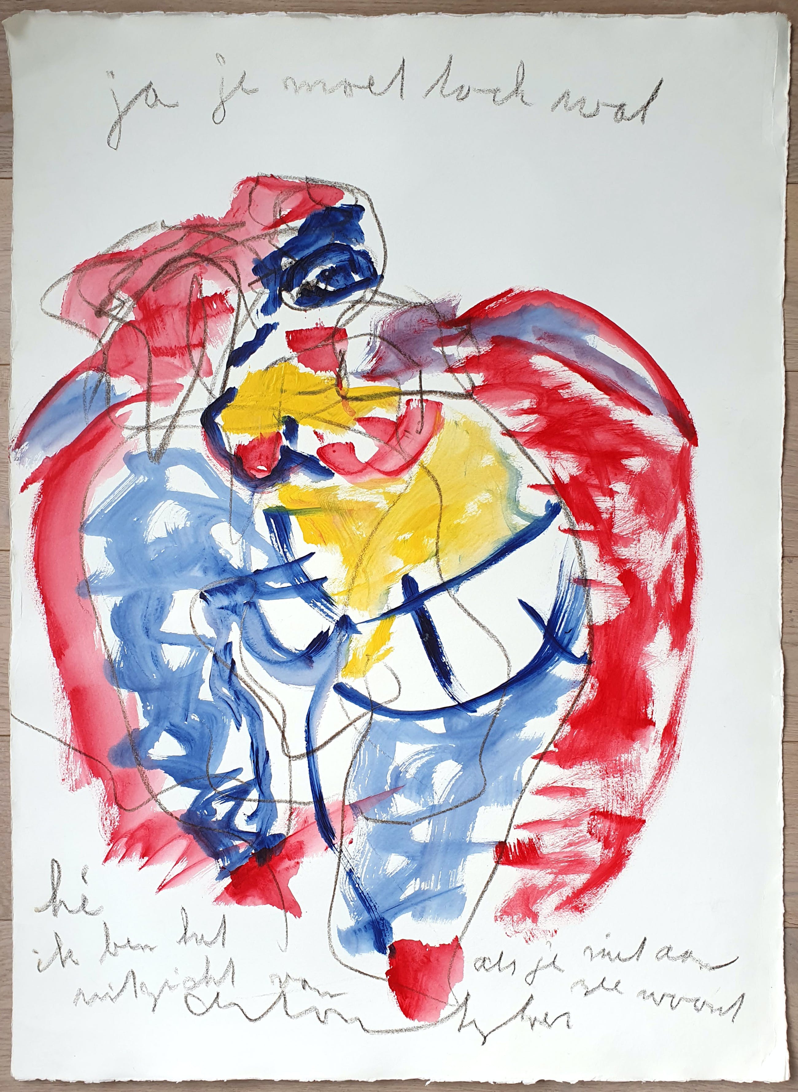 Waterverf met krijt (gemengde techniek) op geschept papier van Anton Heyboer. Het werk is middenonder gesigneerd door de kunstenaar.