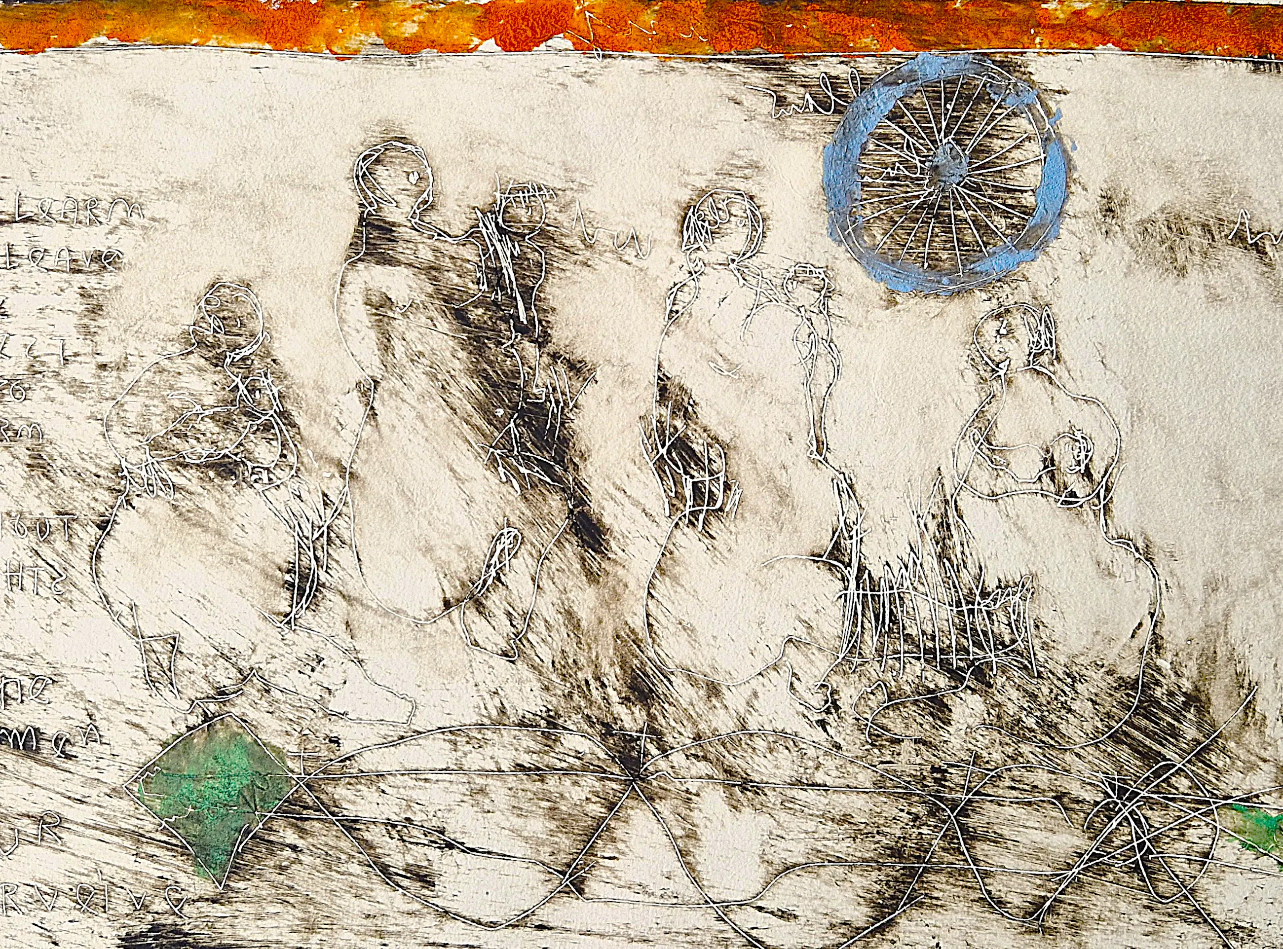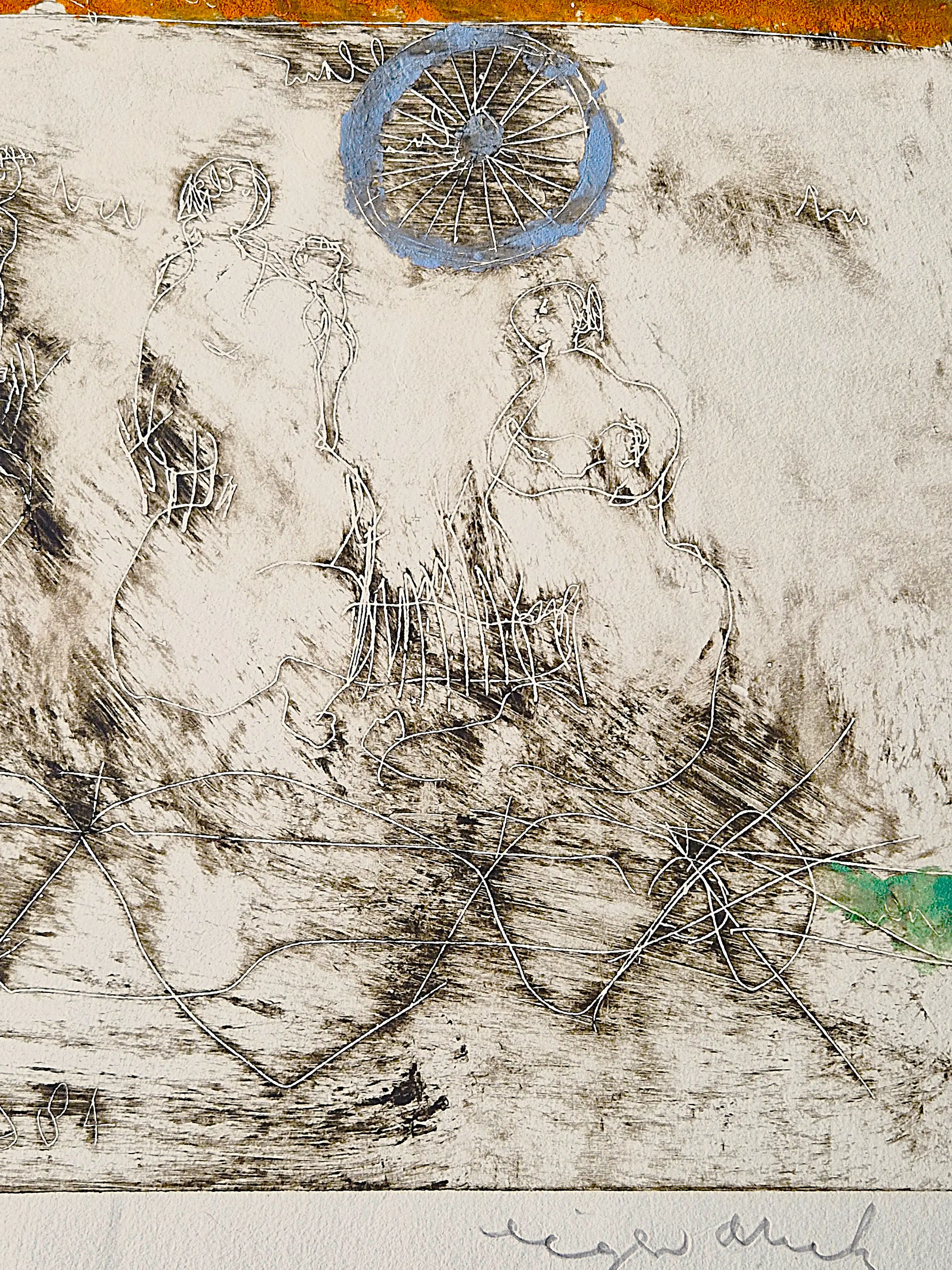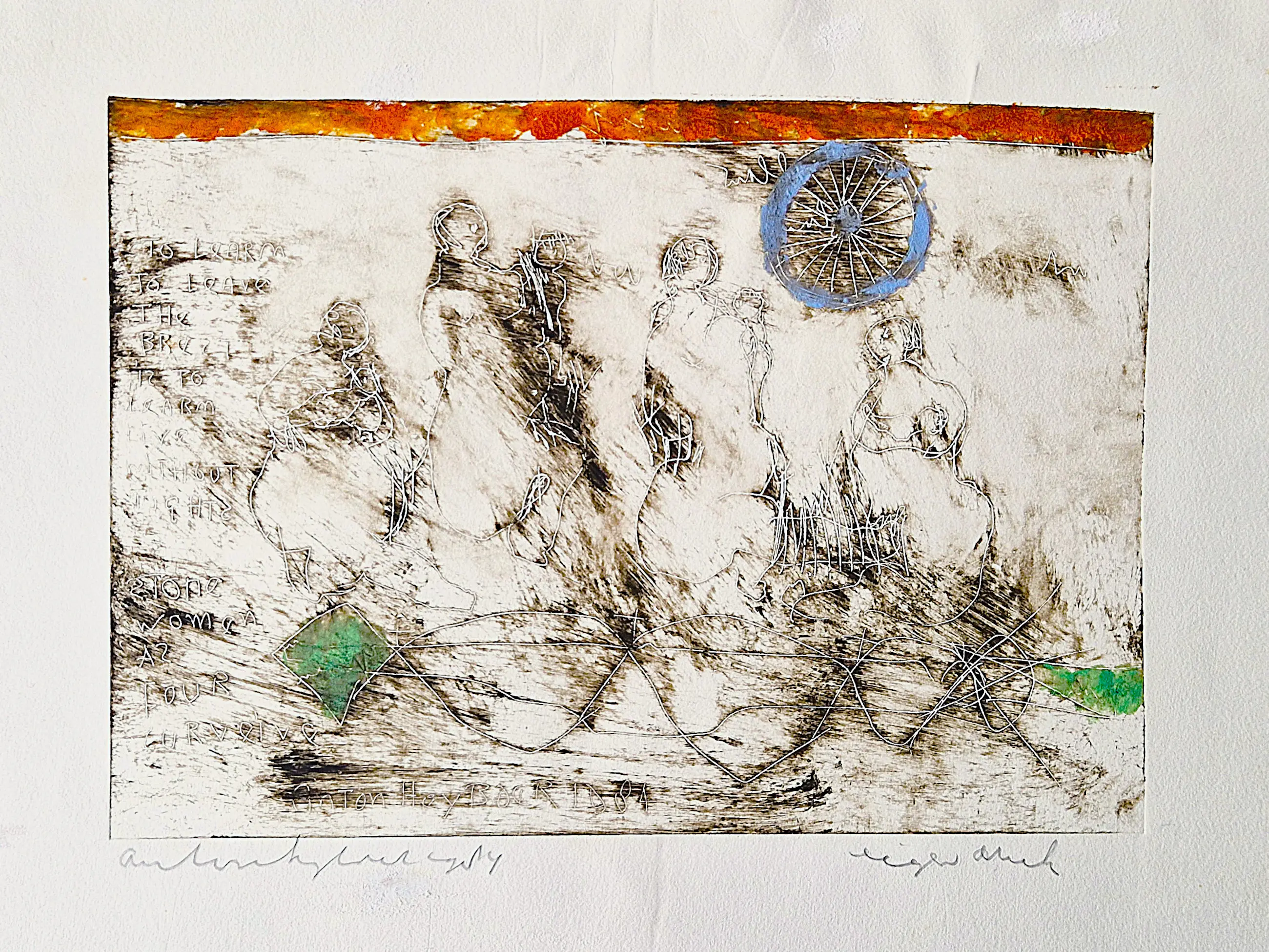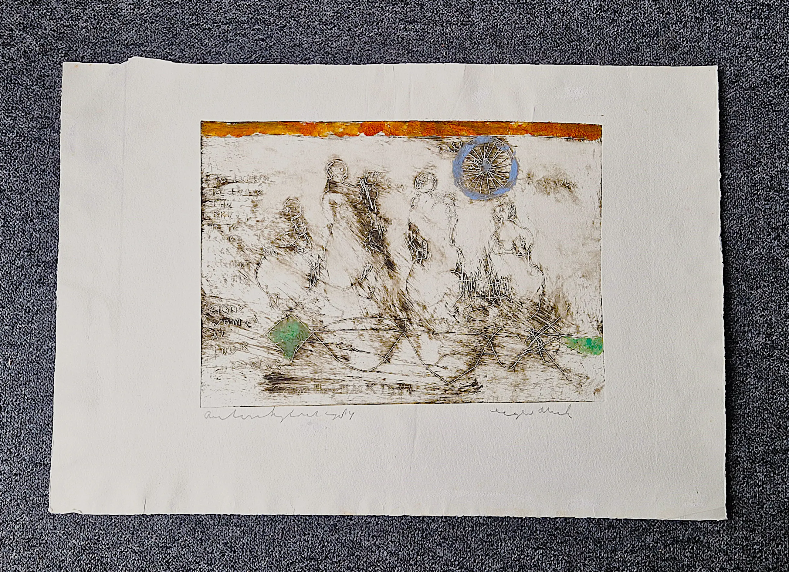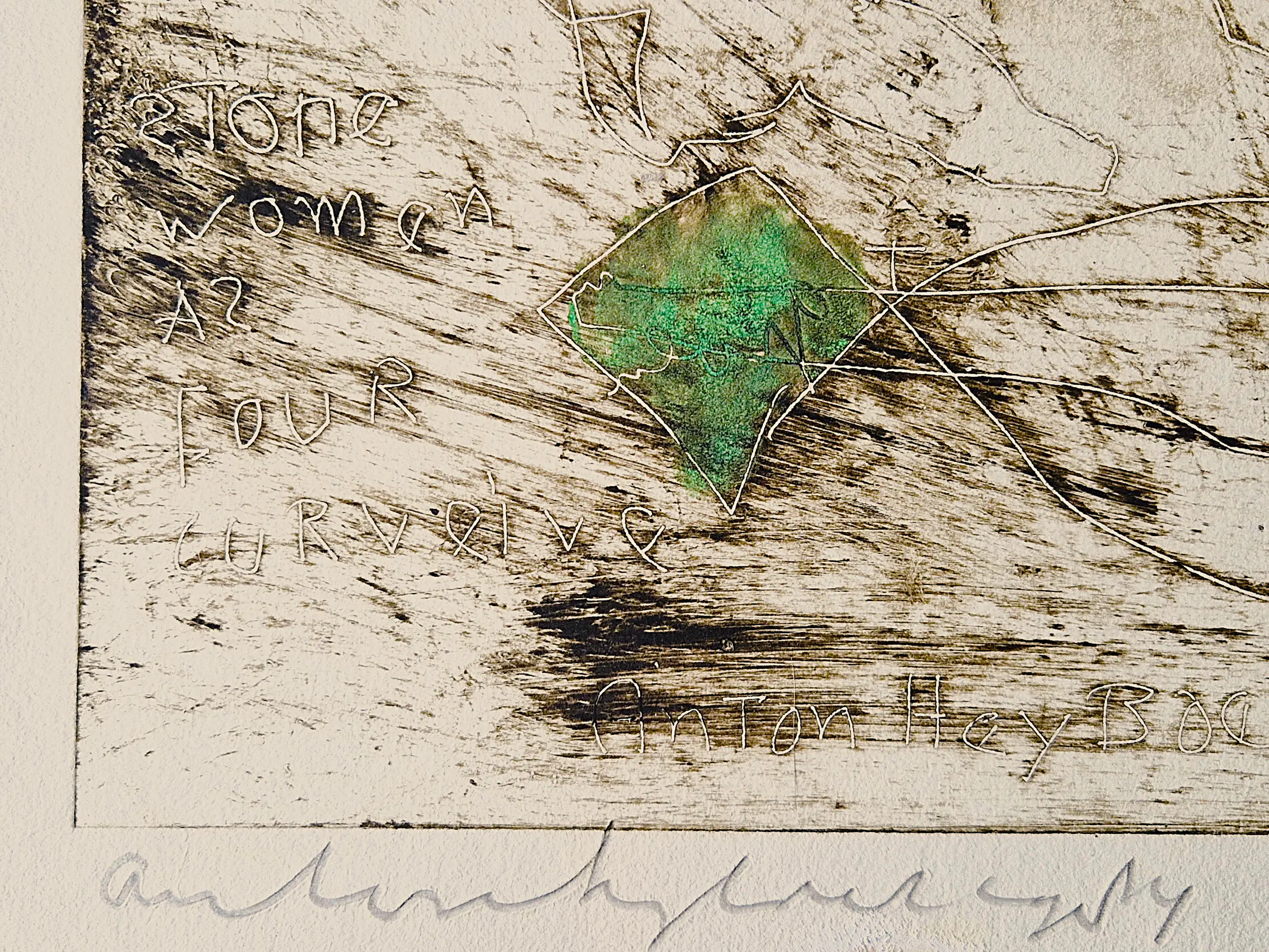- Een zeldzame (en nooit in oplage verschenen) handgekleurde eigen druk Ets op geschept papier. Door de eigenzinnige en veelbesproken beeldend kunstenaar anton Heyboer in 1984 gemaakt en getiteld "stone women". Met potlood gesigneerd en gedateerd. Beeldmaat  33 x 48cm.