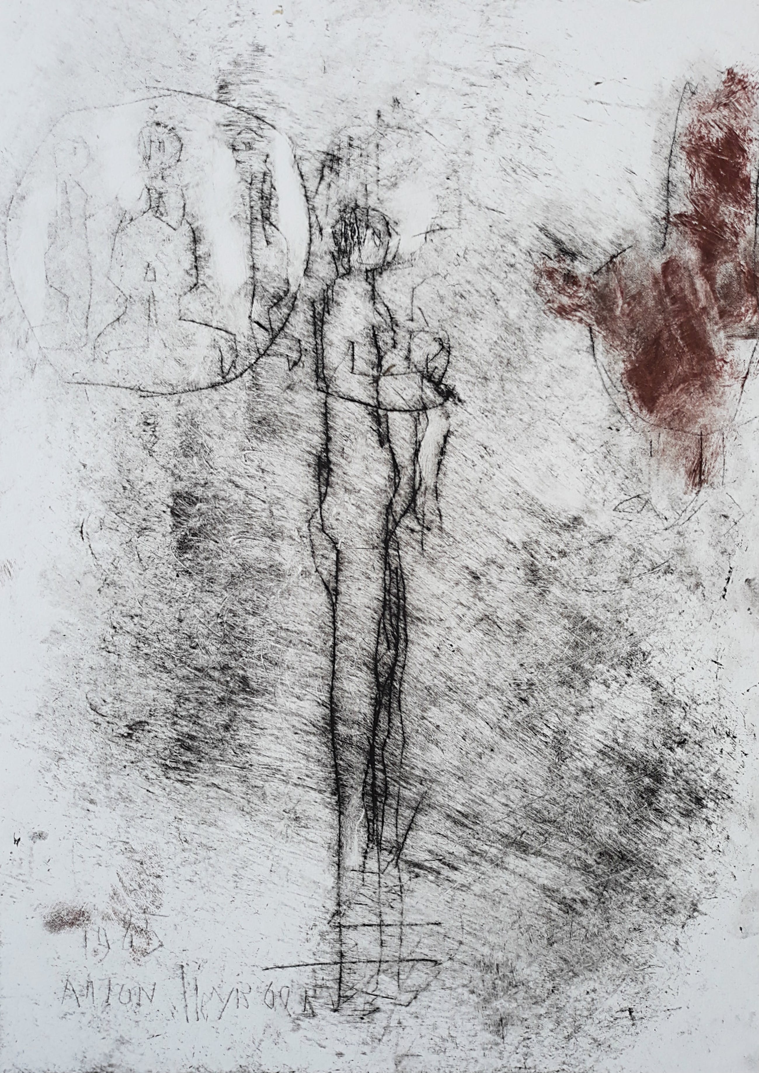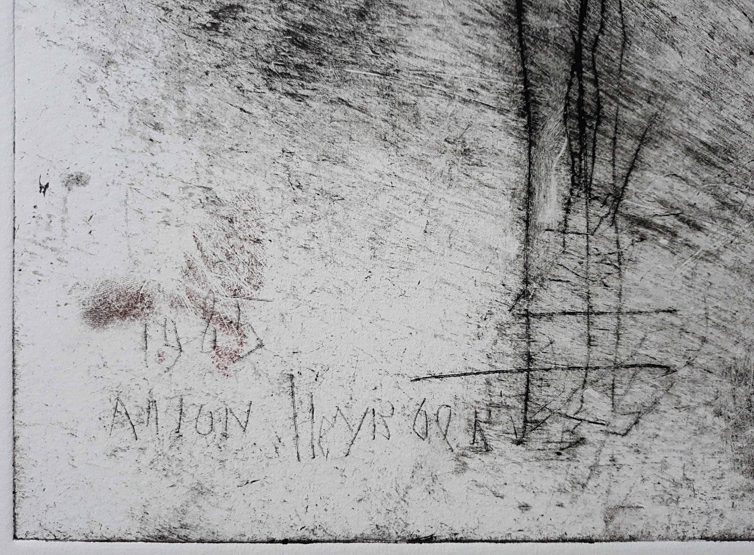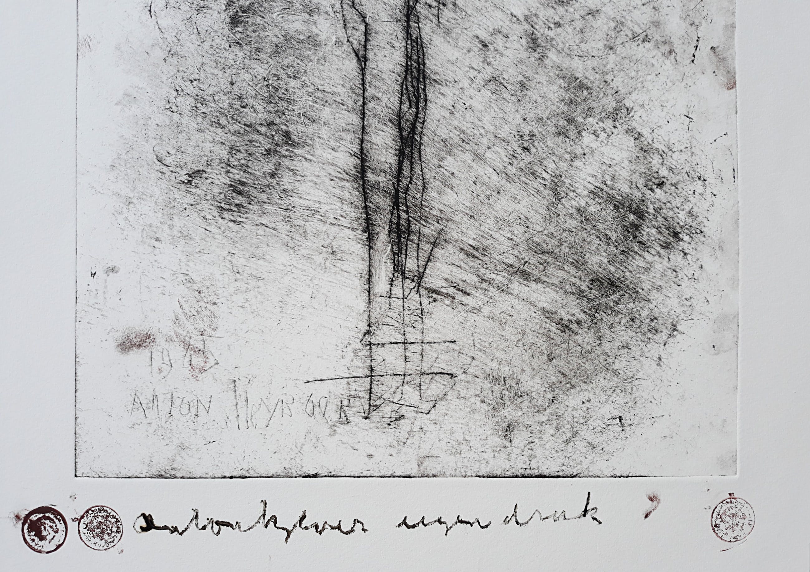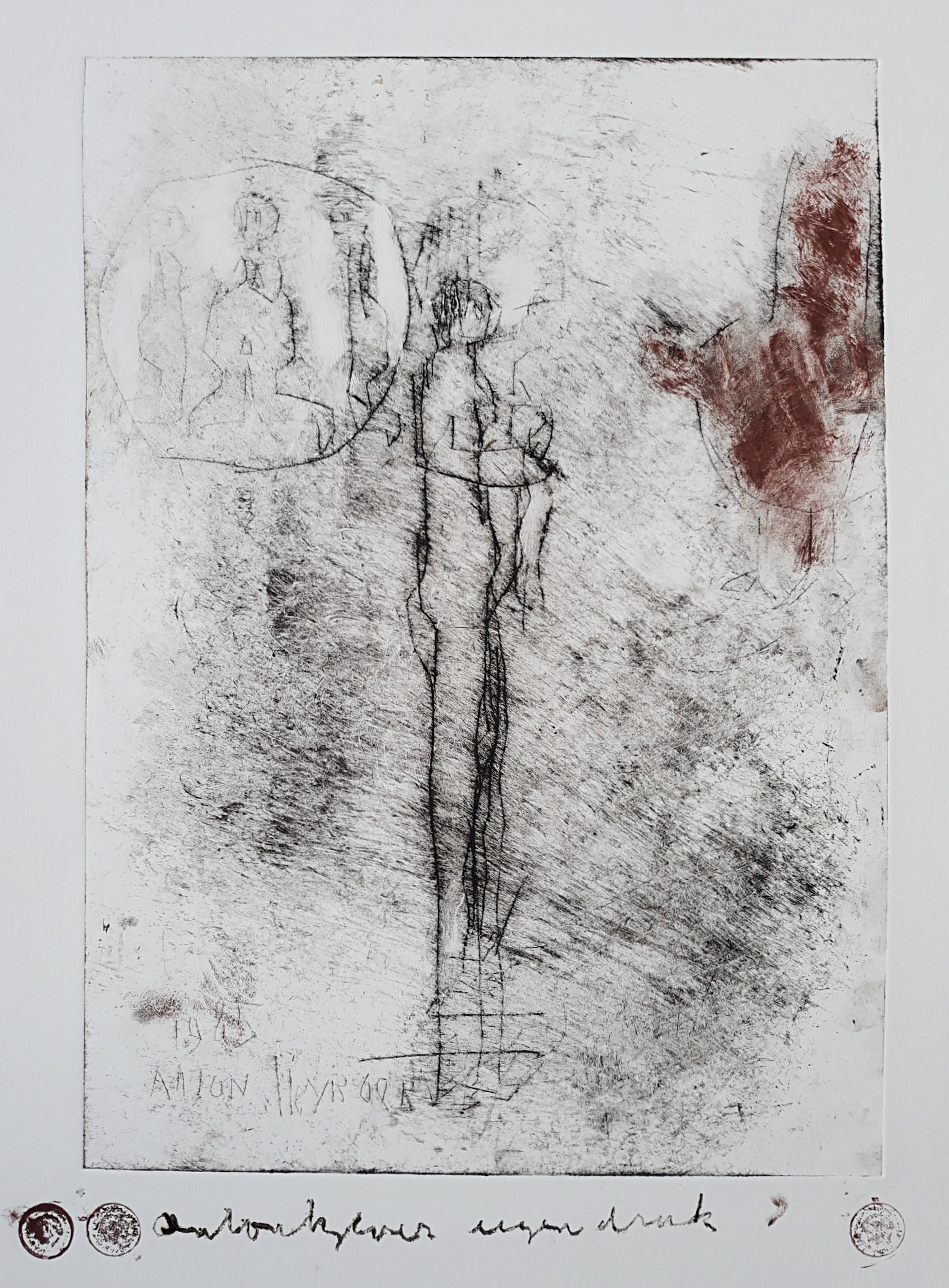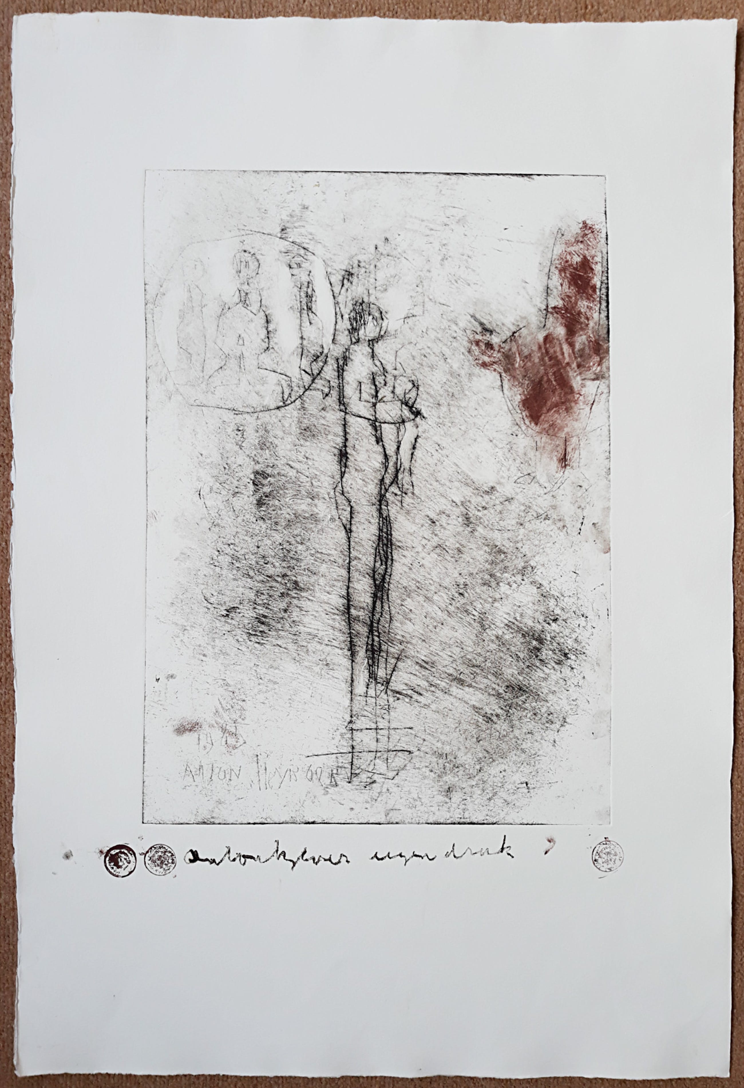 Karakteristiek werk van Anton Heyboer uit 1985. Ets gedrukt met inkt en rode menie op Hahnemühle papier, handgesigneerd en met guldenstempels, in de plaat gedateerd (1985) en nogmaals gesigneerd. In zeer goede conditie. Herkomst: de nalatenschap van Jaap Buitenhuis, één van de beste vrienden van Anton Heyboer.