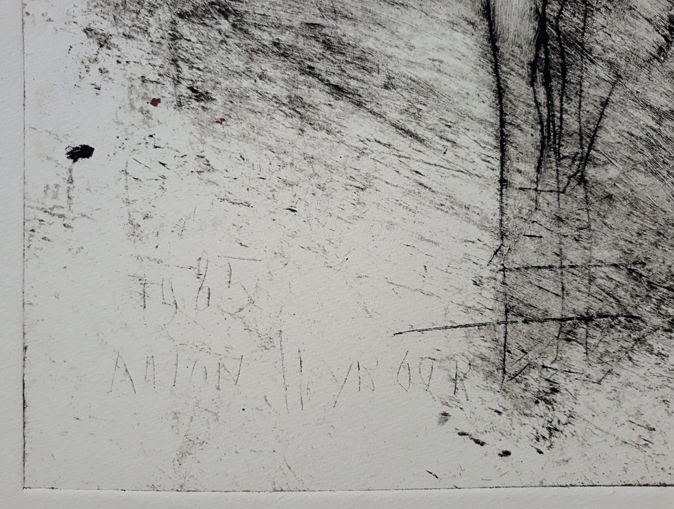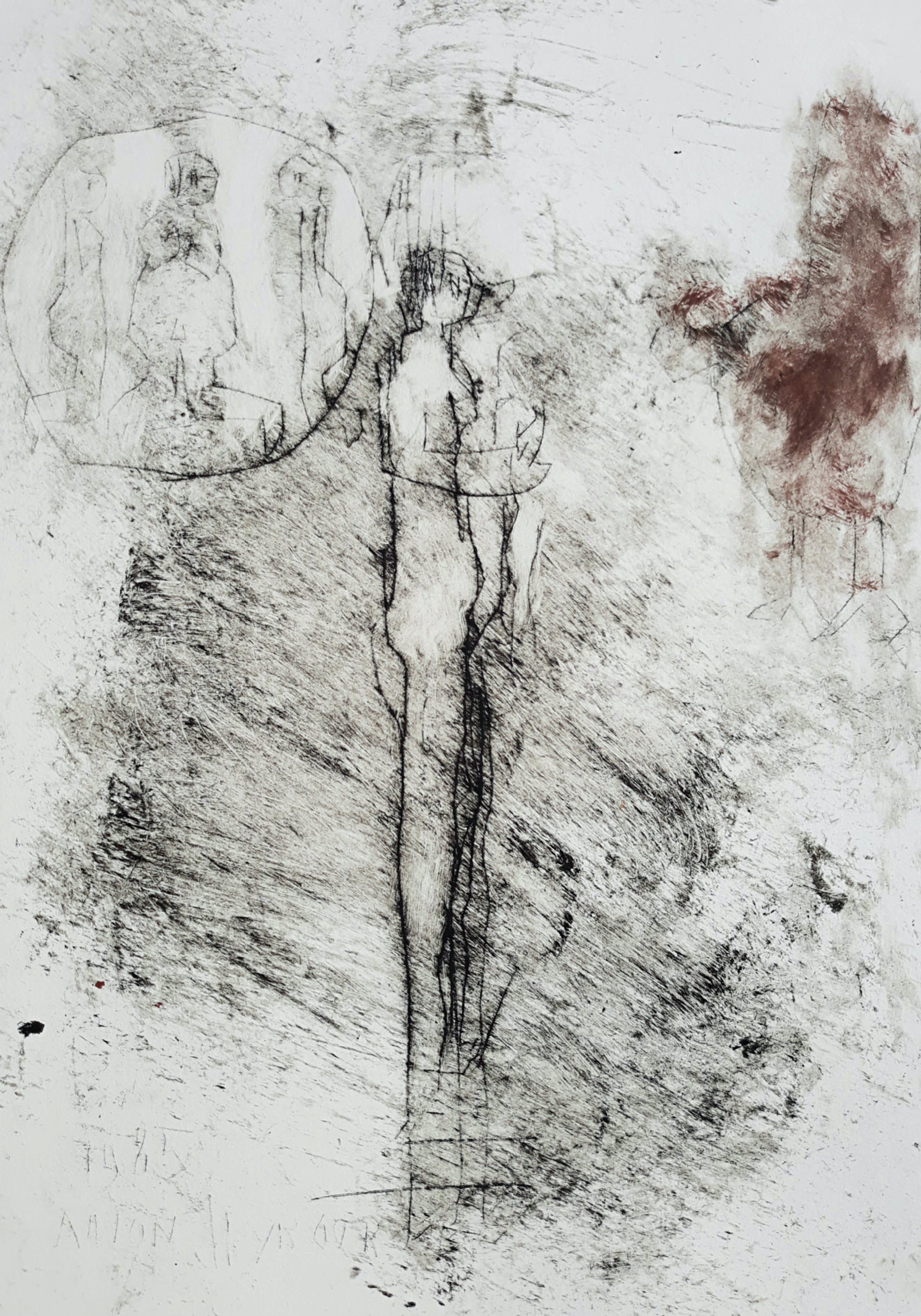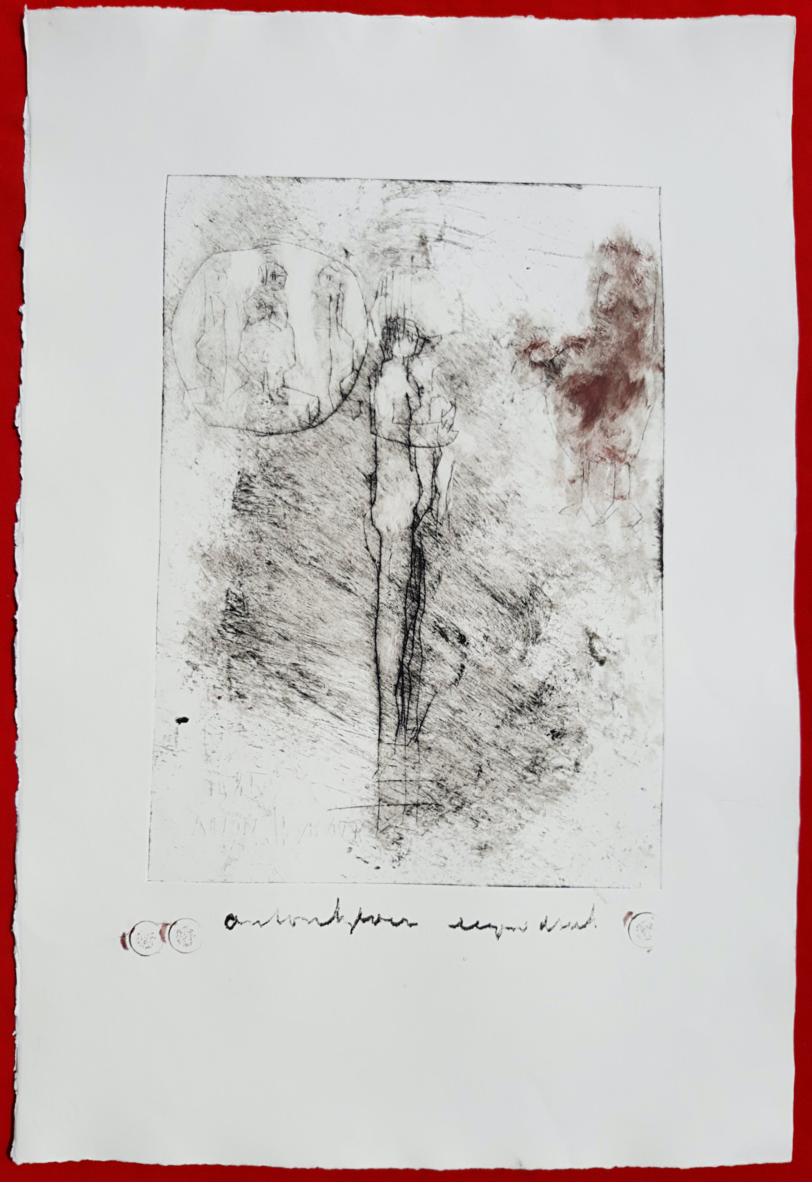 Karakteristiek werk van Anton Heyboer uit 1985. Ets gedrukt met inkt en rode menie op Hahnemühle papier, handgesigneerd en met guldenstempels, in de plaat gedateerd (1985) en nogmaals gesigneerd. In zeer goede conditie. Herkomst: de nalatenschap van Jaap Buitenhuis, één van de beste vrienden van Anton Heyboer.