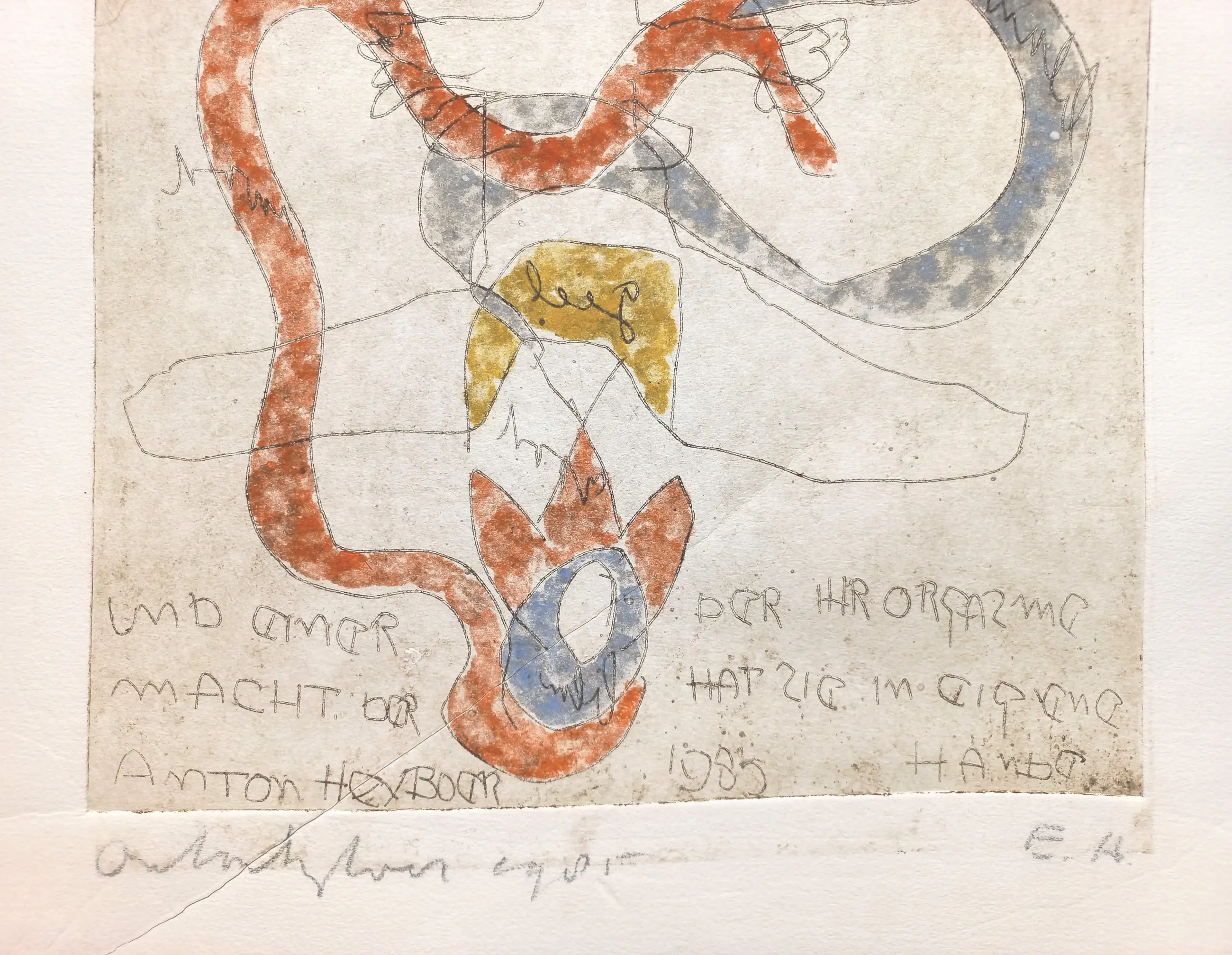 Mooie, karakteristieke kleurenets van Anton Heyboer. Ets op Hahnemühle papier, met potlood gesigneerd en gedateerd (1985) en in de plaat uitgebreid omschreven en nogmaals gesigneerd en gedateerd, een Épreuve d’Artiste (E.A.) exemplaar. In zeer goede conditie.