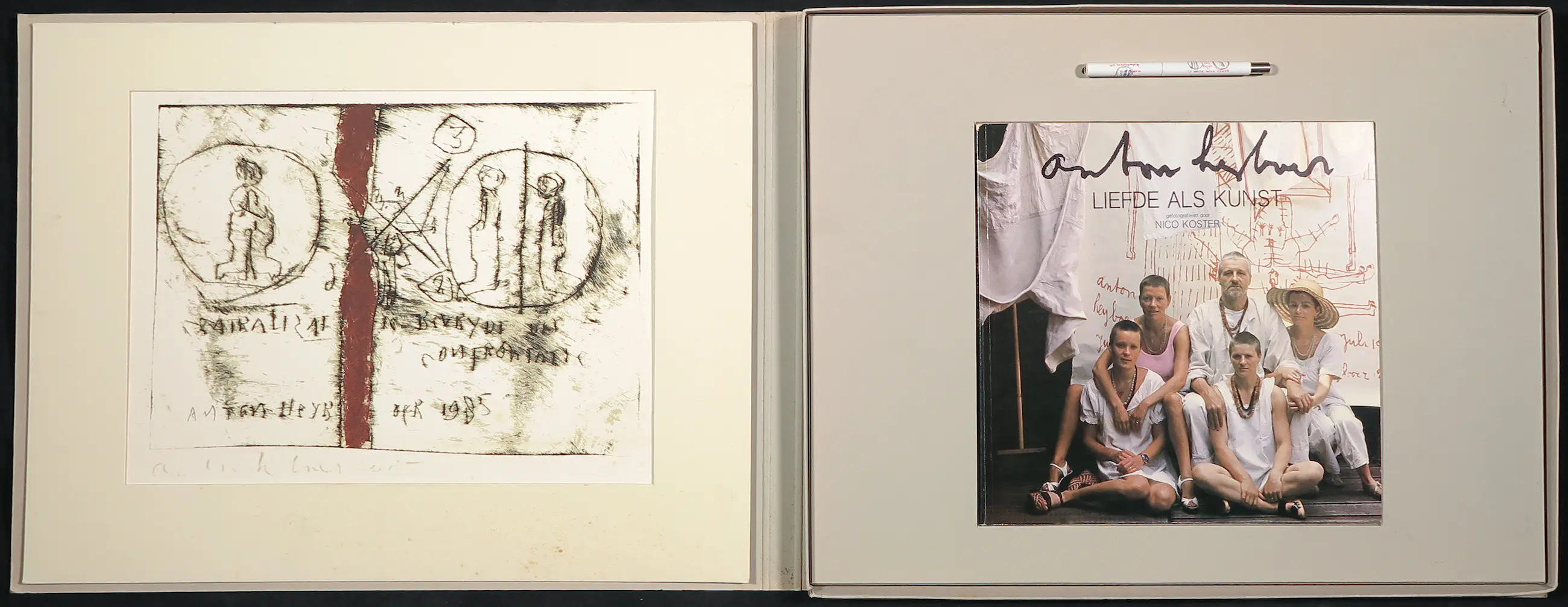 Het betreft een kartonnen map met een drukgesigneerde en drukgedateerde zeefdruk van Anton Heyboer achter een passe-partout, een boek van Nico Koster over het werk van Heyboer getiteld Liefde als kunst en een pen met een voorstelling van Heyboer's werk.
