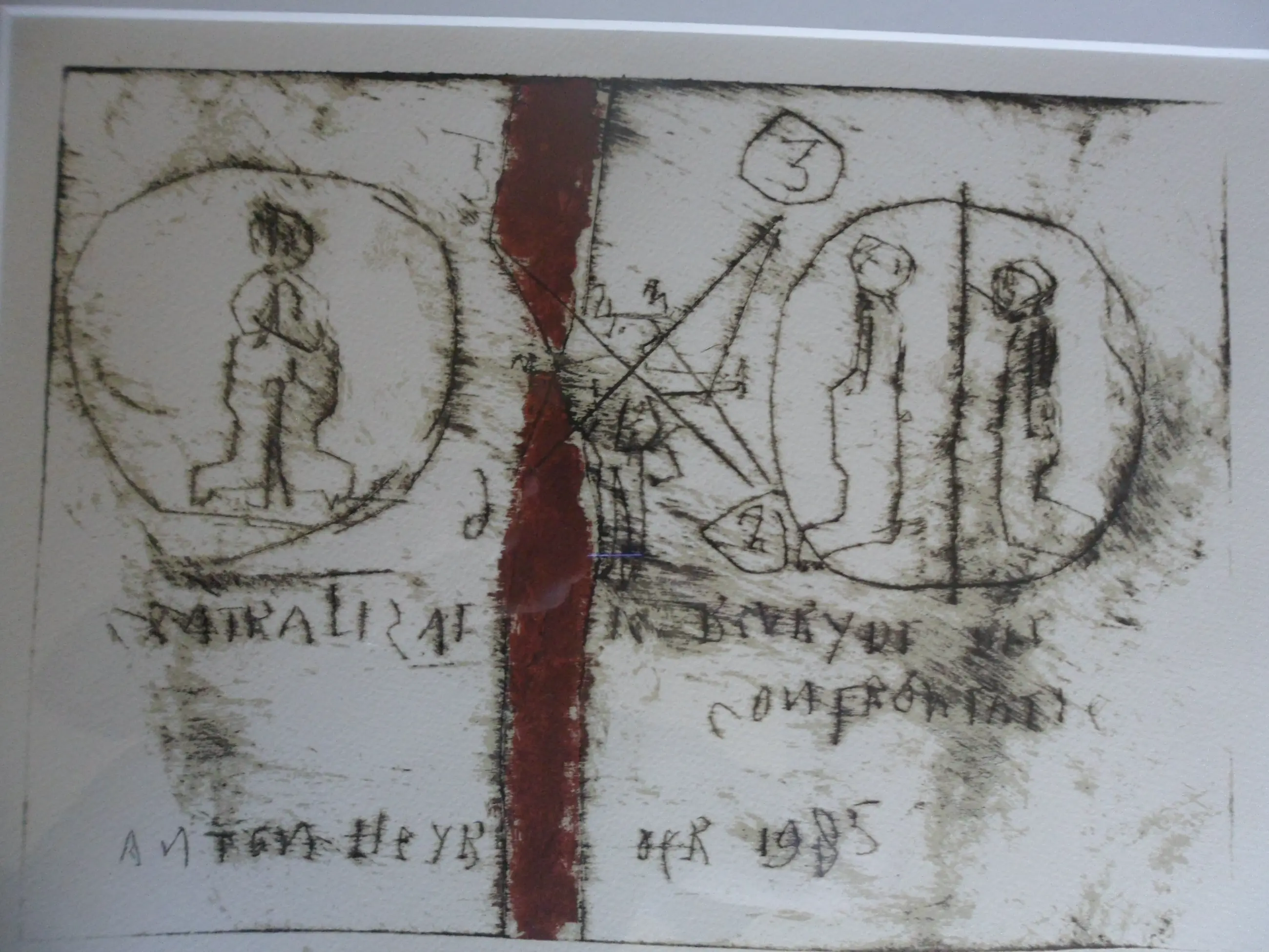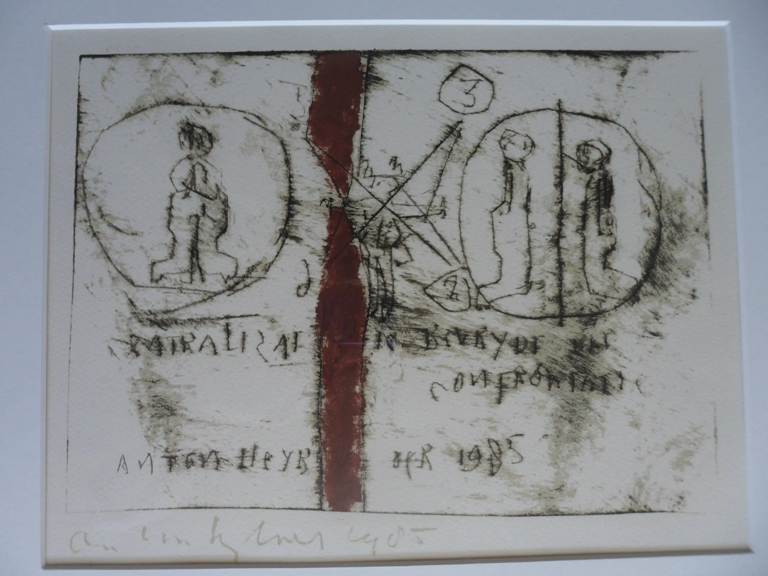 Het wezen in cirkel is de onschuld in het midden van de ets staat het systeem verbeeld en rechts de familie. In het boek "Het Systeem" van Anton Heyboer staat op pagina 16, "Onschuld is handen zonder handeling, voeten zonder te staan. Alleen beleven van de kwetsing die de geest de ziel aandeed zolang de mens zich denkt opgericht te hebben".