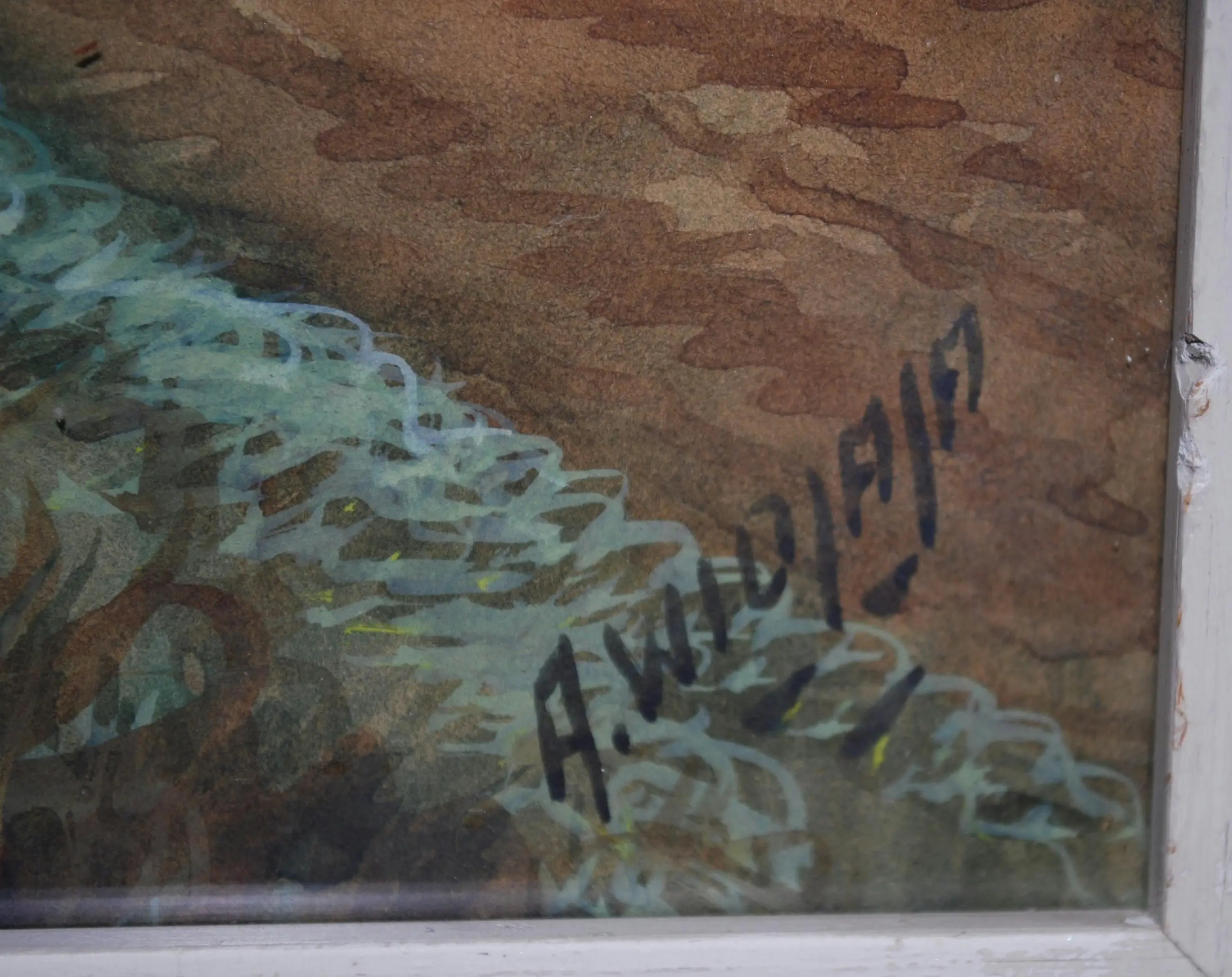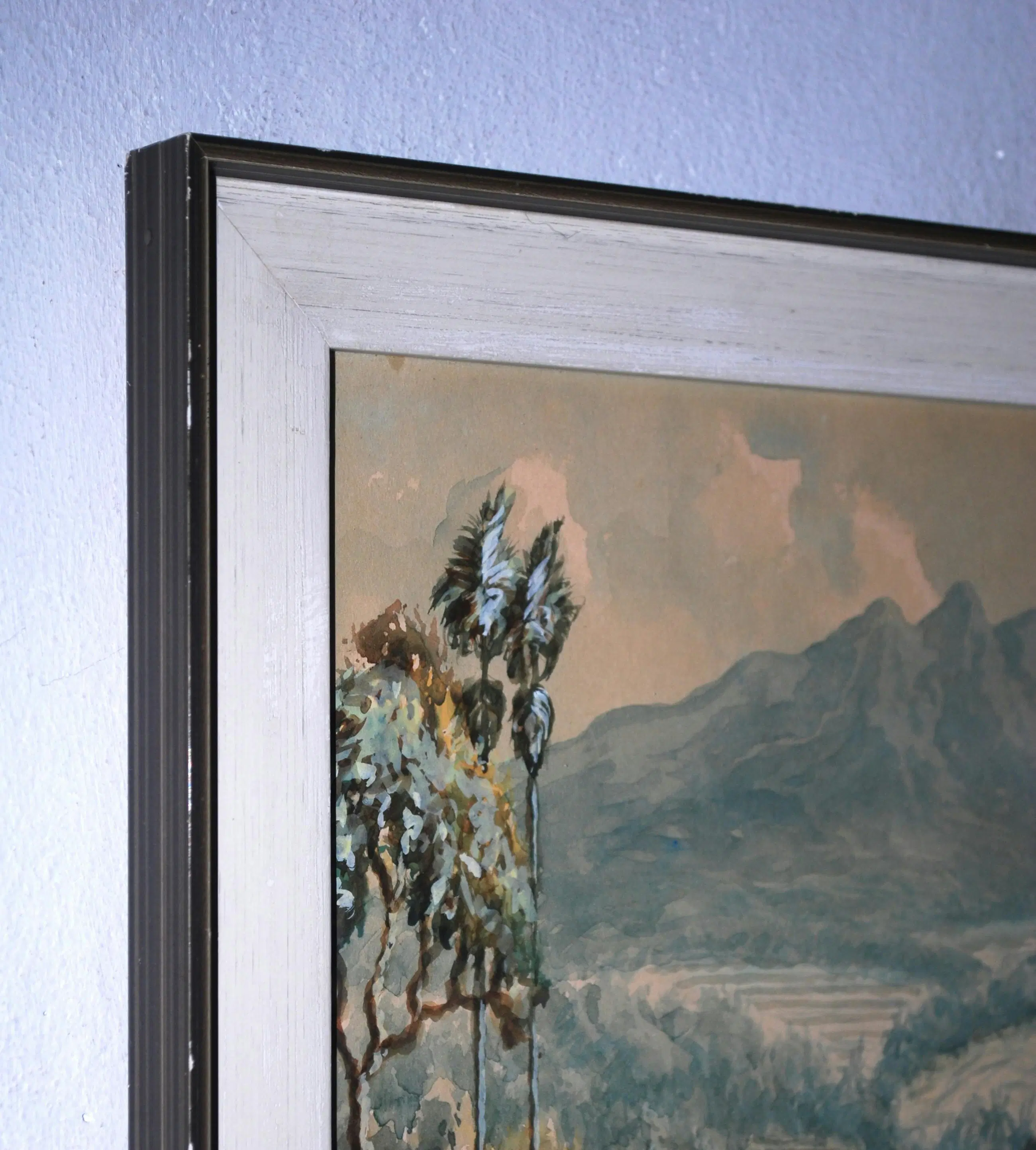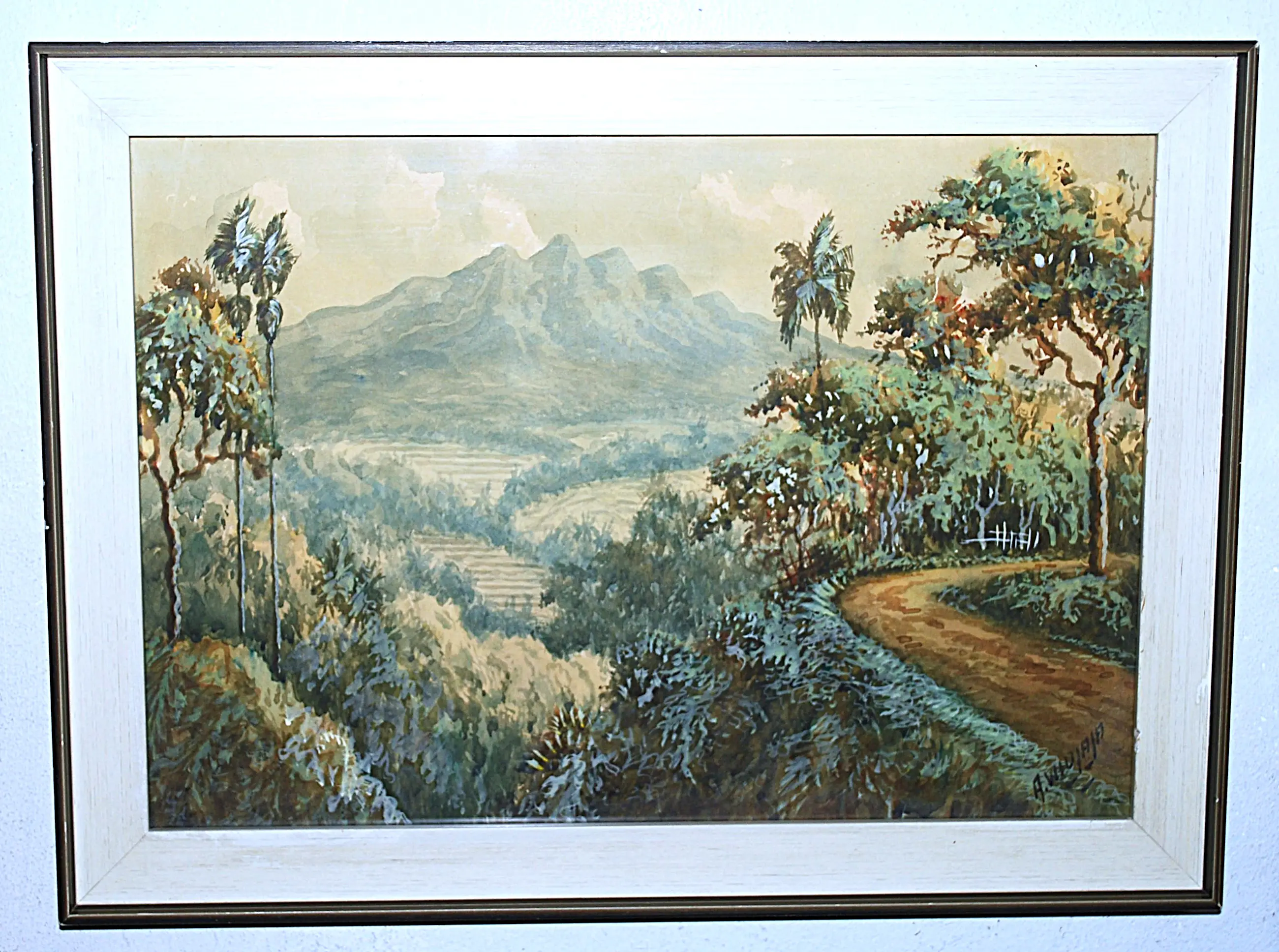 Anton Kustia Widjaja, ook wel Anton Huang (1935-1985). Gouache en aquarel op papier. Mooi ingelijst achter glas, met een houten passepartout aan de buitenzijde van het glas.