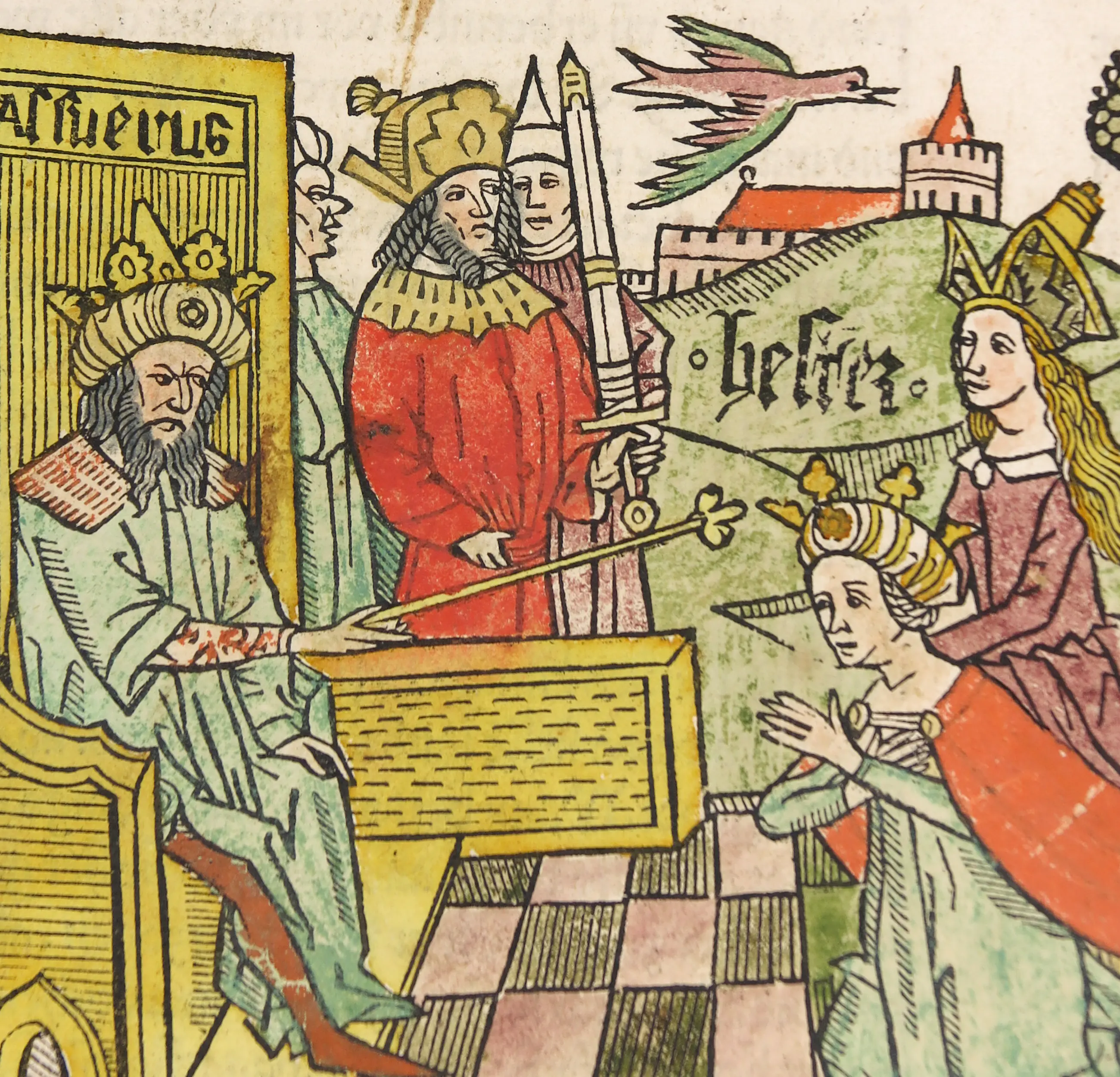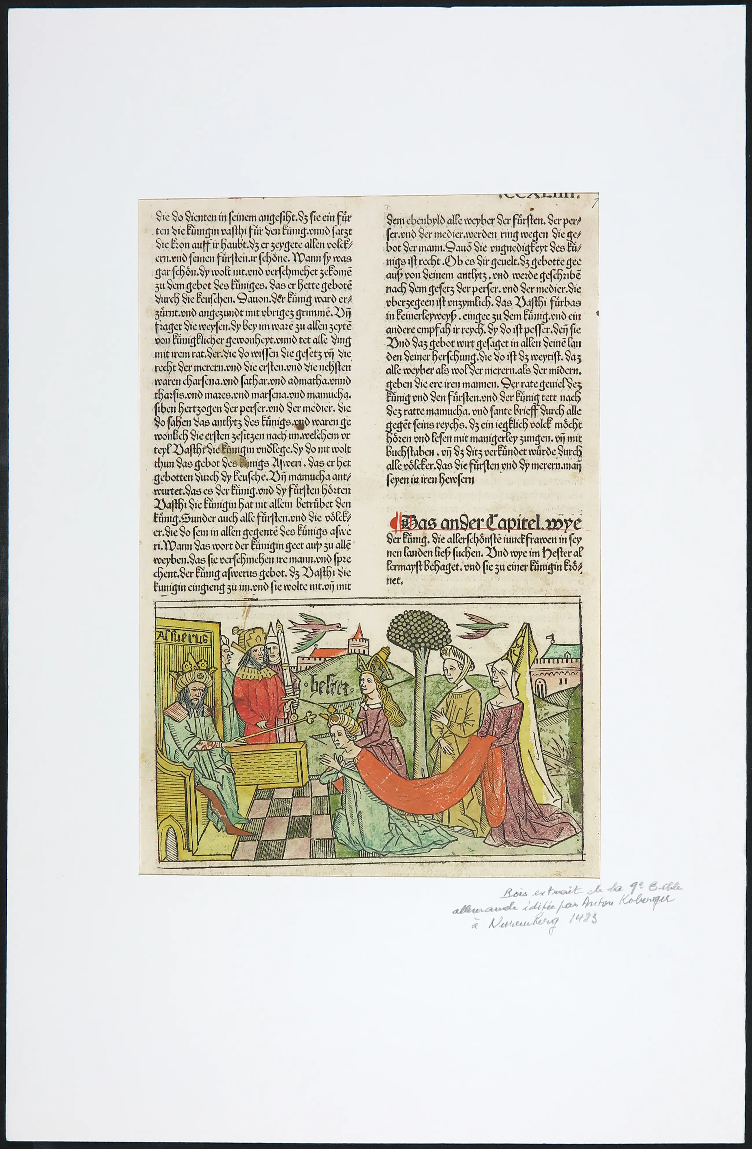 Het blad is ontstaan door een gemengde druktechniek. De afbeelding is een houtsnede welke met de hand is ingekleurd. De tekst is een wiegedruk/incunabel; een geschrift dat is gezet met losse letters wat vóór 1501 in Europa is gedrukt.