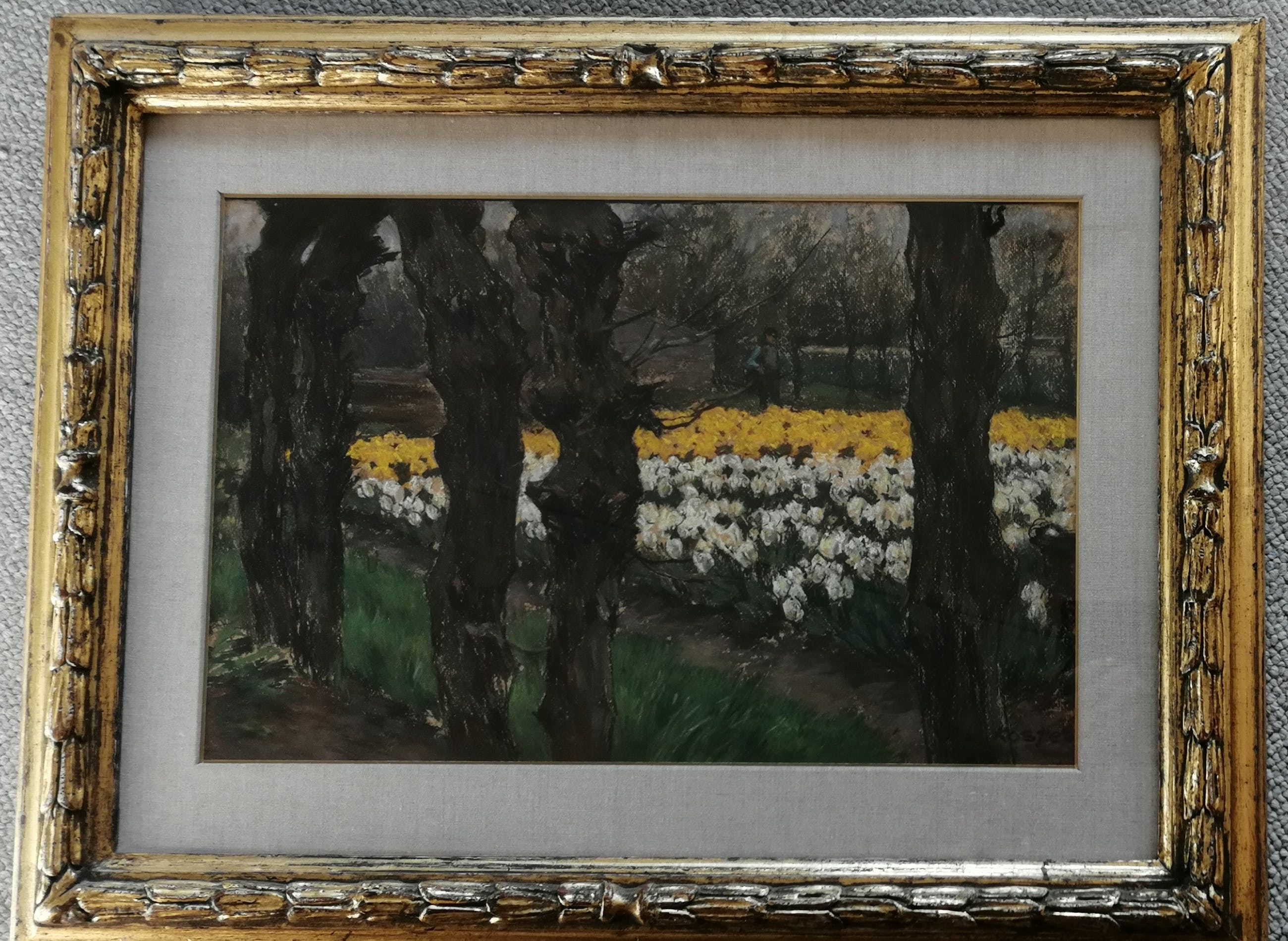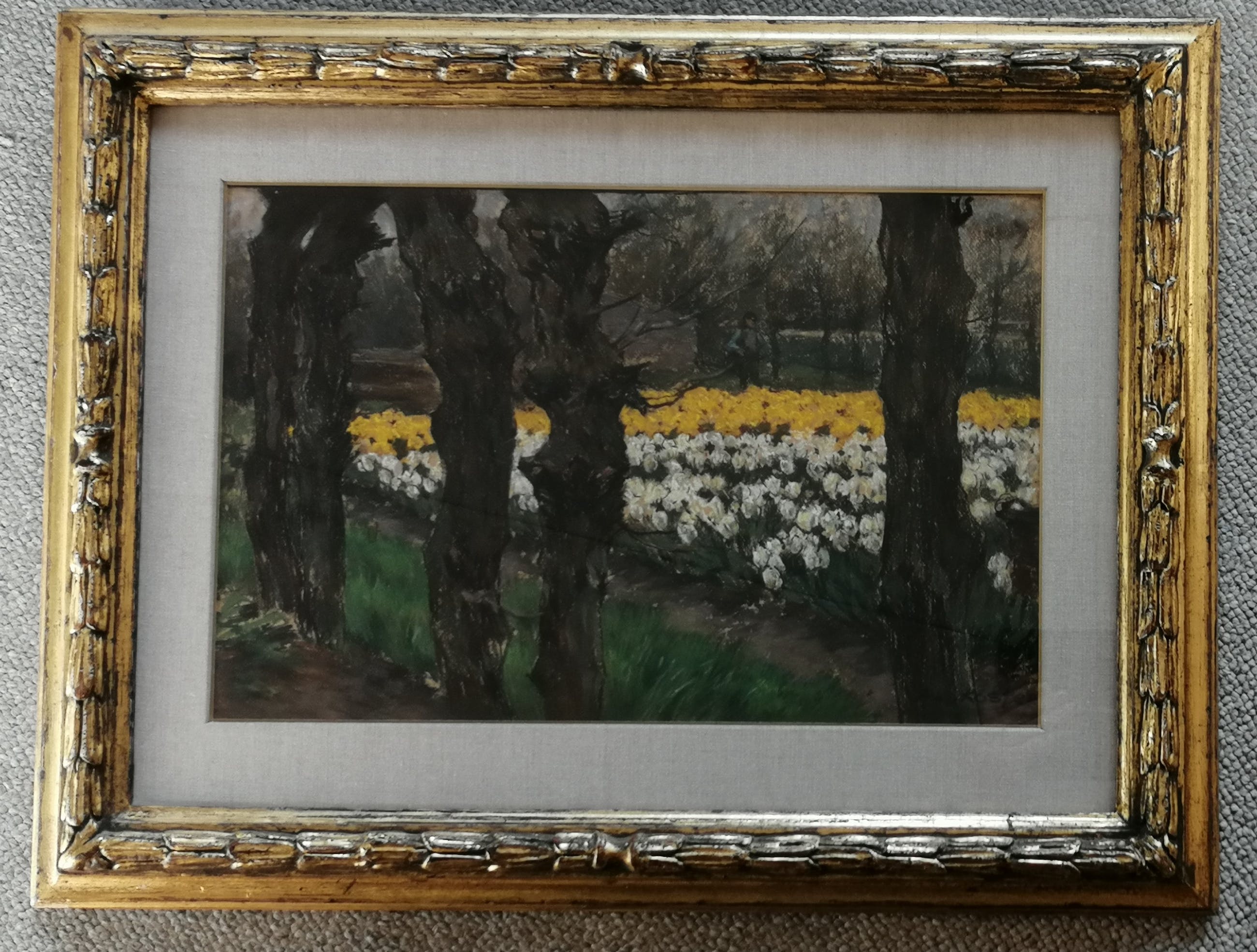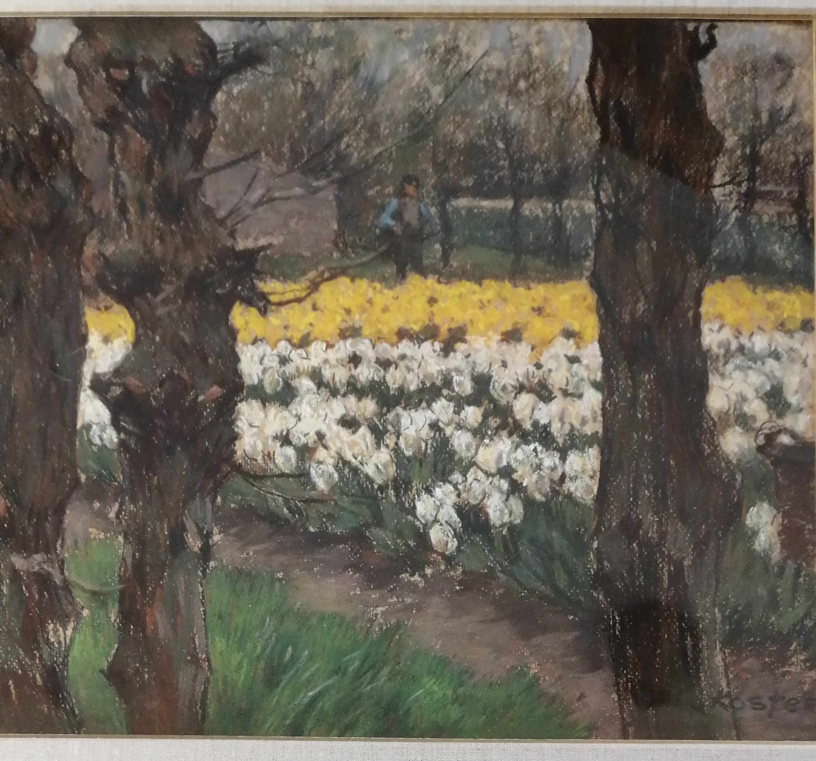 Mooi werk van de bekende bloembollenvelden schilder in een fraaie inlijsting. Van deze compositie heeft A.L.Koster ook een versie in olieverf gemaakt. Gesigneerd rechtsonder. Getiteld op de achterzijde. Antonie Lodewijk Koster werd geboren te Terneuzen op 8 augustus 1859 en overleed te Haarlem op 28 mei 1937. Opleiding aan de Academie voor Beeldende Kunst te Den Haag. Leerling van Willem Mesdag en Philippe Zilcken. Verkreeg in 1916 de Koninklijke Medaille. Lid van Pulchri Studio, Arti et Amicitiae, de Nederlandse Etsclub en Kunst Zij Ons Doel te Haarlem waarvan hij ook bestuurslid was. Woonde en werkte aan de Koediefslaan te Heemstede.