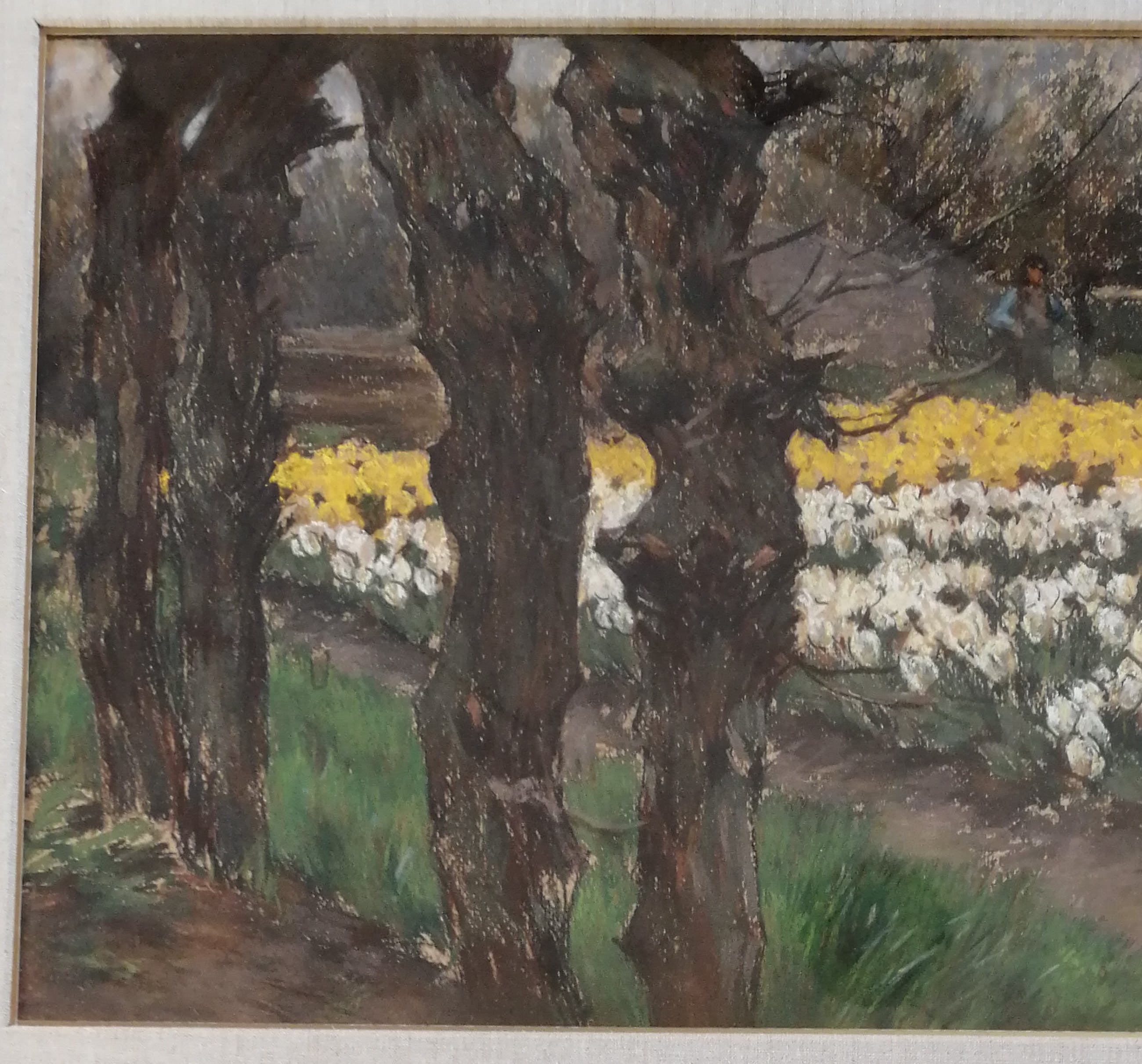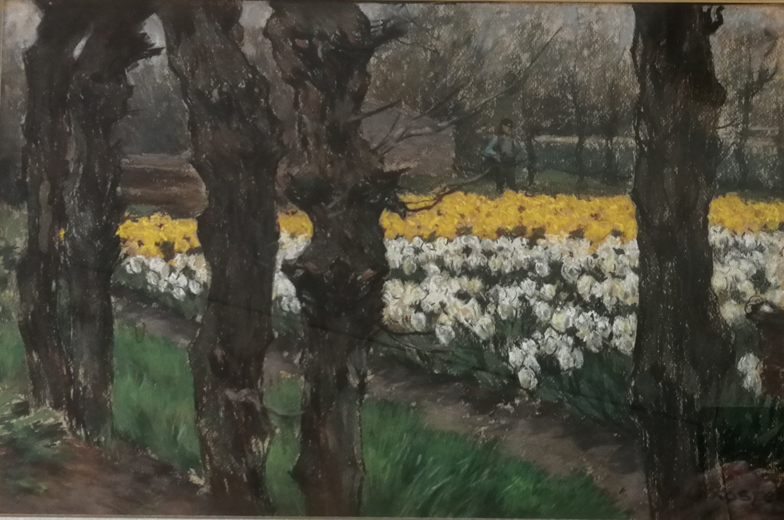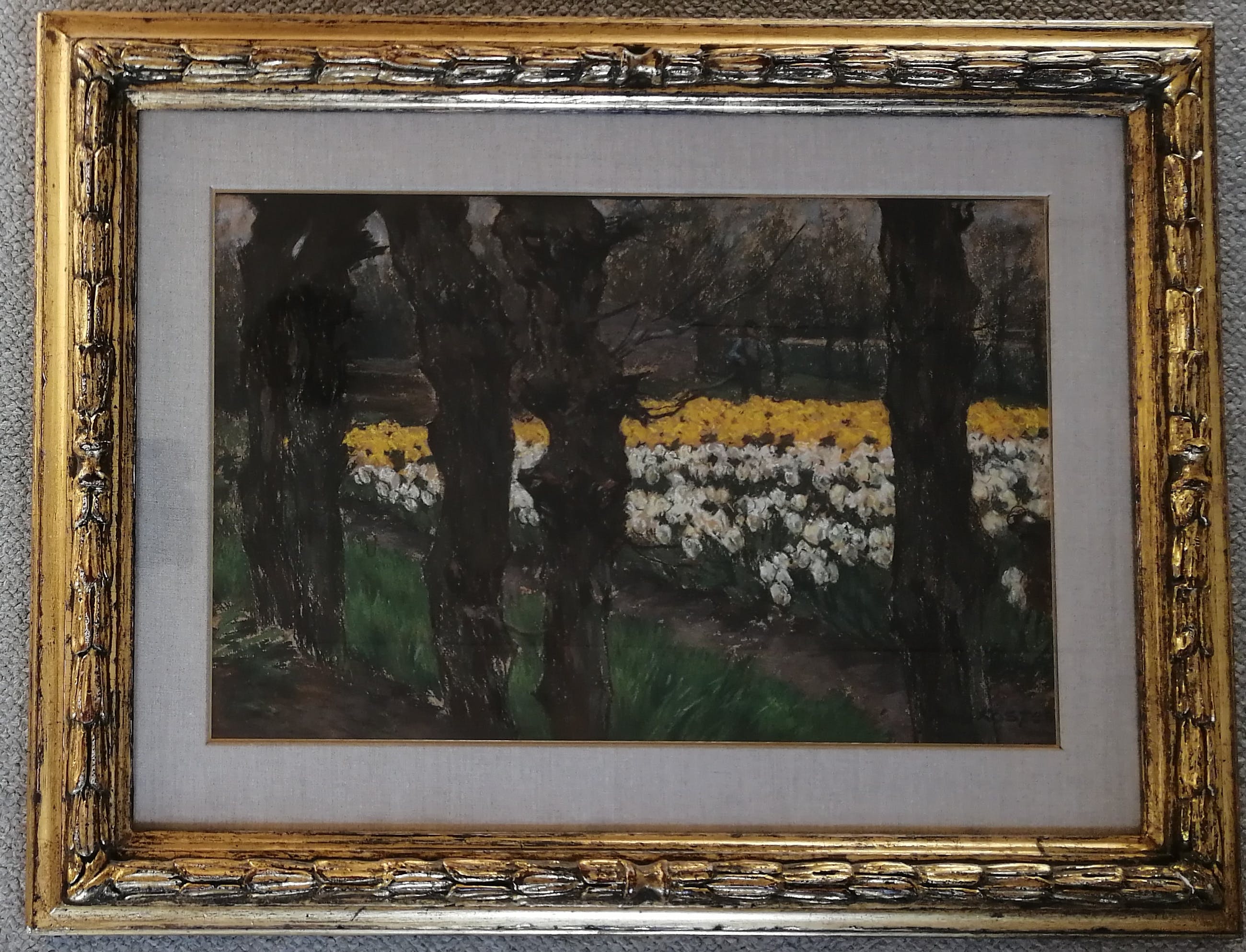Mooi werk van de bekende bloembollenvelden schilder in een fraaie inlijsting. Van deze compositie heeft A.L.Koster ook een versie in olieverf gemaakt. Gesigneerd rechtsonder. Getiteld op de achterzijde. Antonie Lodewijk Koster werd geboren te Terneuzen op 8 augustus 1859 en overleed te Haarlem op 28 mei 1937. Opleiding aan de Academie voor Beeldende Kunst te Den Haag. Leerling van Willem Mesdag en Philippe Zilcken. Verkreeg in 1916 de Koninklijke Medaille. Lid van Pulchri Studio, Arti et Amicitiae, de Nederlandse Etsclub en Kunst Zij Ons Doel te Haarlem waarvan hij ook bestuurslid was. Woonde en werkte aan de Koediefslaan te Heemstede.