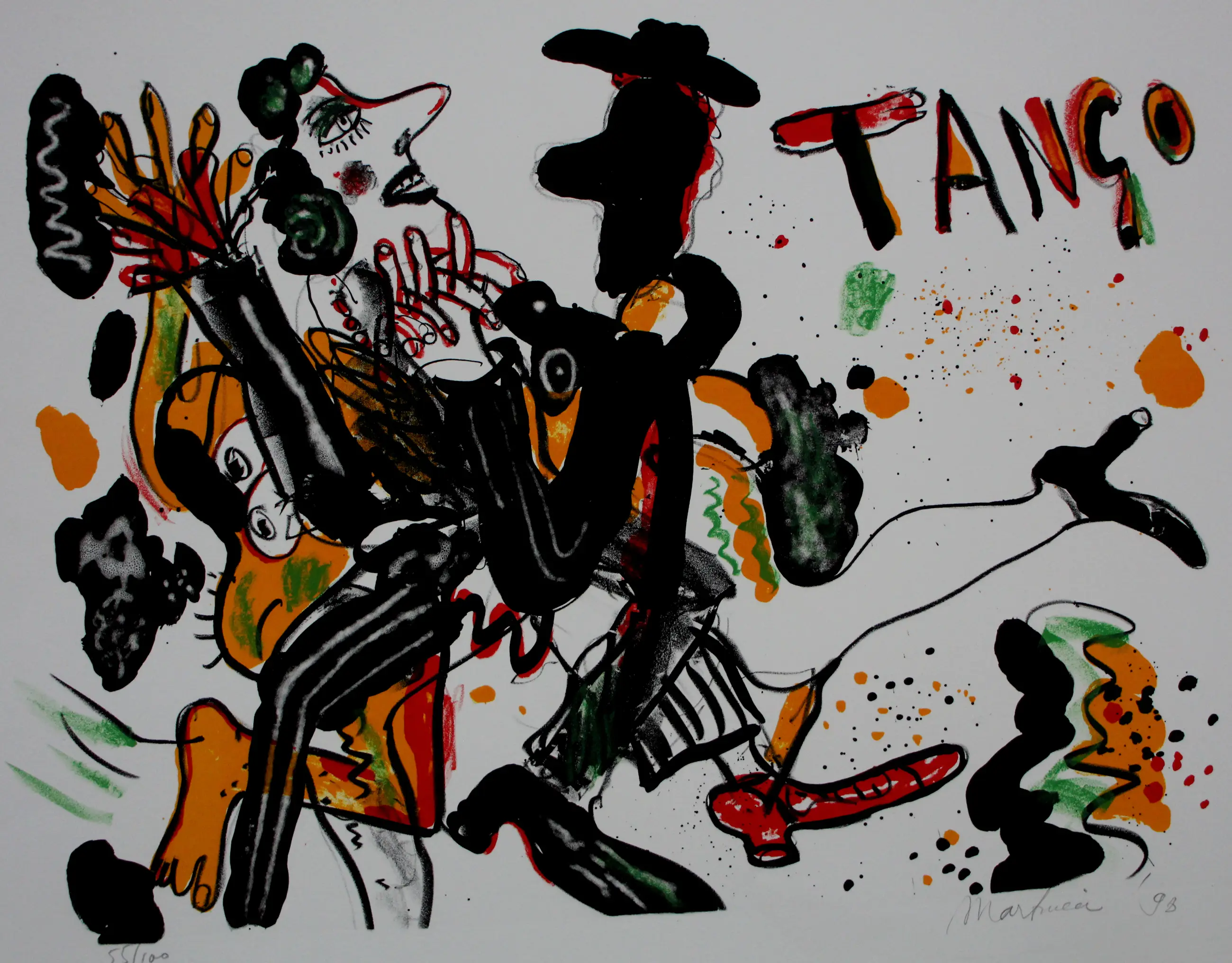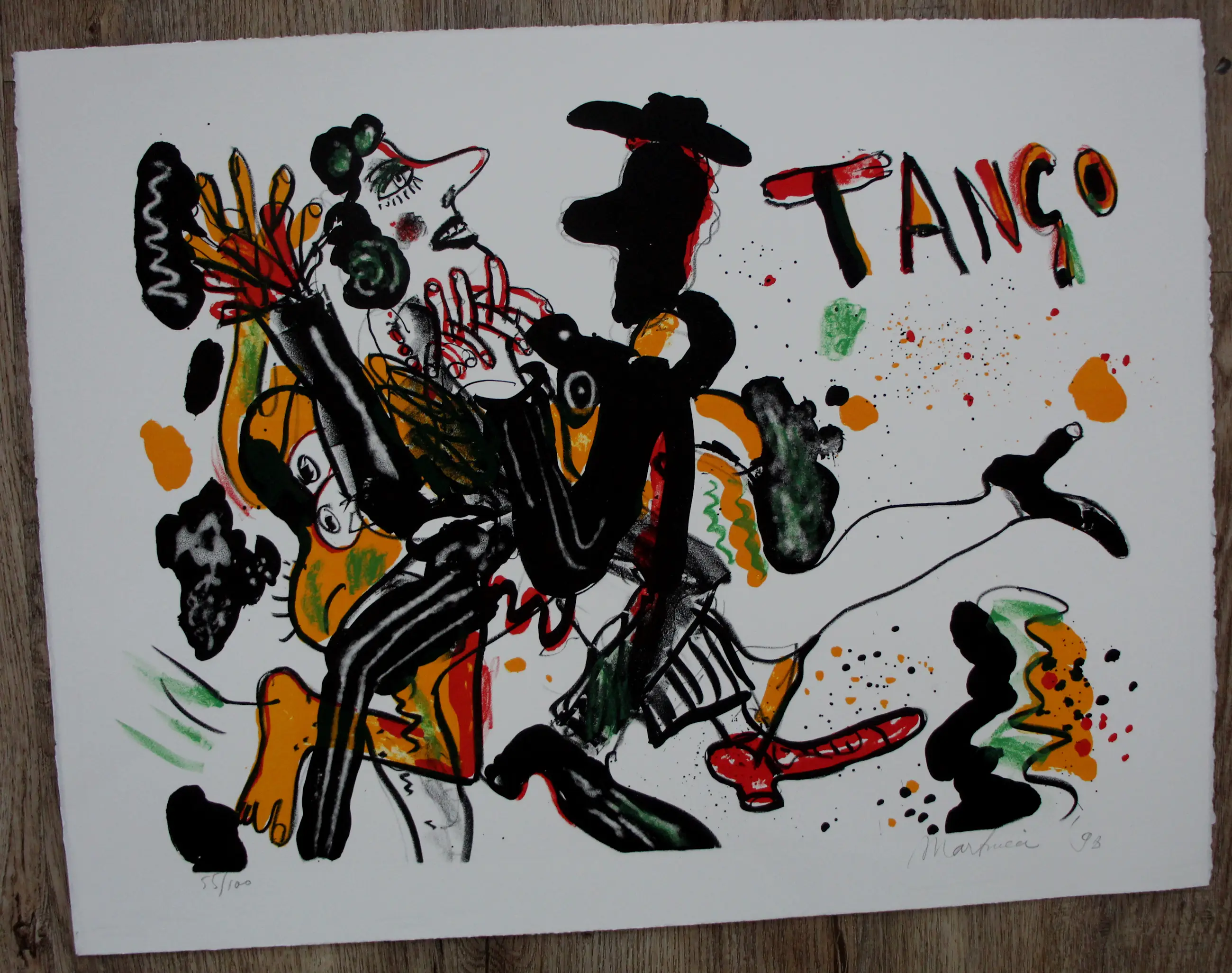 Kleurrijke litho van Anton Martineau. Titel: Tango. Nummer: 55/100. Afmetingen werk: H50.5 x b65.5cm. Afmetingen voorstelling: H42 x b57cm.