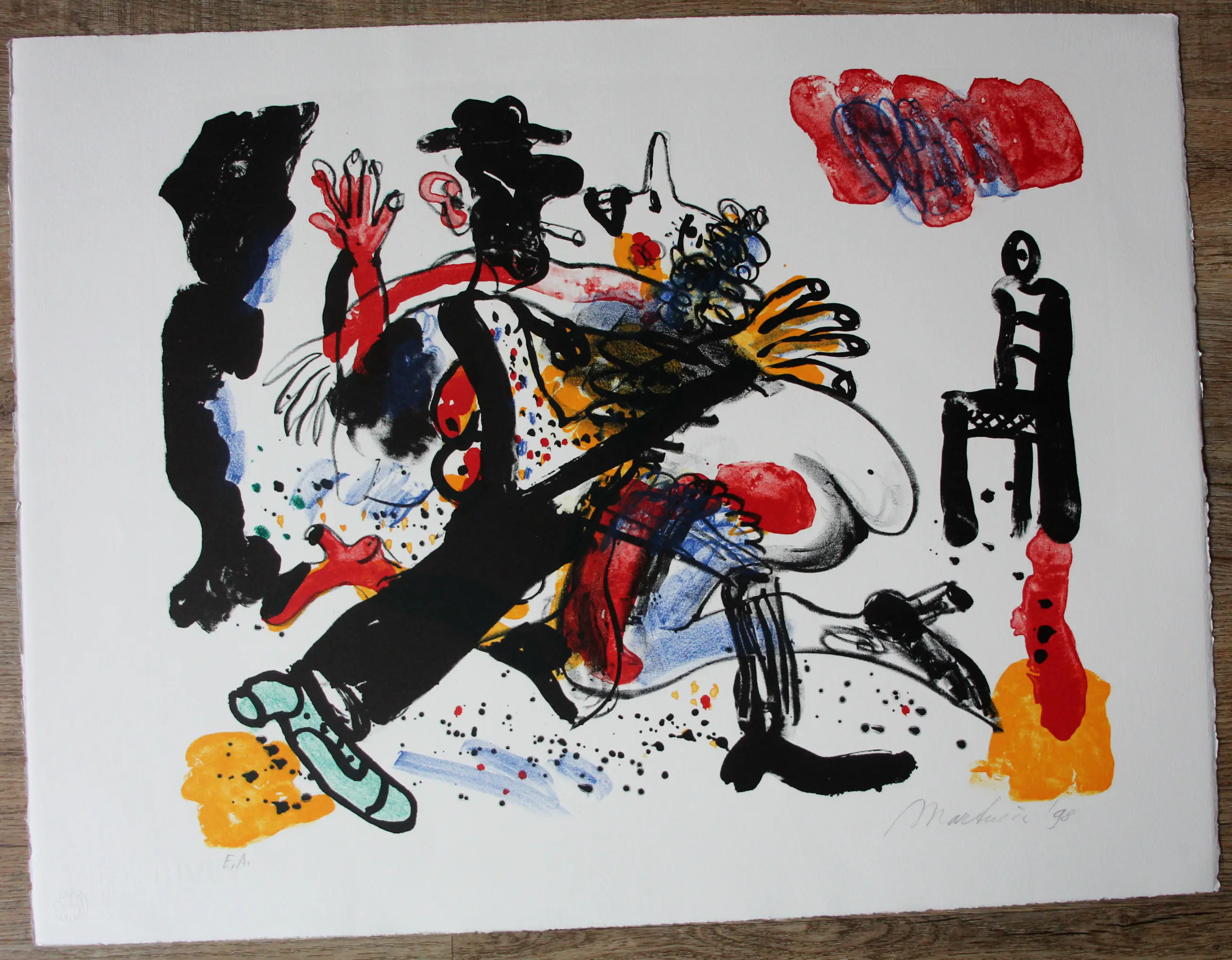Kleurrijke litho van Anton Martineau uit 1998. Titel: Tango. Nummer: E.A. Afmetingen werk: H50.5 x b65.5cm. Afmetingen voorstelling: H42 x b57cm.