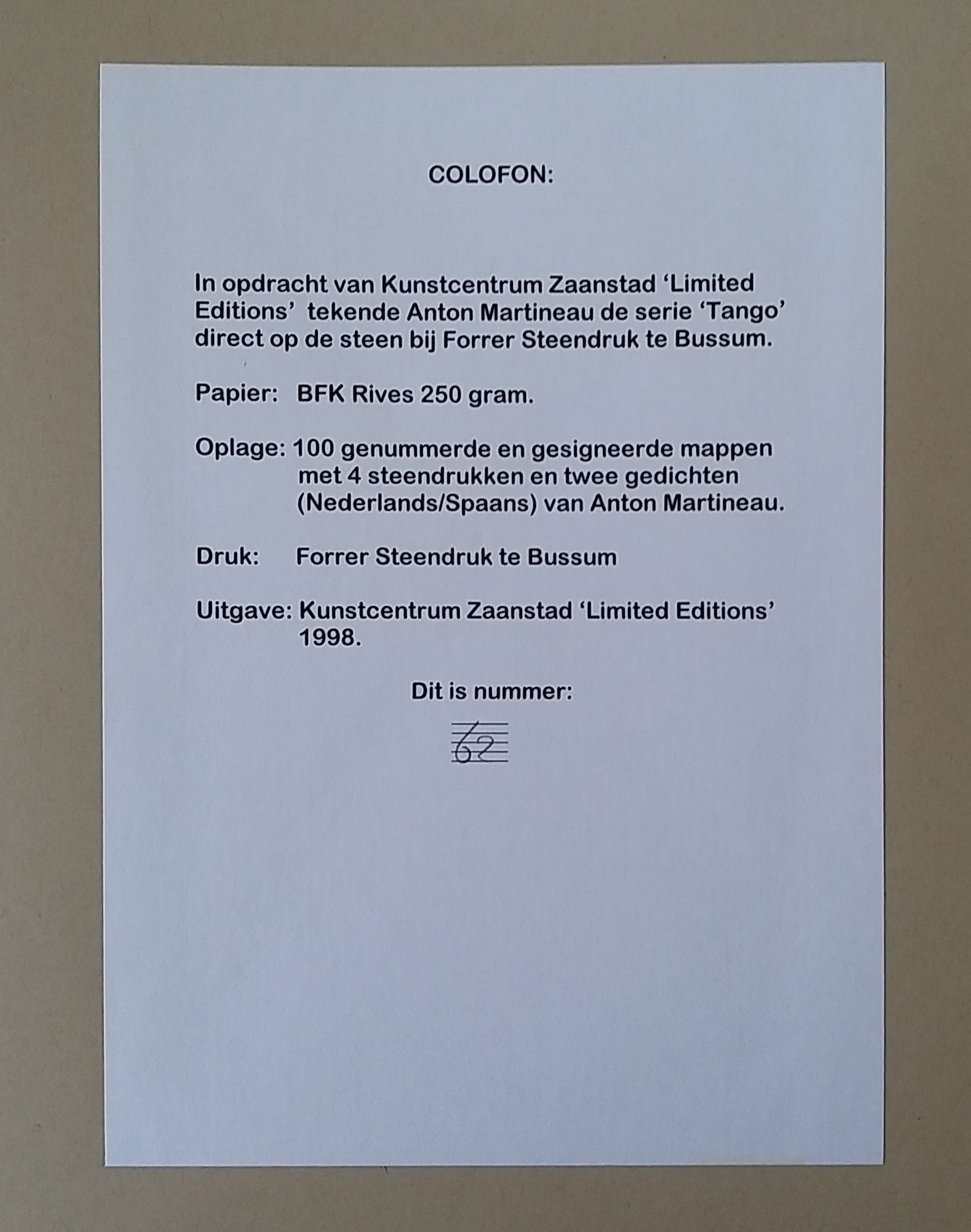 TANGO MAP inclusief 6x litho 4 x litho Tango 1x litho gedicht in Spaans en 1x litho gedicht in NL 62 van 100 GESIGNEERD EN GEDATEERD 1998