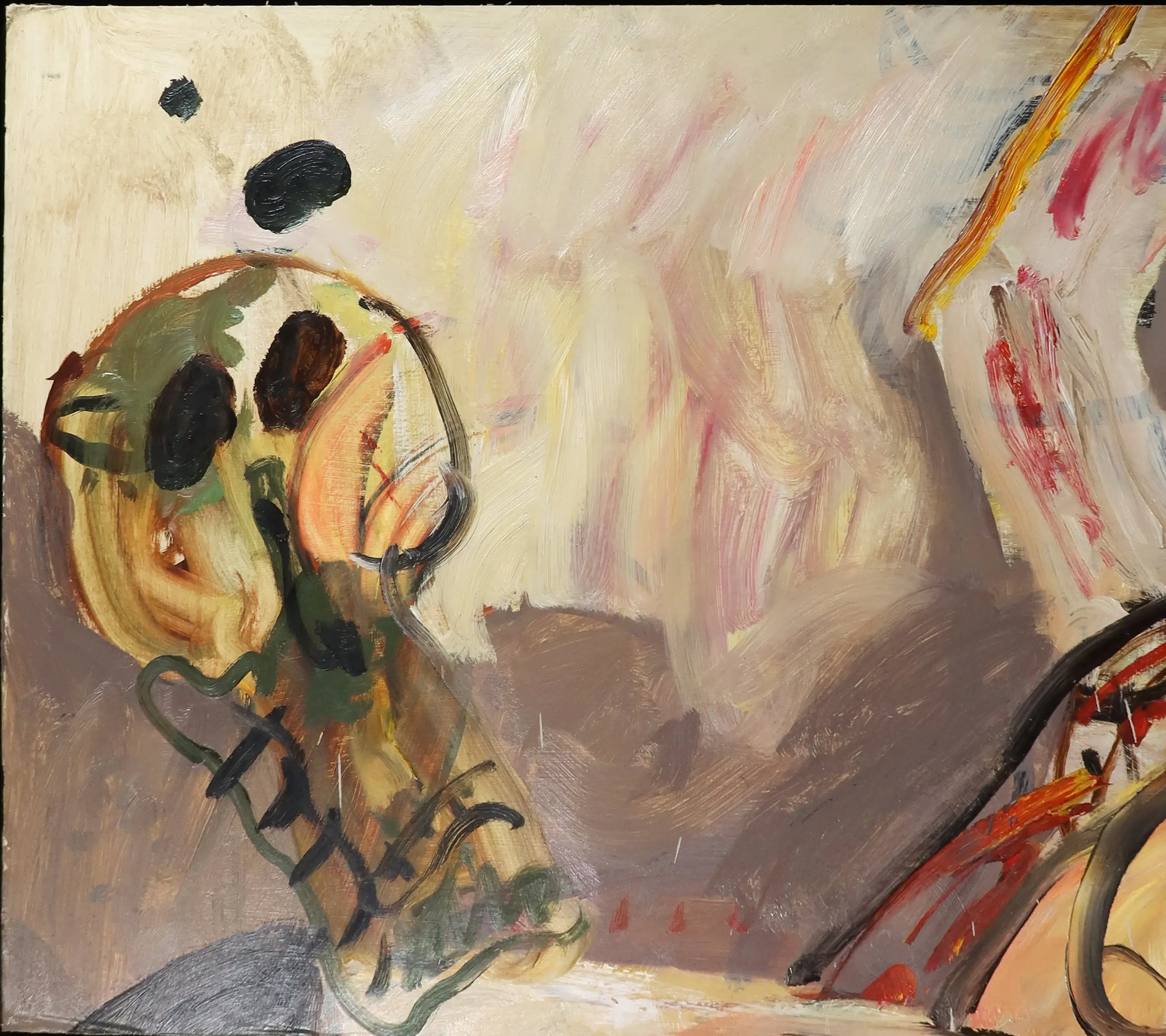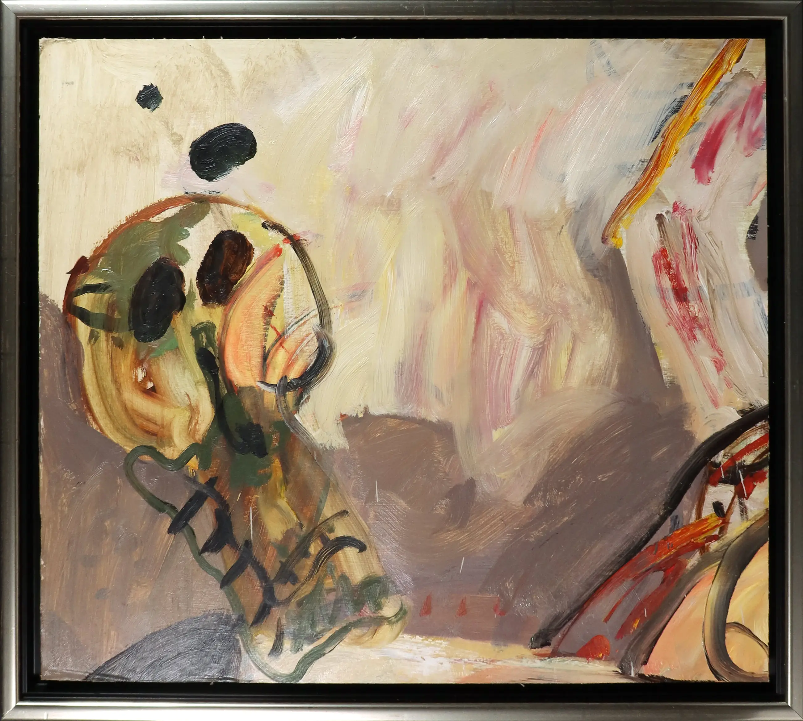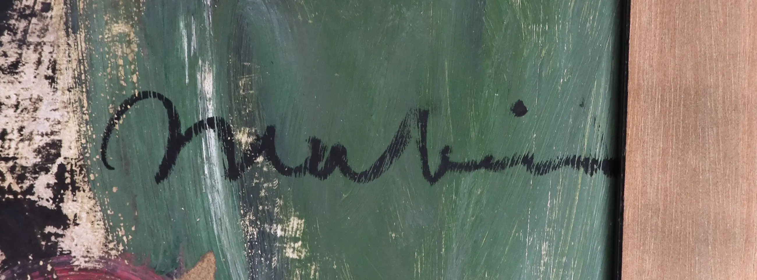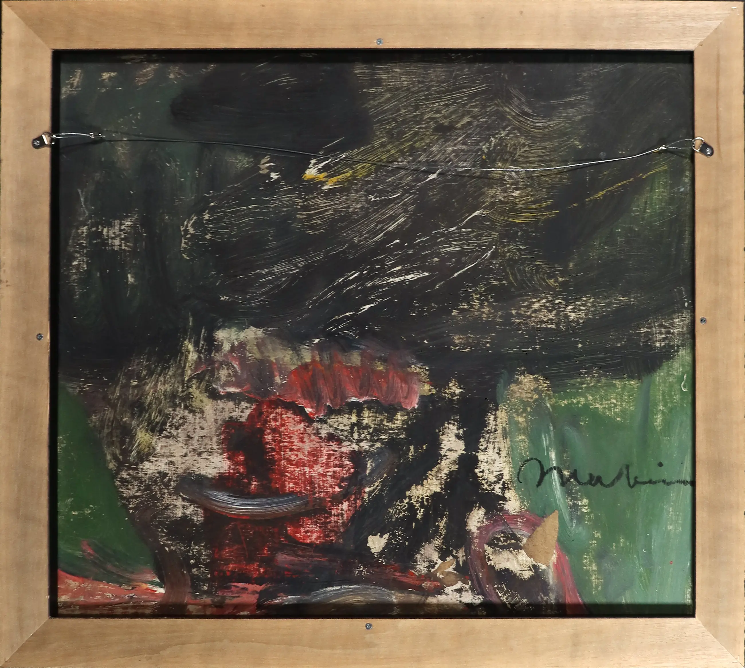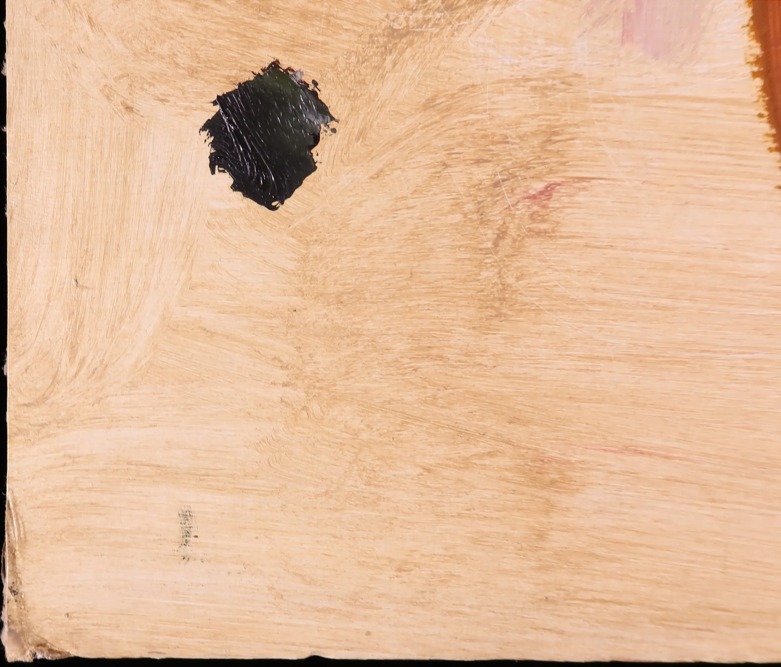 | Kleine plekjes verfverlies aan de randen en vuil hier en daar; over de onderste helft van het board zitten witte verfspetters, maar deze lijken gewoon onderdeel van de oorspronkelijke compositie te zijn. | |