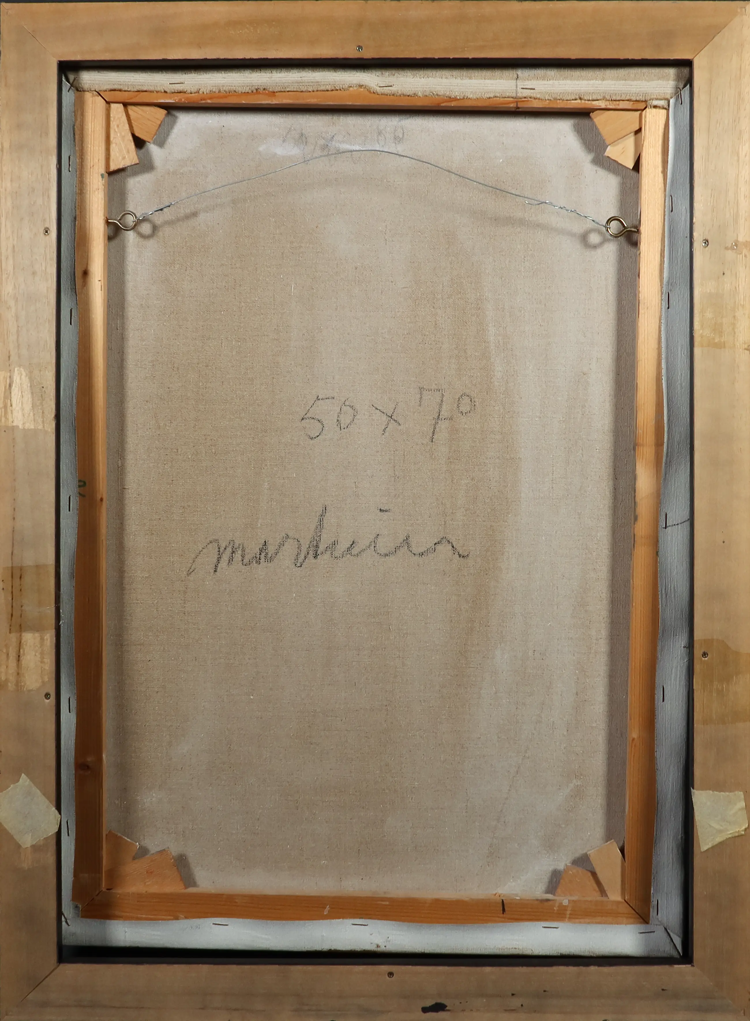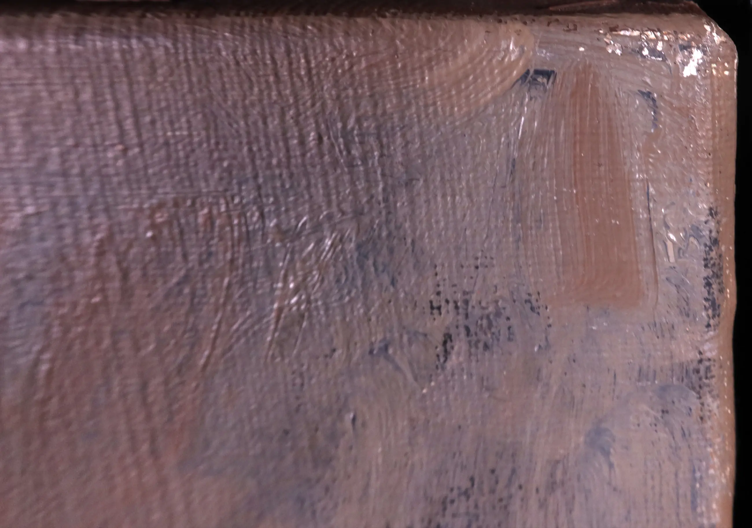 | Het doek zit niet meer (goed) bevestigd aan de lijst en kan daarom los van de lijst geleverd worden. Het doek en de lijst zijn echter in goede staat, naast milde aantastingen. | |