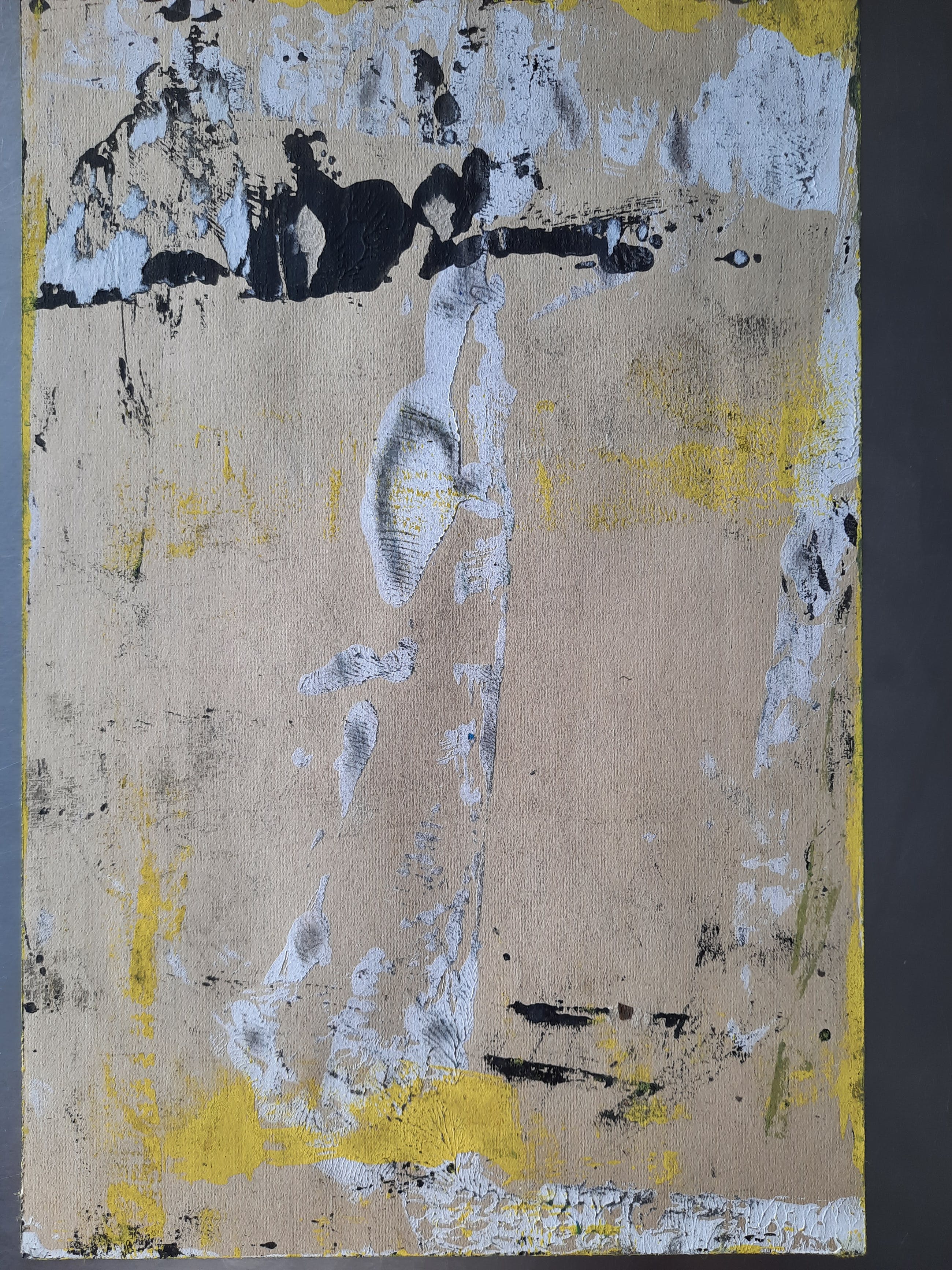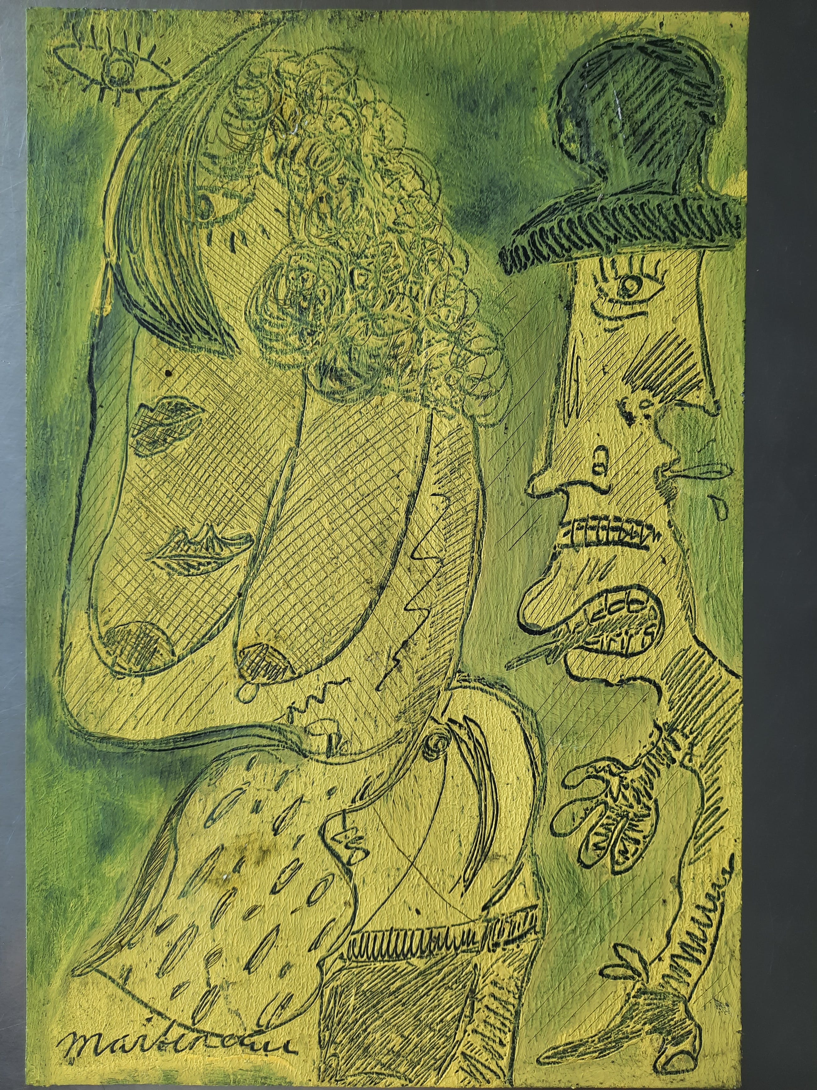 Door een bovenlaag van geel/groene verf is de tekening ingetekend. De lijnen worden zichtbaar door de donkere achtergrond. Een typisch beeld van Anton Martineau.