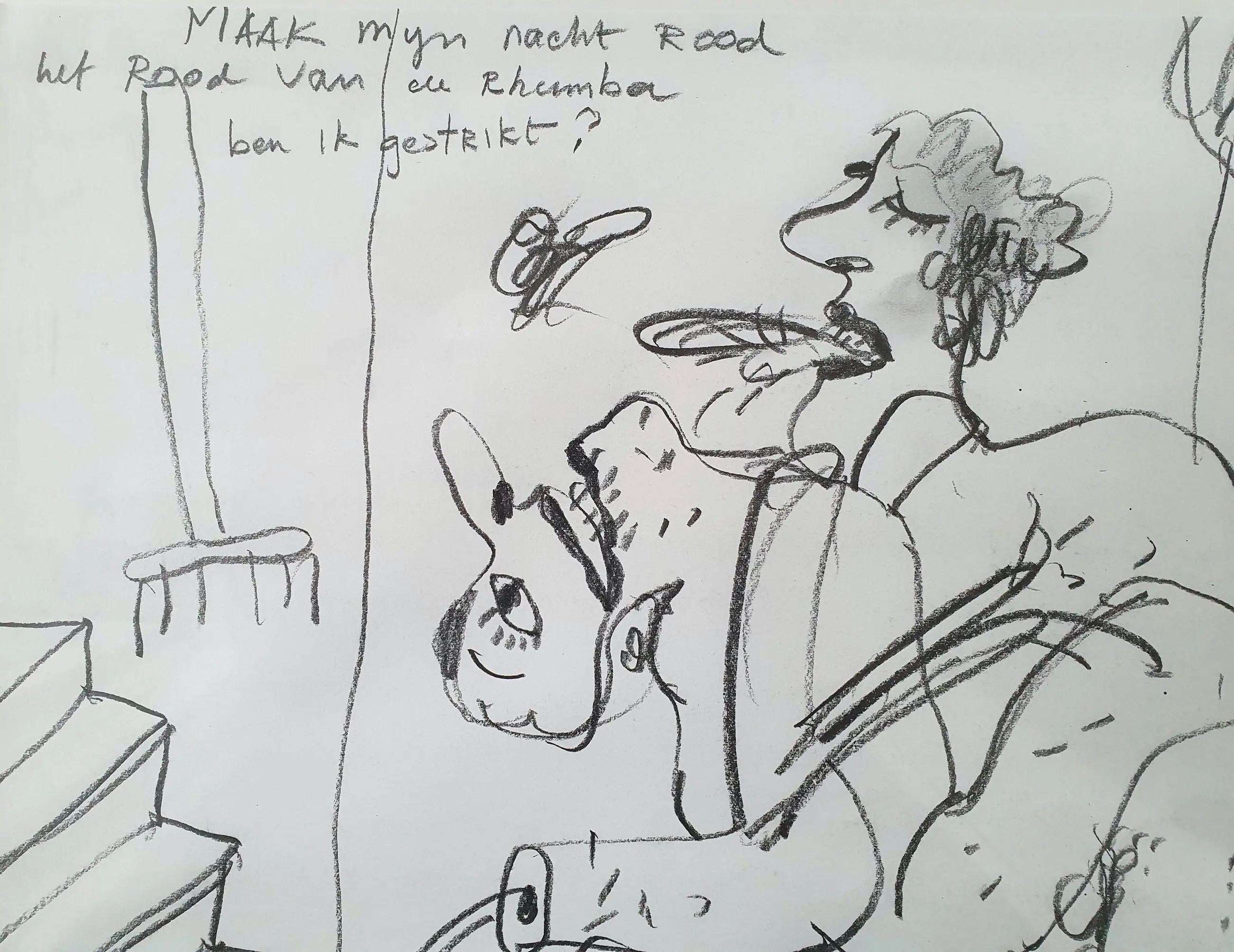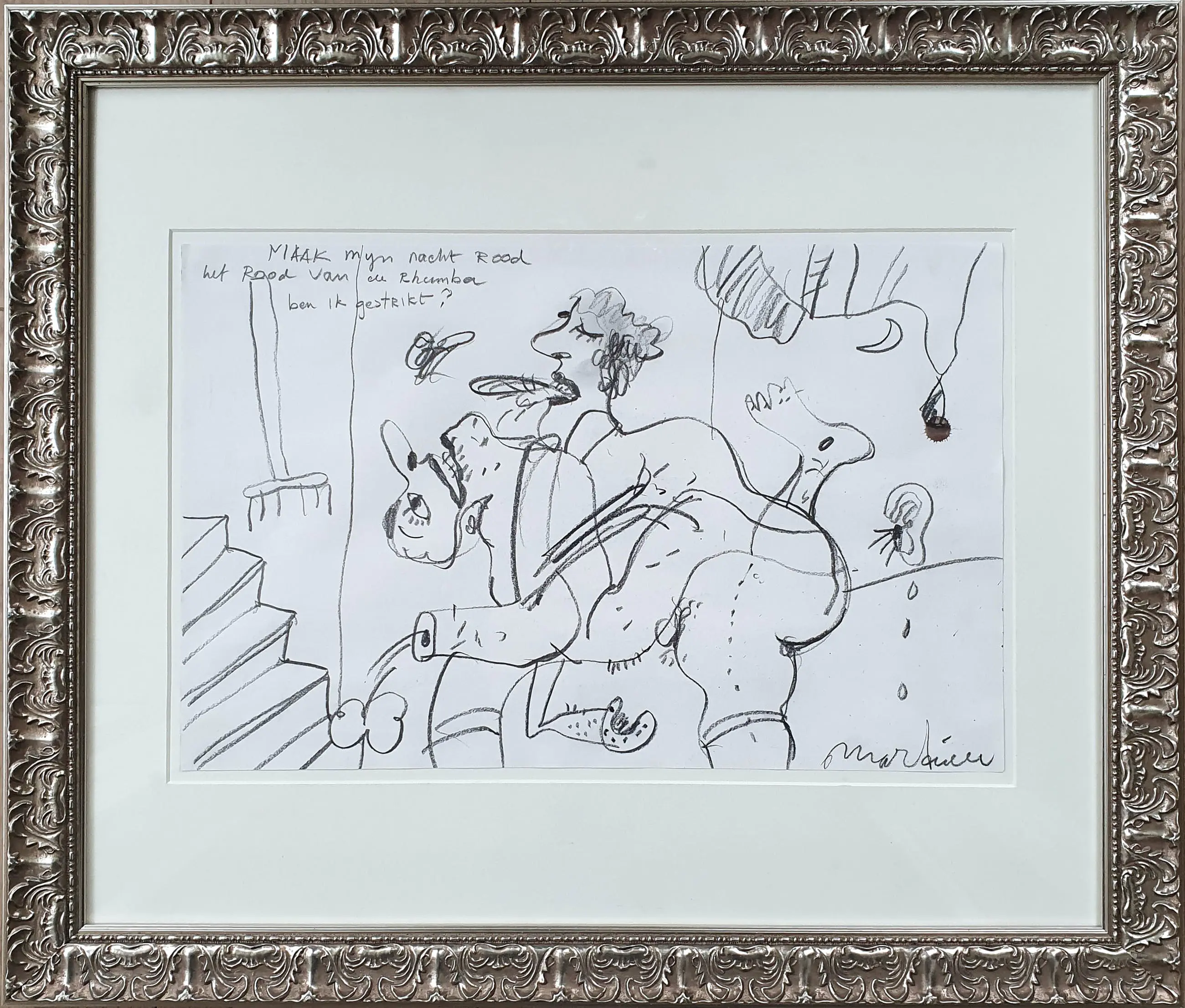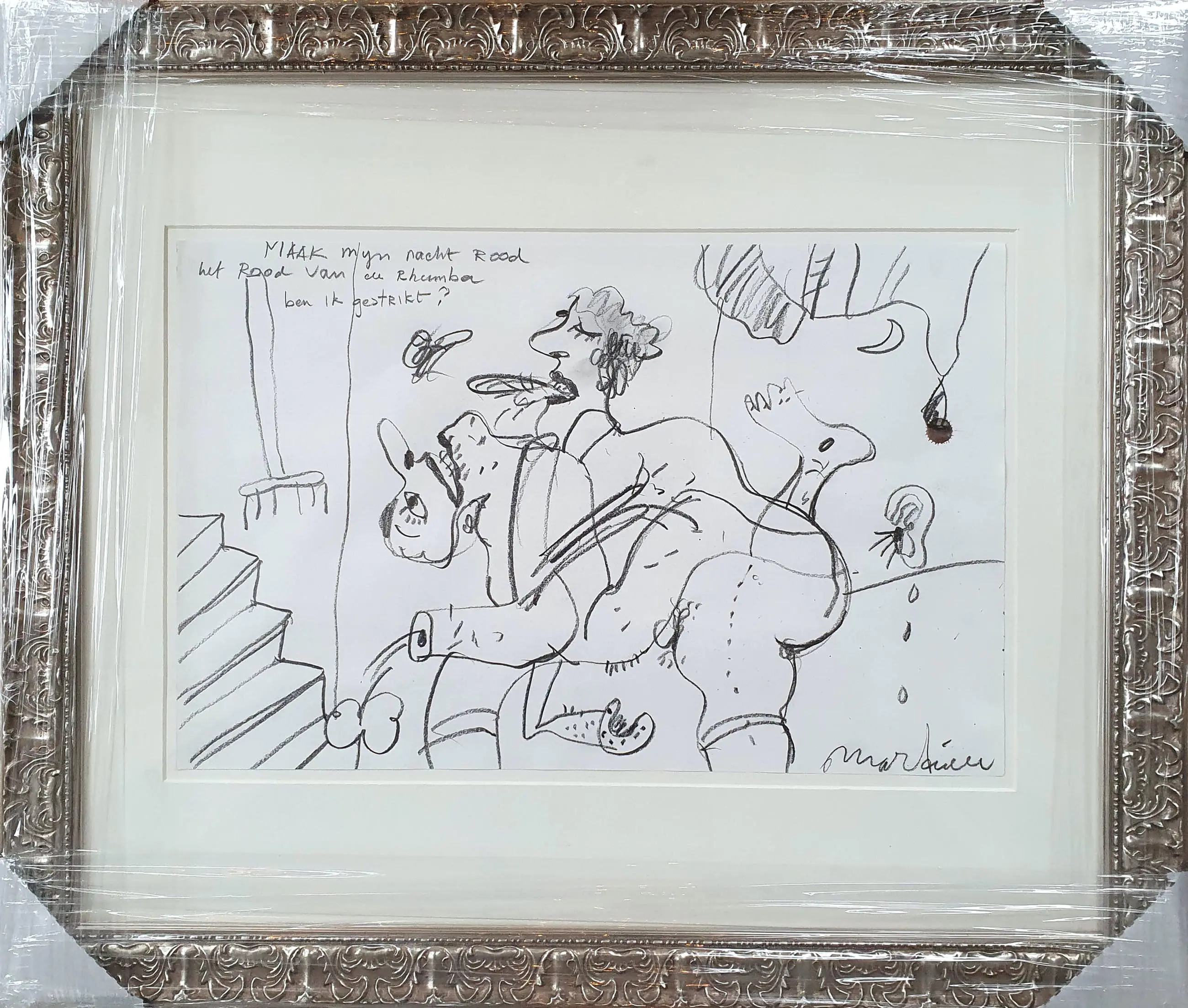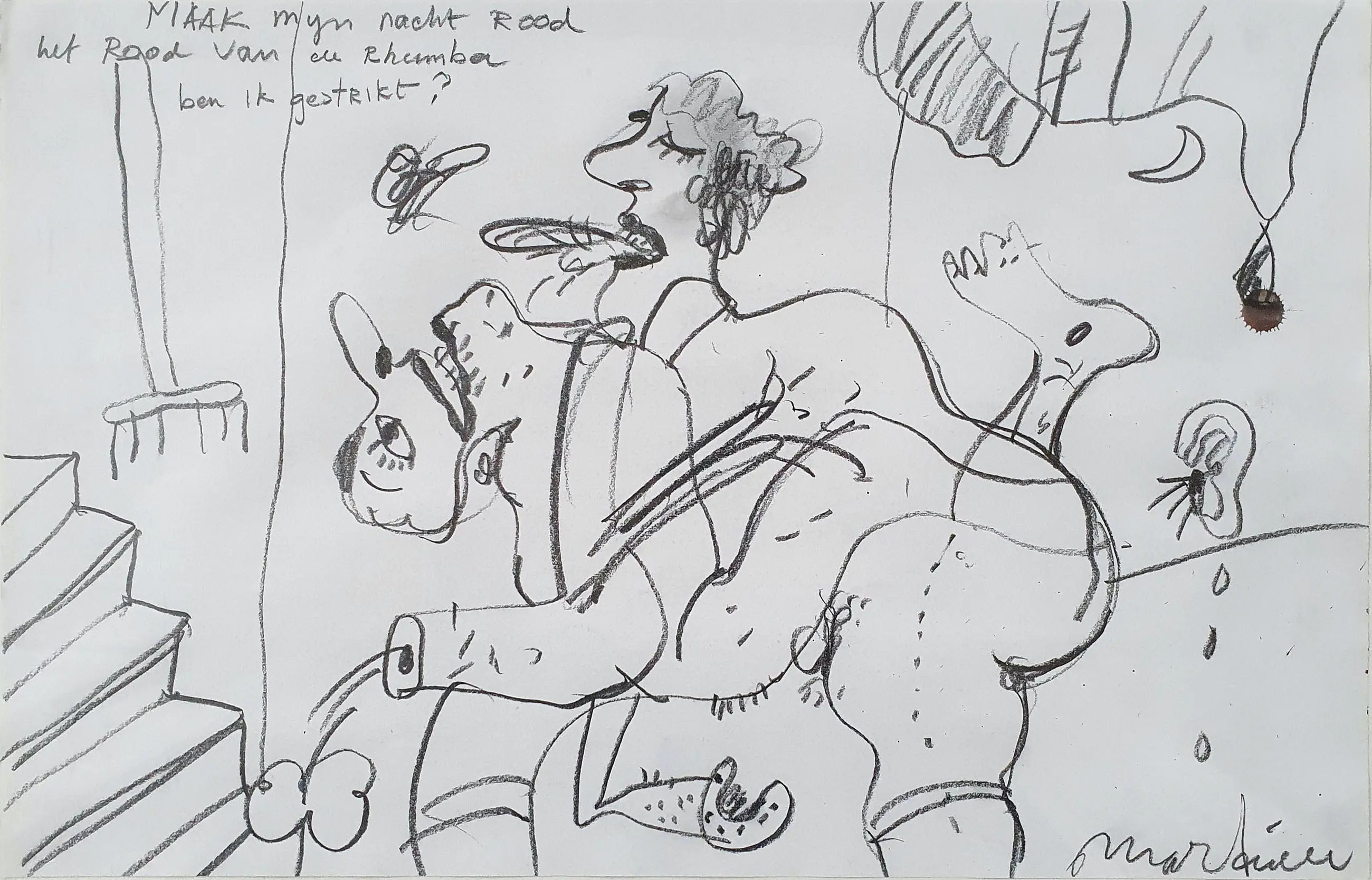 Tekening van Anton Martineau met de titel: 'Maak mijn nacht rood'. Het werk is rechtsonder met de hand gesigneerd door de kunstenaar.