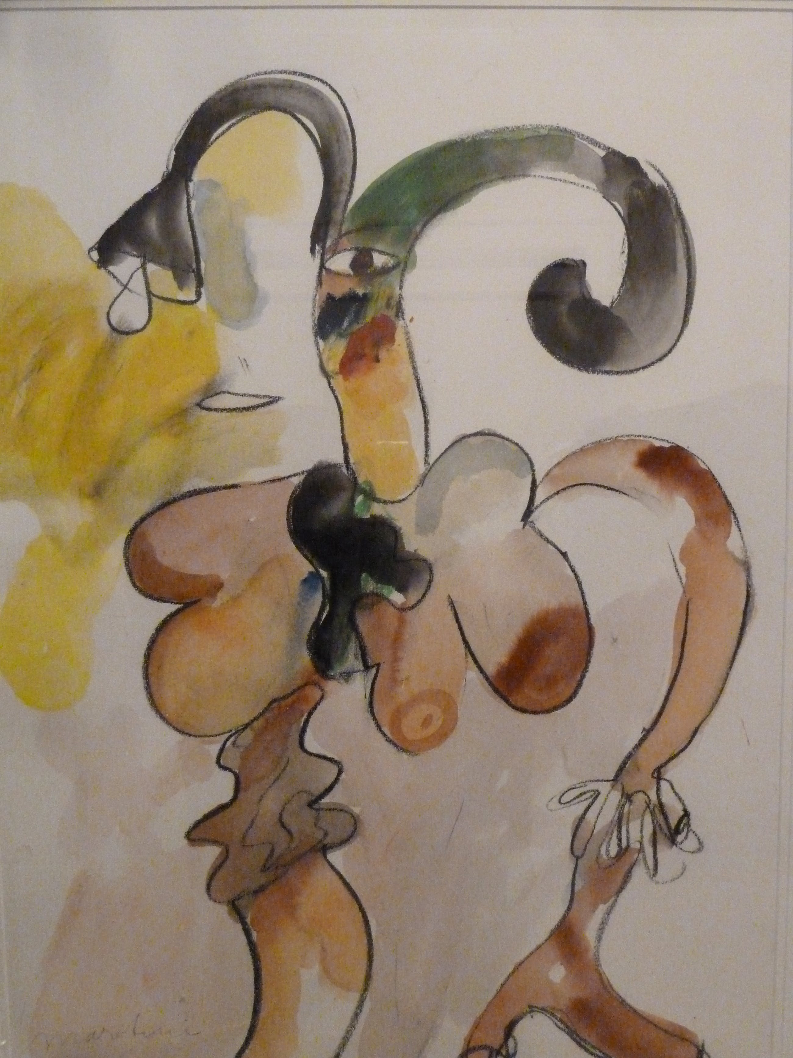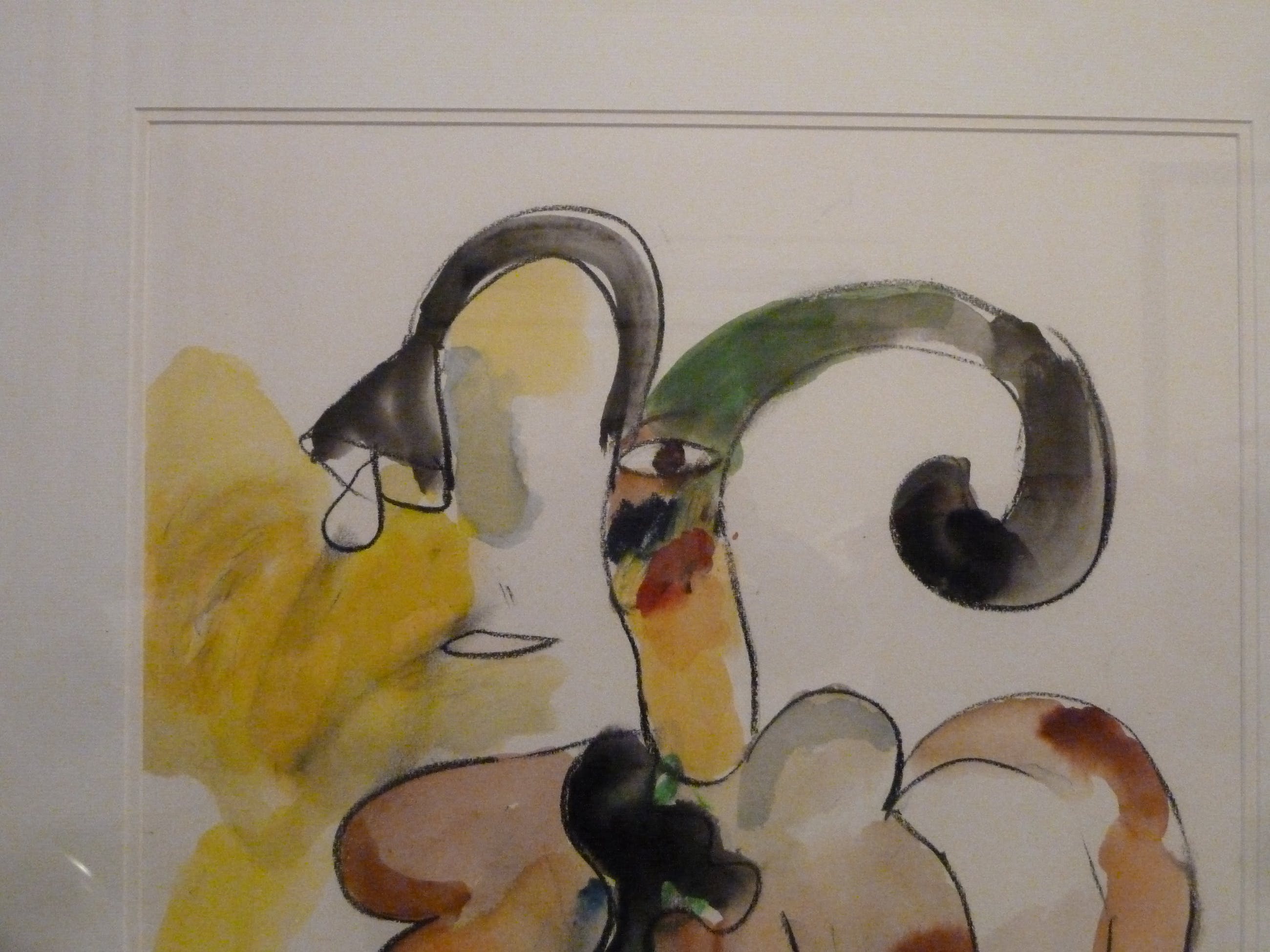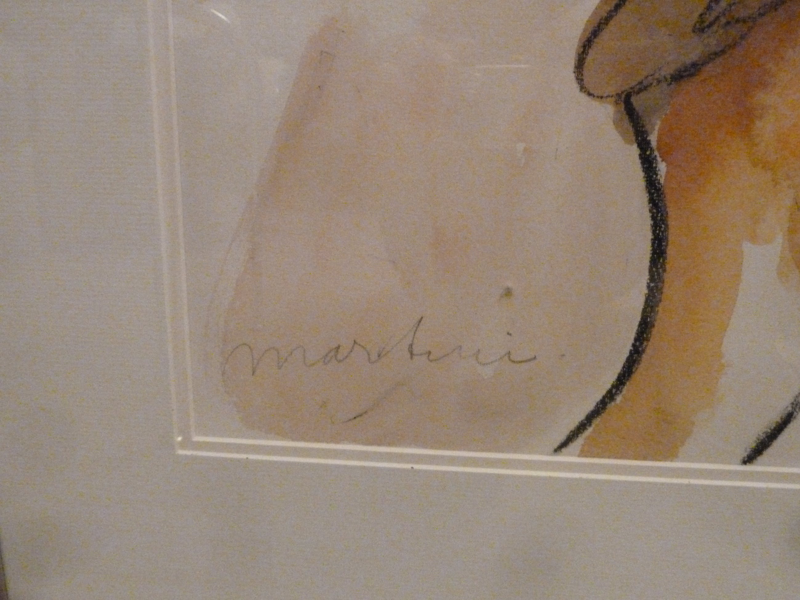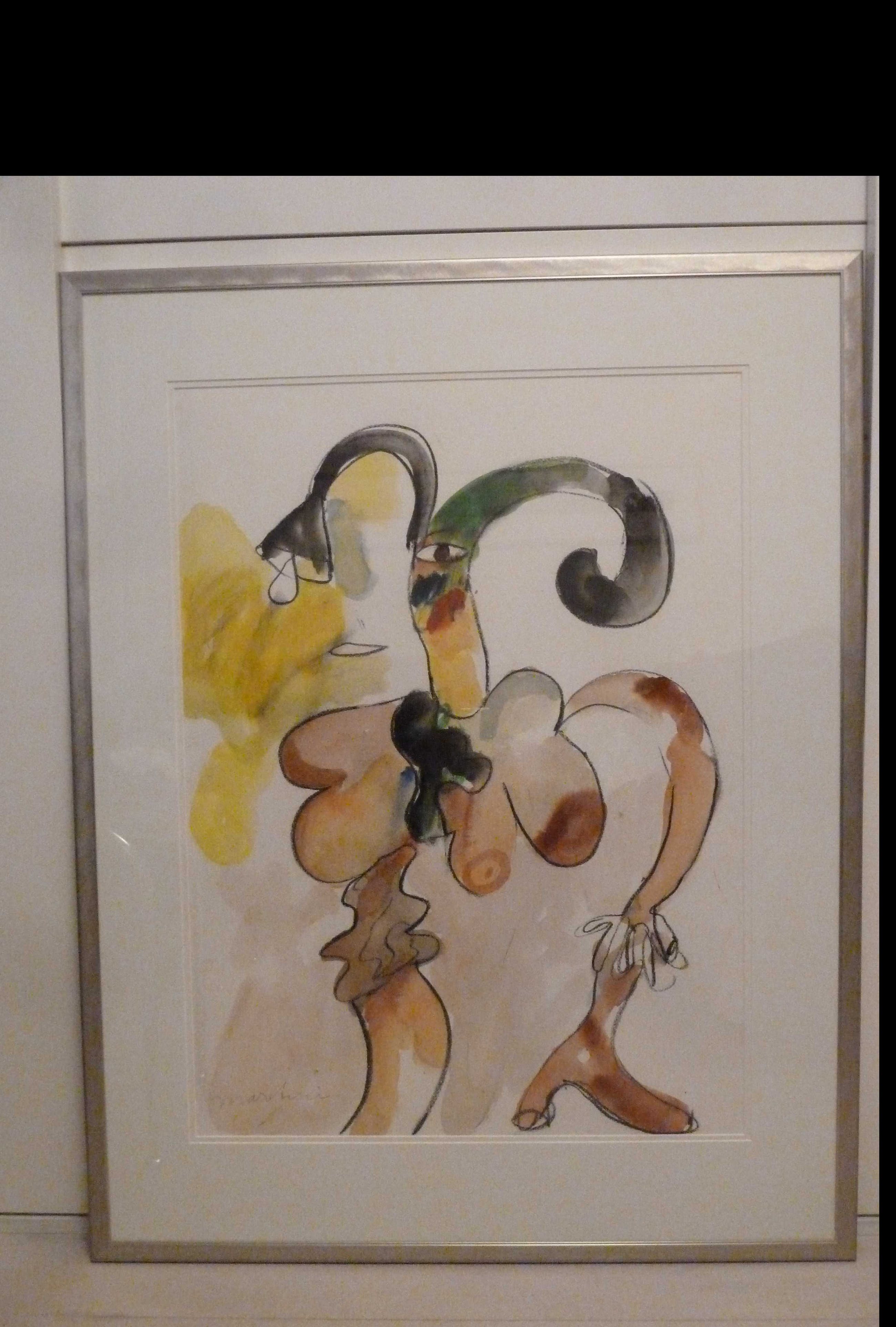 Kleurrijk werk met uitbundige vrouw als onderwerp. Typische Martineau die op een manier a la Cobra zijn werkelijkheid laat zien. Werk is op papier: aquarel met houtskool accentueringen, waardoor beeld mooi uitkomt. Lijst is van stevig metaal, merk Nielsen.